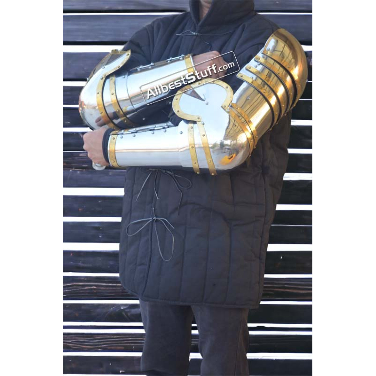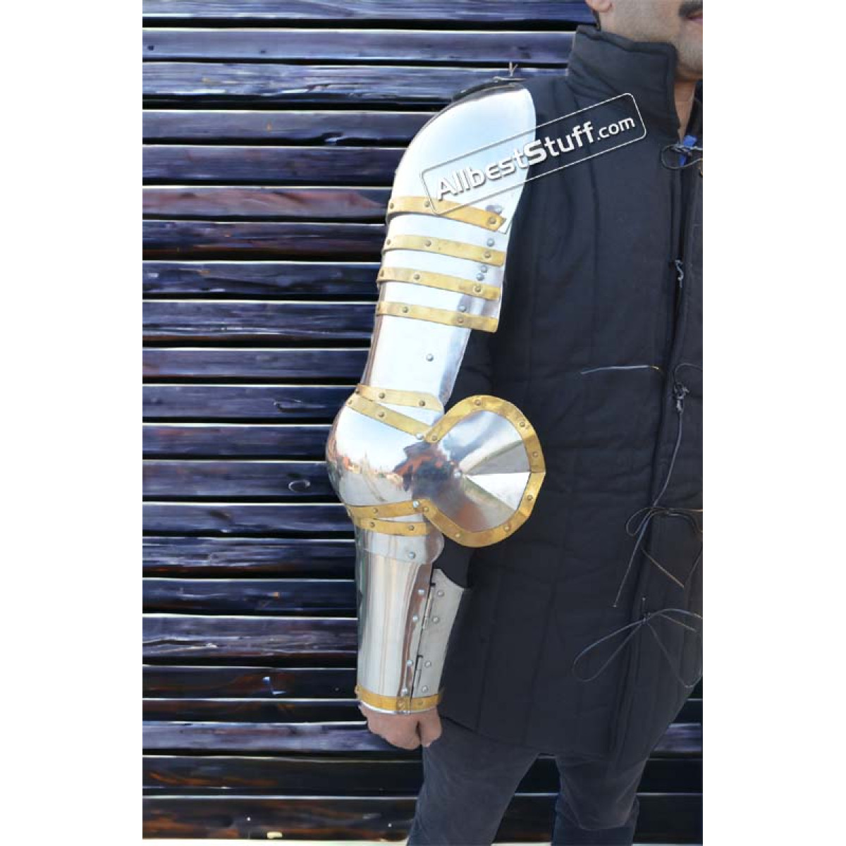 ABS Medieval This set of 15th Century Arm and Leg with brass edges Armor is constructed from plates of Satin lees steel and well-articulated to allow for very good freedom of movement. The armor is secured to the arms with adjustable brass buckles and leather straps. A large leather tab gives additional insulation from chafing to the upper arm and shoulder.