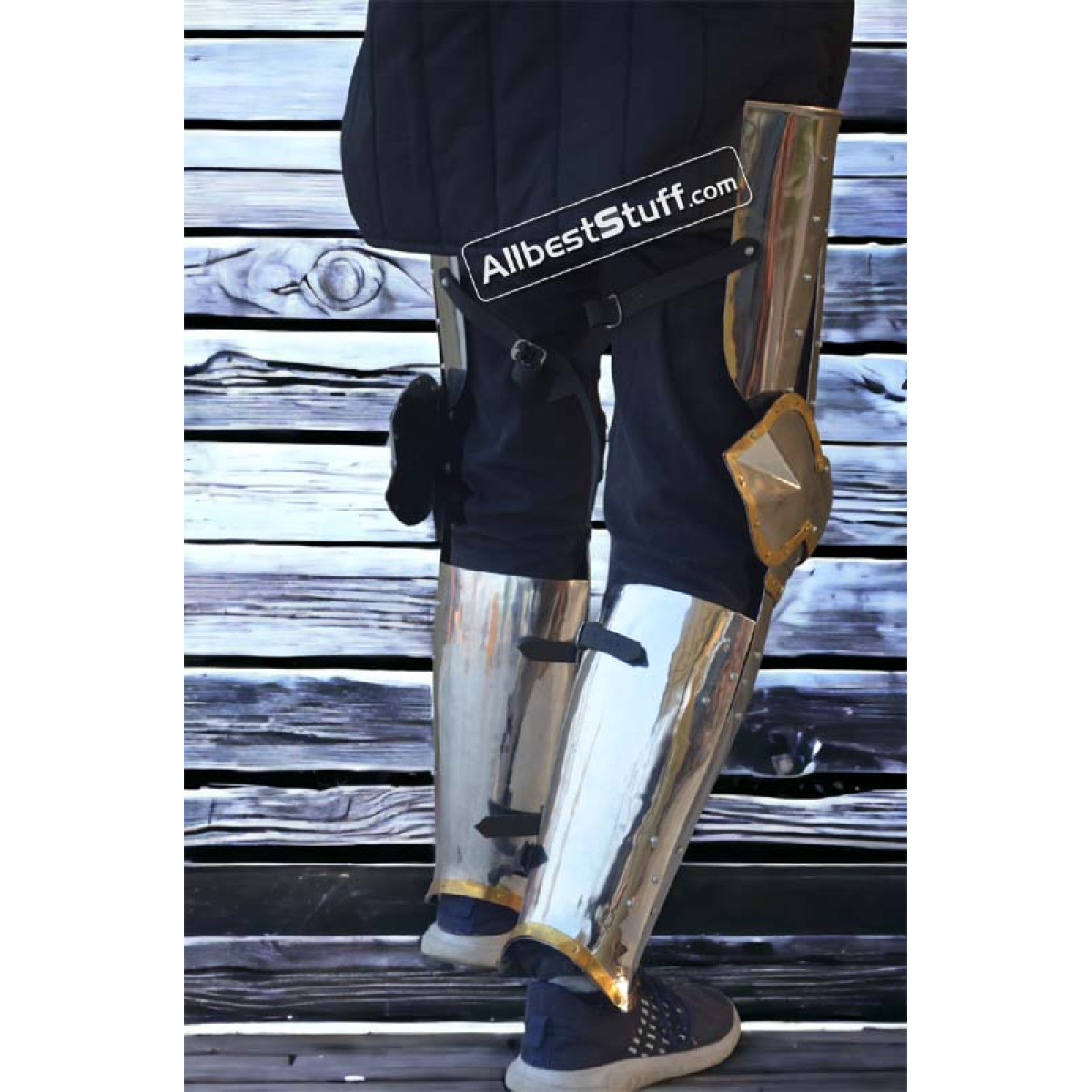 Specification:15th century Churburg Stainless Steel Arm and Leg armor with brass edgesMaterial : Stainless SteelAnkle to bottom of knee: 43 cmAnkle to middle of knee: 49 cmAnkle to top of knee: 53 cm Ankle to Hip: 94. 5 cm Ankle to Inseam: 77 cmFully ArticulatedLeather Strapsbrass edges