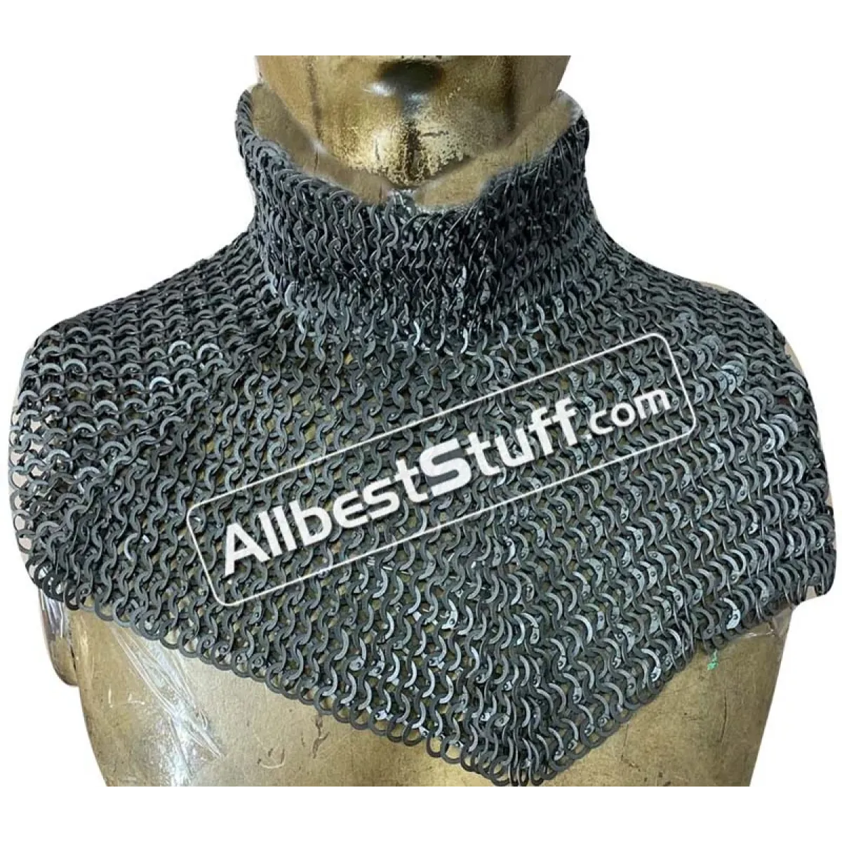 Medieval Stylish Chain Mail Collar with high neck. this piece still uses the same quality materials and finishing techniques to create a refined piece of armor. All of the mail rings on this standard are made from steel, We have used the standard mail ring pattern of 4:1 for the largest part of the collar, maille standards would have a tighter weave around the actual neck part, we’ve used a 6:1 weave on the neck, which looks excellent and provides a bit of extra protection due to the denser pattern of rings.