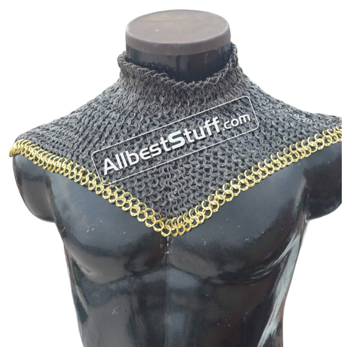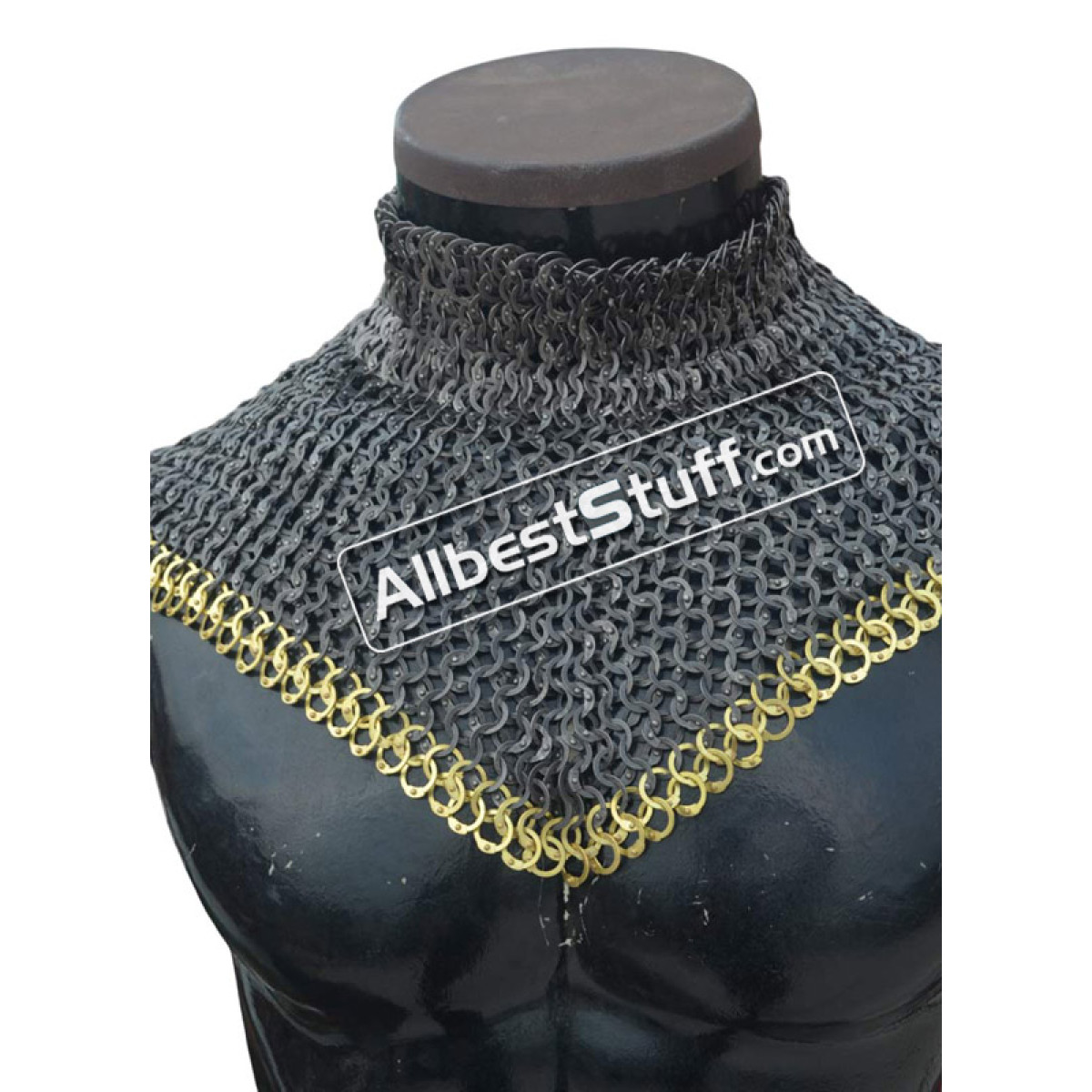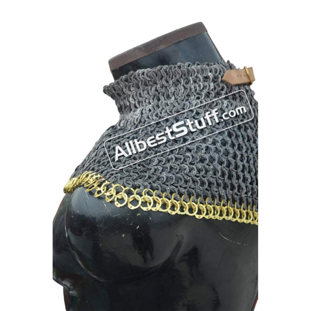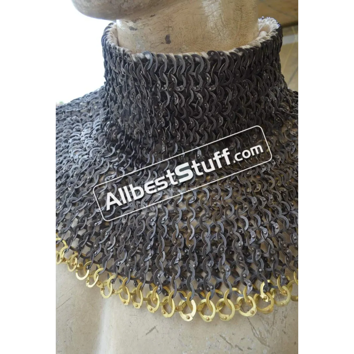 Medieval Stylish Chain Mail Collar with high neck. this piece still uses the same quality materials and finishing techniques to create a refined piece of armor. All of the mail rings on this standard are made from Stainless steel, We have used the standard mail ring pattern of 4:1 for the largest part of the collar, maille standards would have a tighter weave around the actual neck part, we’ve used a 6:1 weave on the neck, which looks excellent and provides a bit of extra protection due to the denser pattern of rings.