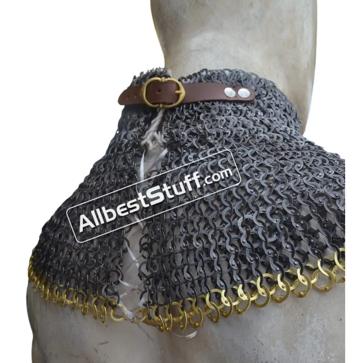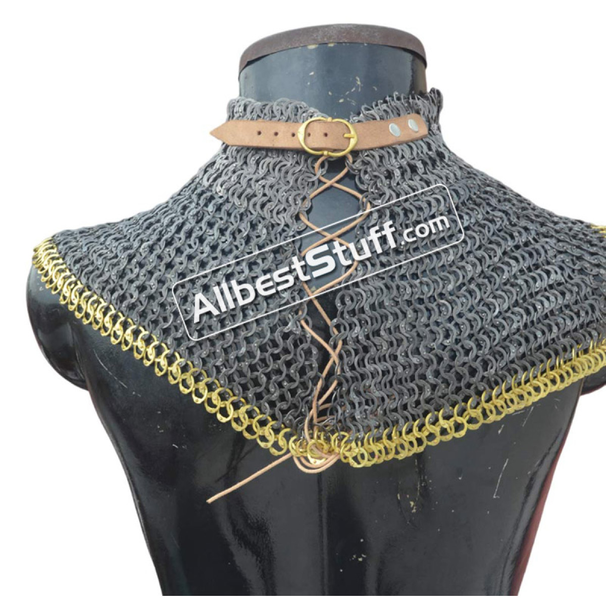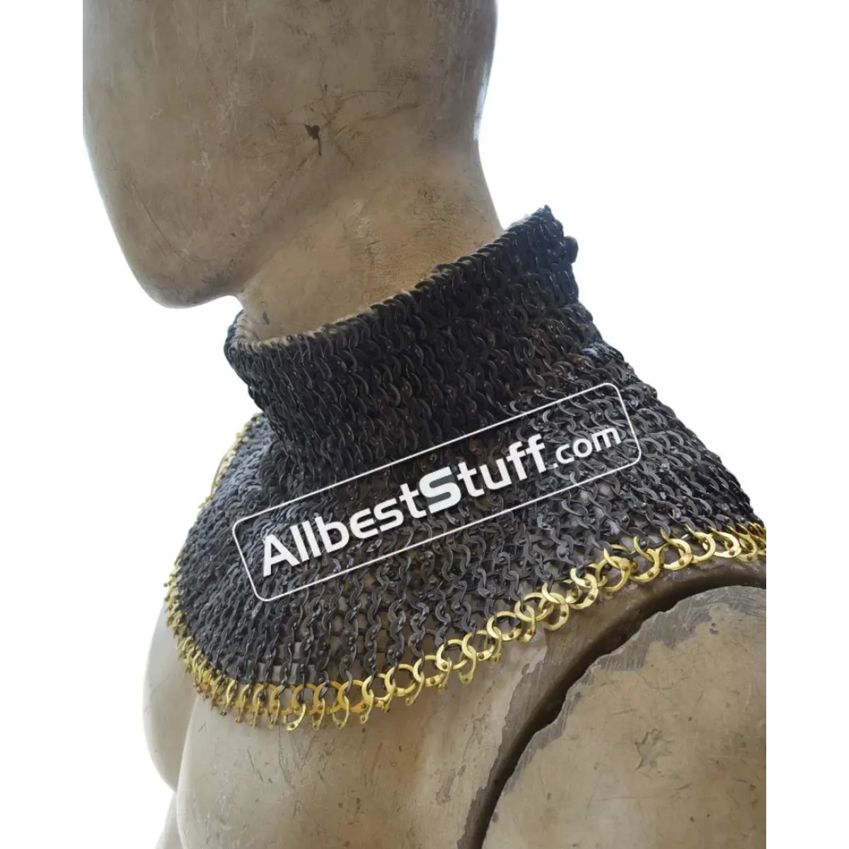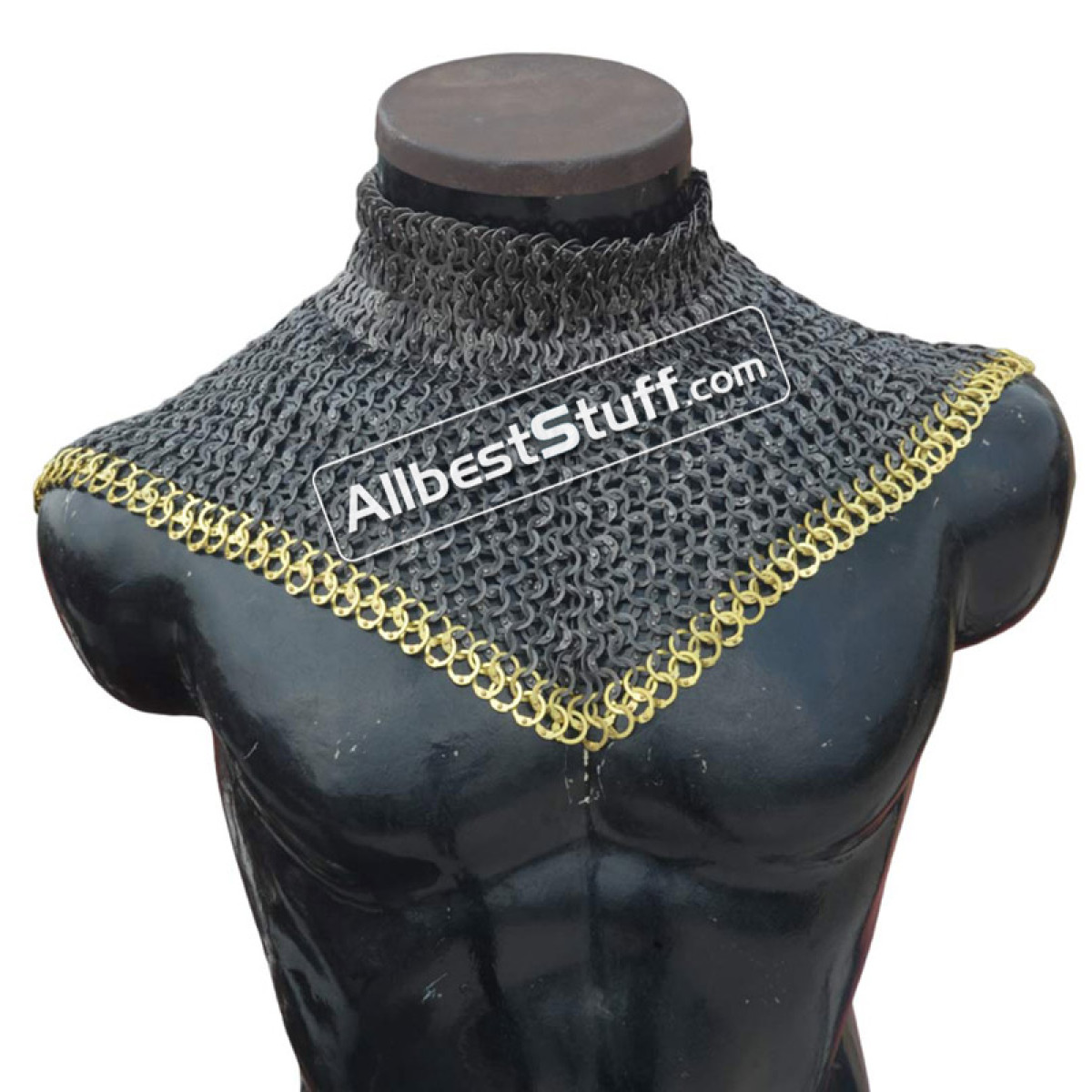 Medieval Stylish Chain Mail Collar with high neck. this piece still uses the same quality materials and finishing techniques to create a refined piece of armor. All of the mail rings on this standard are made from Stainless steel, We have used the standard mail ring pattern of 4:1 for the largest part of the collar, maille standards would have a tighter weave around the actual neck part, we’ve used a 6:1 weave on the neck, which looks excellent and provides a bit of extra protection due to the denser pattern of rings.
