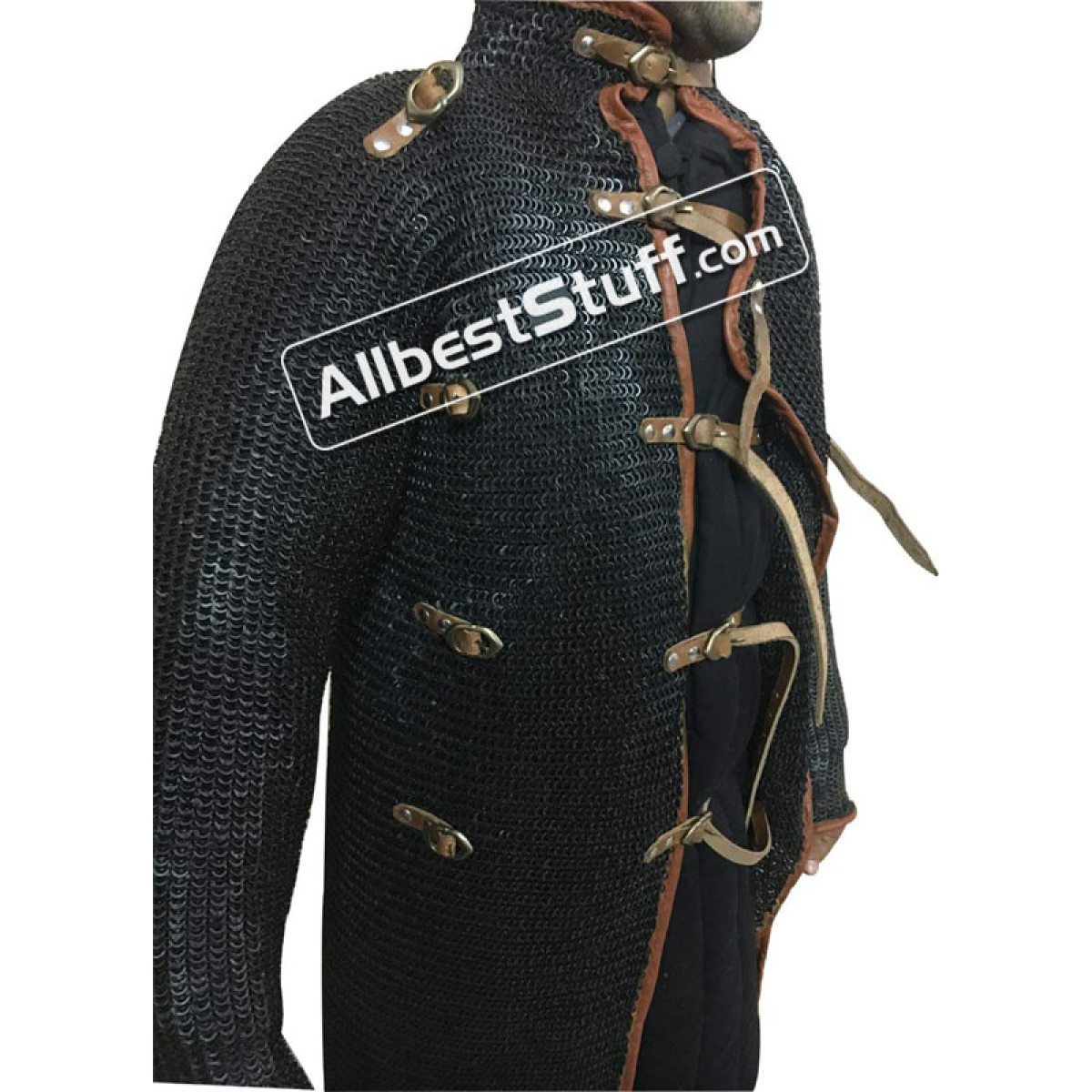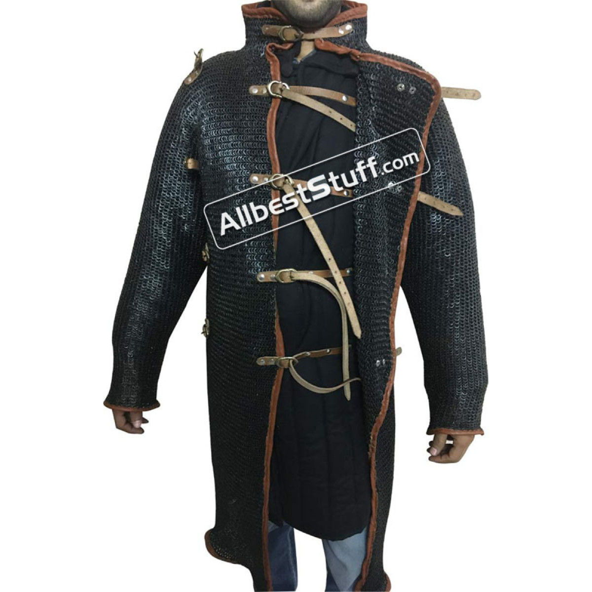 Note: We are also offering gambeson underneath (optional) to tie inner fasteners for support as a additional product in this listing. You can add it to cart along with the maille shirt. We are offering 2 finish for this product. Please note if you choose "White Color" gambeson along with this product there will be grater chances of oil marks as both finish on the maille has some amount of oil. Gambeson full sleeve, Chest Circumference: 48 inches, Sleeve Length from Armpit 20 inches, Length from Shoulder 38 inches Note: Additional 4 leather straps on left side to support chain mail inner portion. (see listing photographs) .