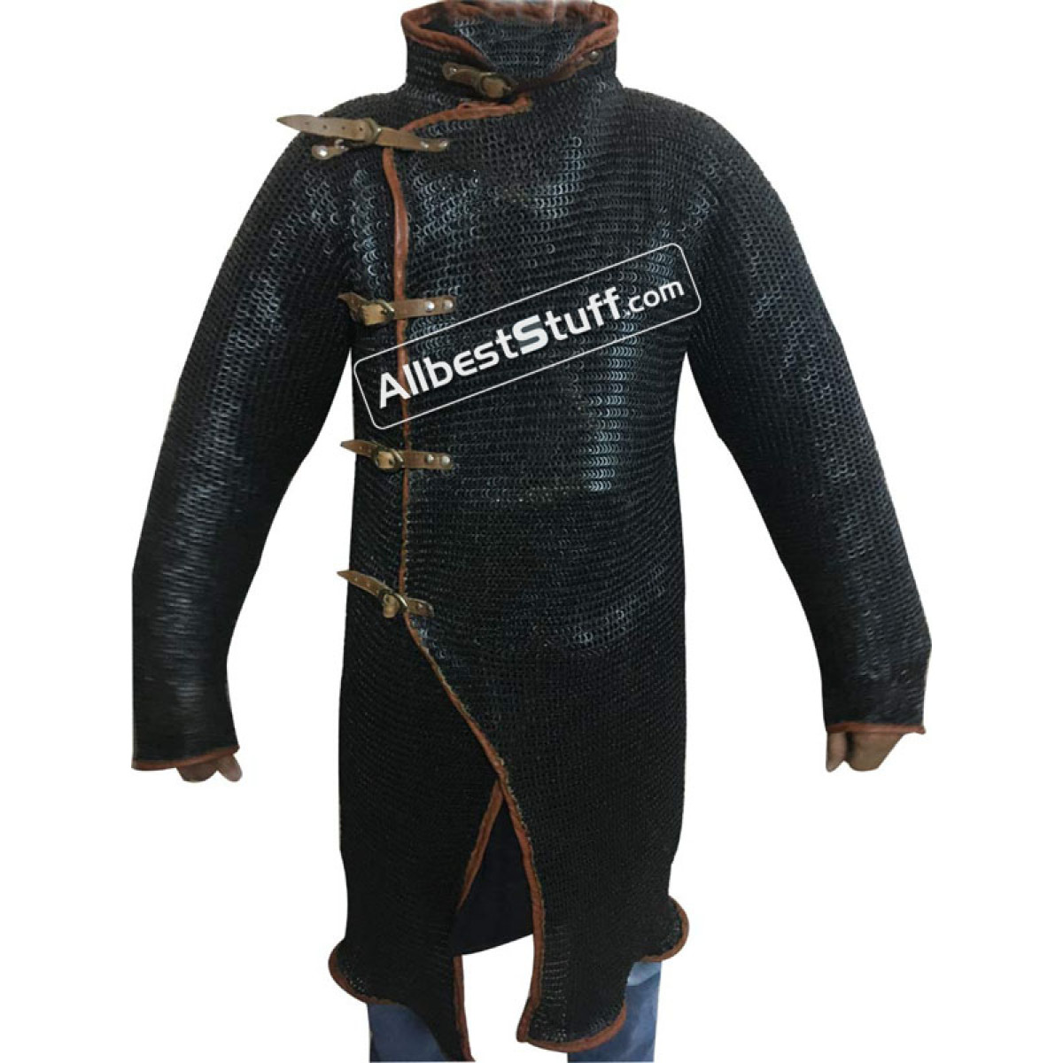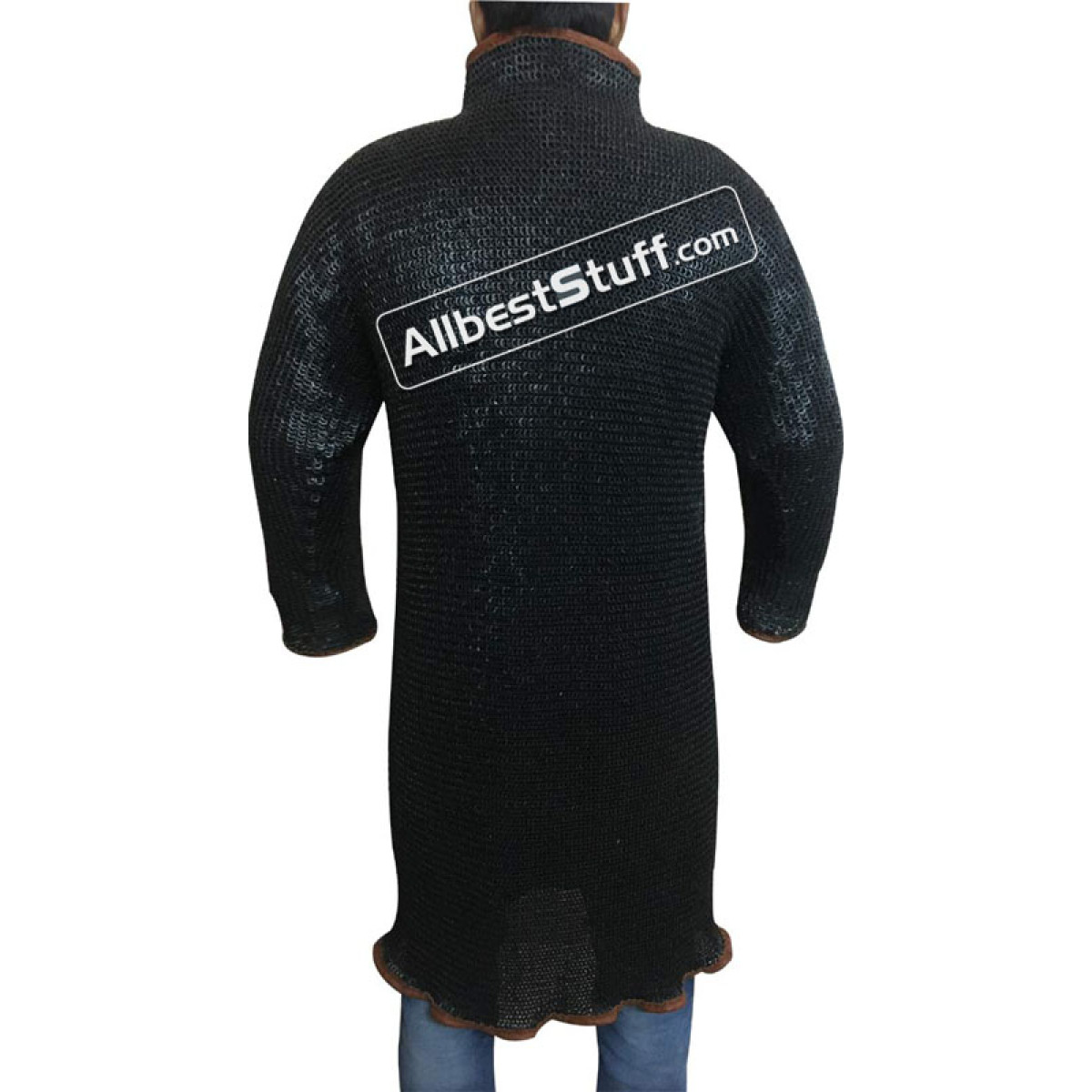 Ring Type: 18 Gauge 6 MM Flat Riveted Flat Solid RingsMaterial: Made from Mild Steel WireChest Size: 50 inches + 10 inches of overlap, comfortable fit for actual chest 44-45 inches with padding underneath3 inches of maille Collar for neck coveringSleeve Length from Armpit: 20 inchesSleeve Circumference at Armpit: 20 inches at armpit tapered to 12 inches at wristOverall Length from Shoulder: 44 inchesComplete Leather Edging with 4 buckle inside to attach with Linen gambeson (optional) underneath and 5 buckle fasteners in front to support neck collar and chest overlap.Finish: Choose from Drop down