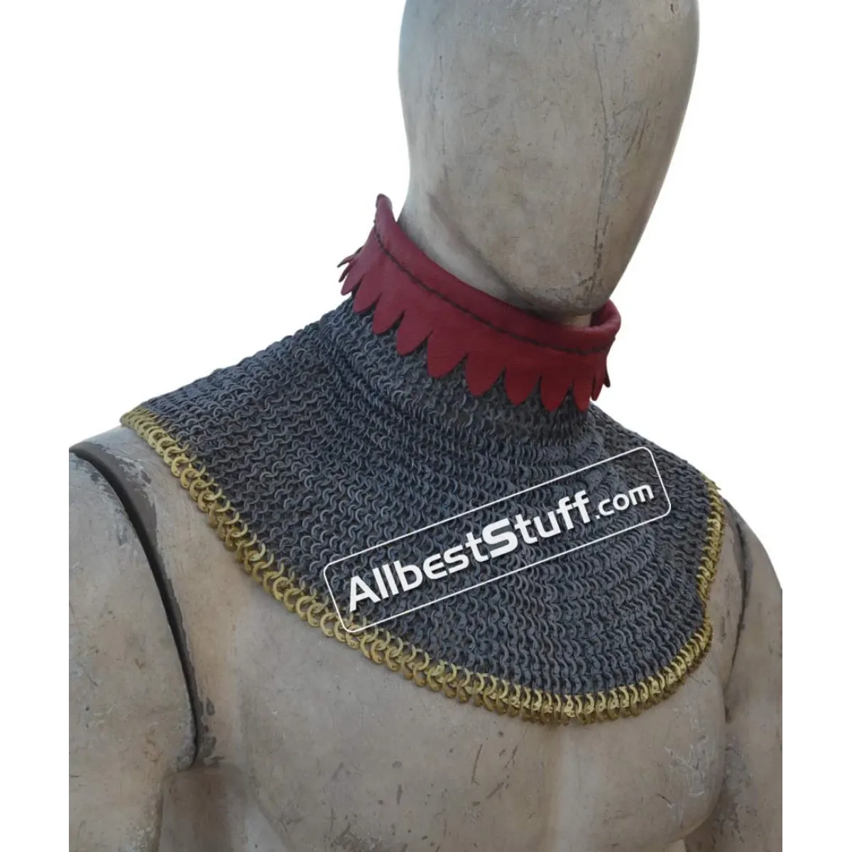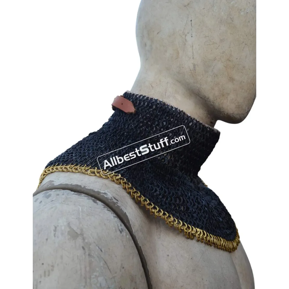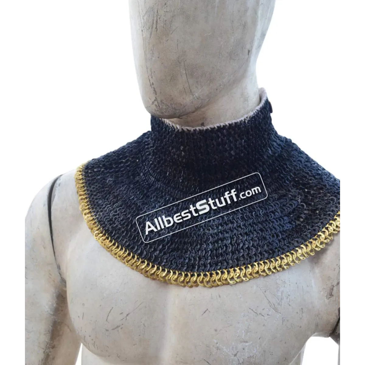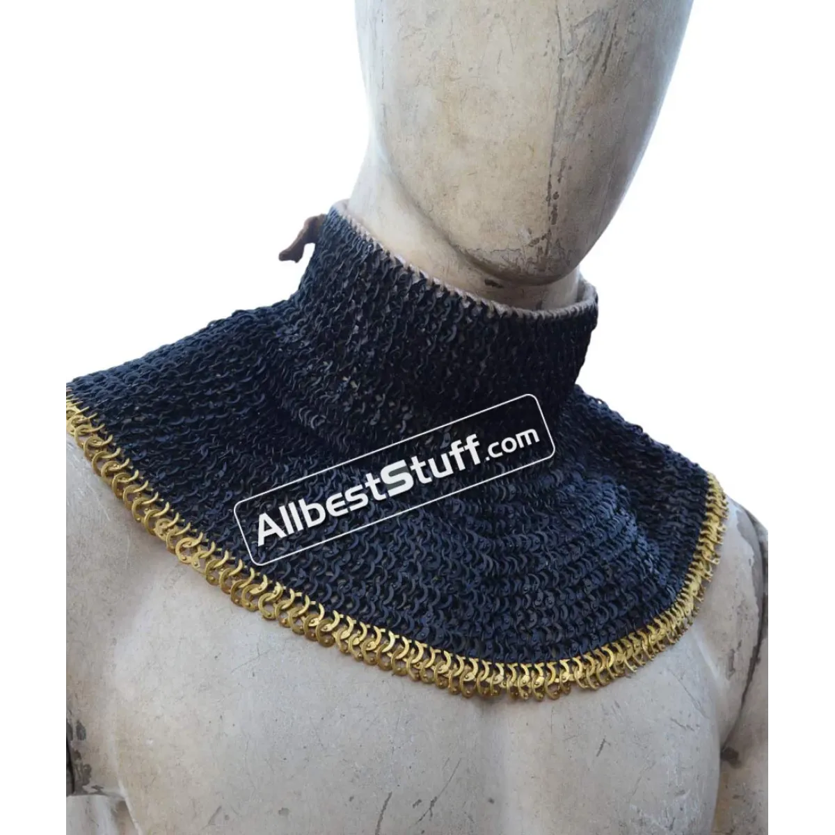 Chain Mail Gorget for neck covering made from 18 Gauge 6 mm steel usually worn over a padded coat or jacket. Combination of 1 dome riveted ring and alternate solid ring. The Gorget can be closed in the back using 1 leather fasteners. Over all length of approx. 8 inches inclusive 2.5 inches of neck covering. You can optionally add solid brass rows for superior looks or a linen padding for neck comfort at a little additional cost. Dimensions: Ring Size: 18 Gauge 6 mm, One Flat Dome Riveted Ring with Alternating Flat SolidMaterial: Made from Mild Steel WireNeck Circumference: 18 inchesNeck Length: 2.5 to 3 inchesLength: 8 inches approx01 Leather fastener to close the NeckFinish : Two finish to choose from