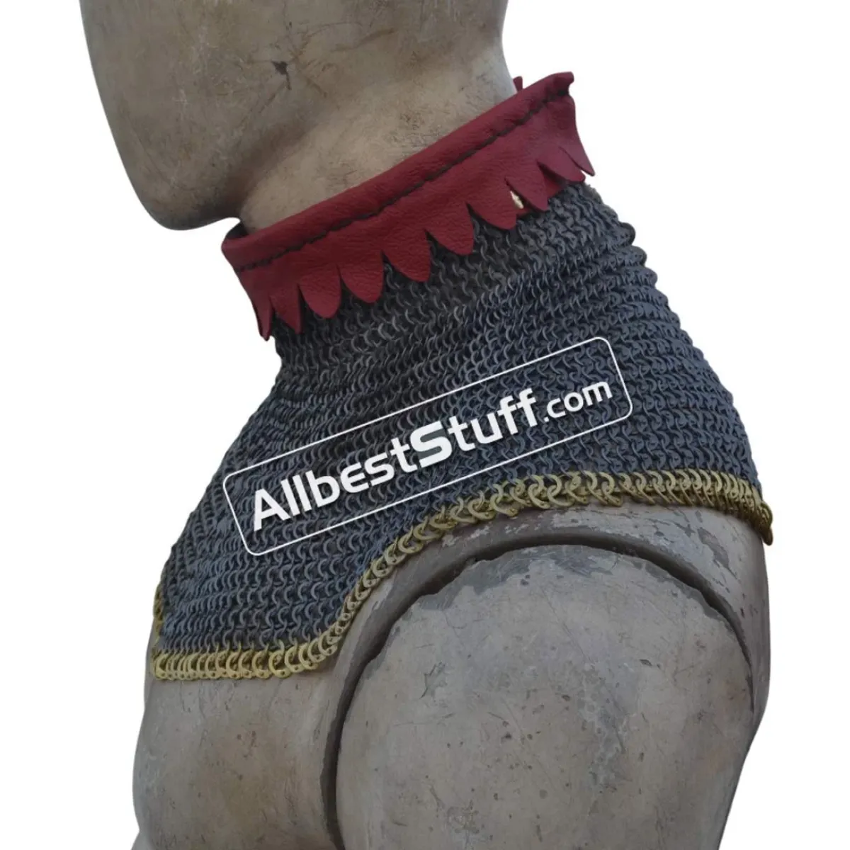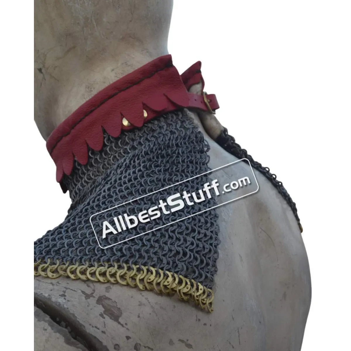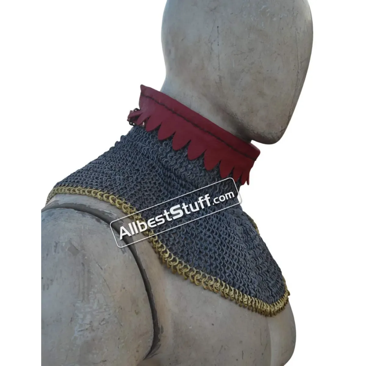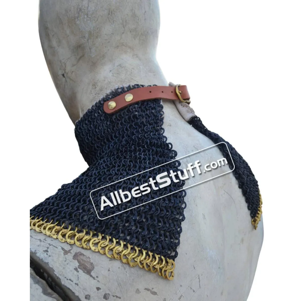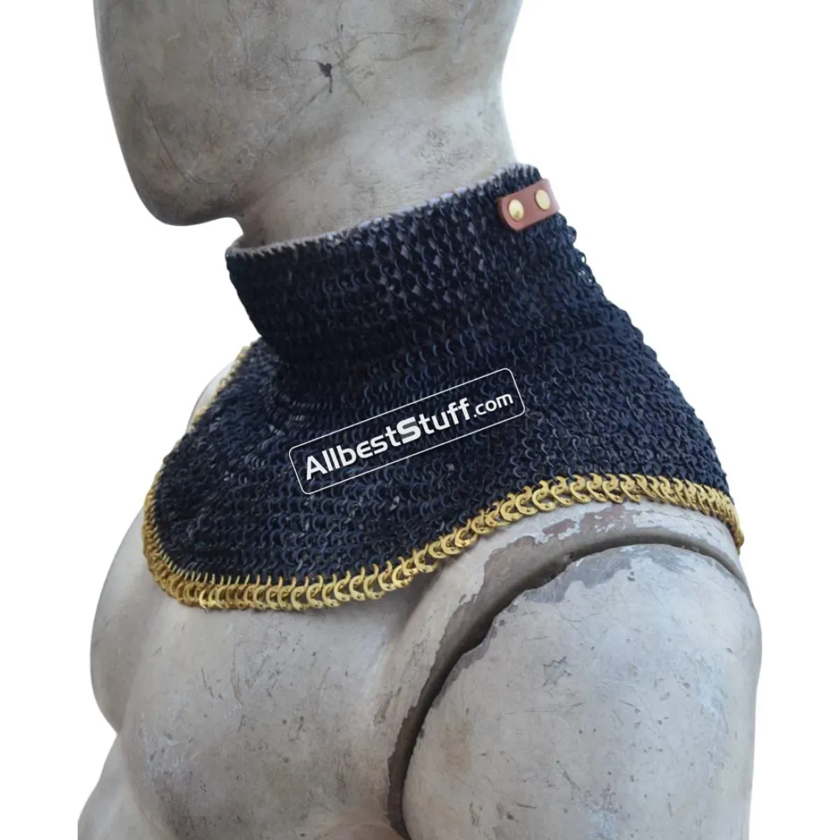 Chain Mail Gorget for neck covering made from 18 Gauge 6 mm steel usually worn over a padded coat or jacket. Combination of 1 dome riveted ring and alternate solid ring. The Gorget can be closed in the back using 1 leather fasteners. Over all length of approx. 8 inches inclusive 2.5 inches of neck covering. You can optionally add solid brass rows for superior looks or a linen padding for neck comfort at a little additional cost. Dimensions: Ring Size: 18 Gauge 6 mm, One Flat Dome Riveted Ring with Alternating Flat SolidMaterial: Made from Mild Steel WireNeck Circumference: 18 inchesNeck Length: 2.5 to 3 inchesLength: 8 inches approx01 Leather fastener to close the NeckFinish : Two finish to choose from