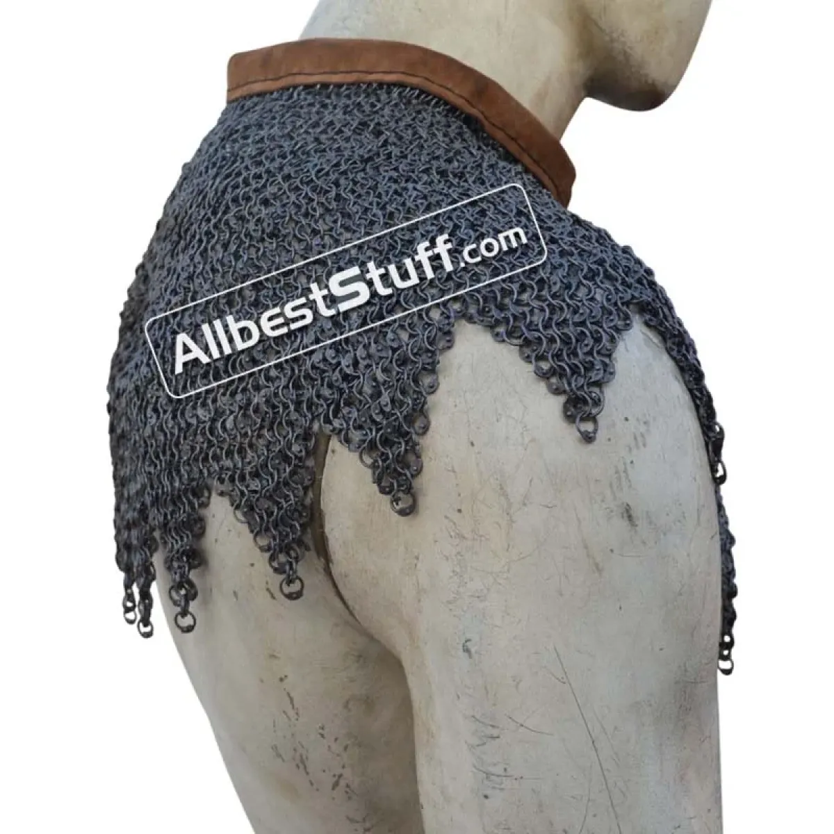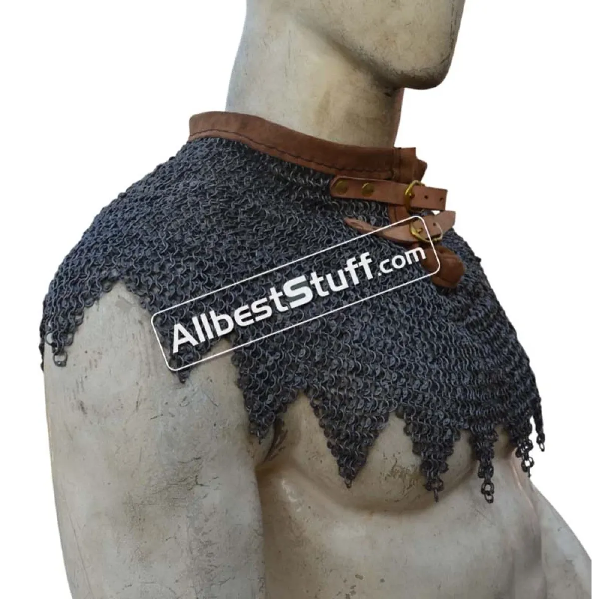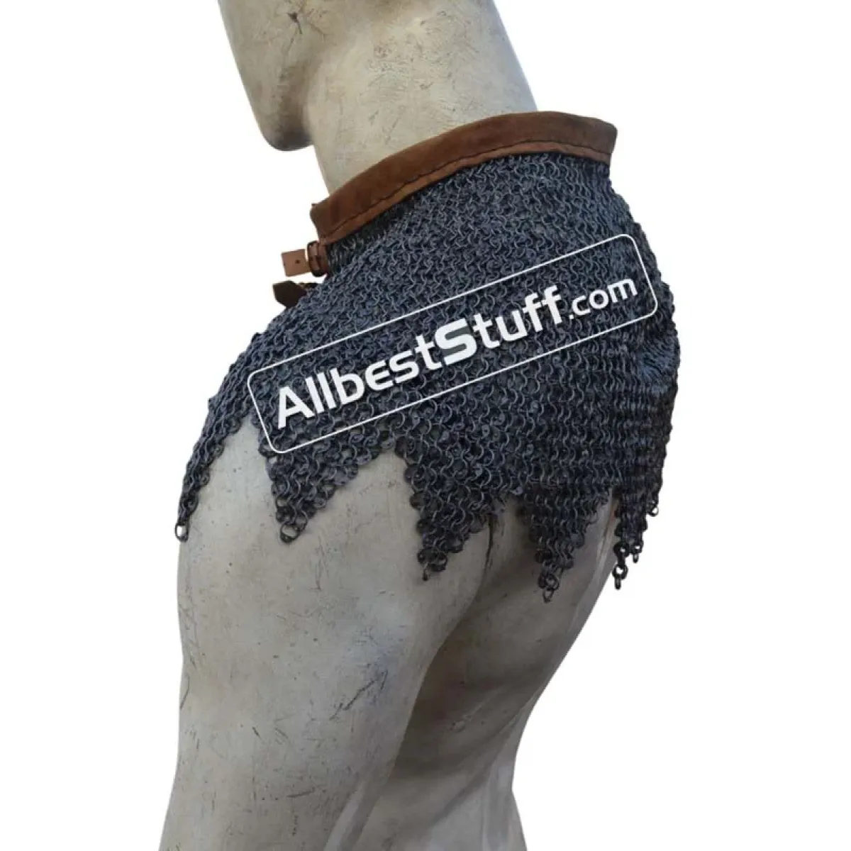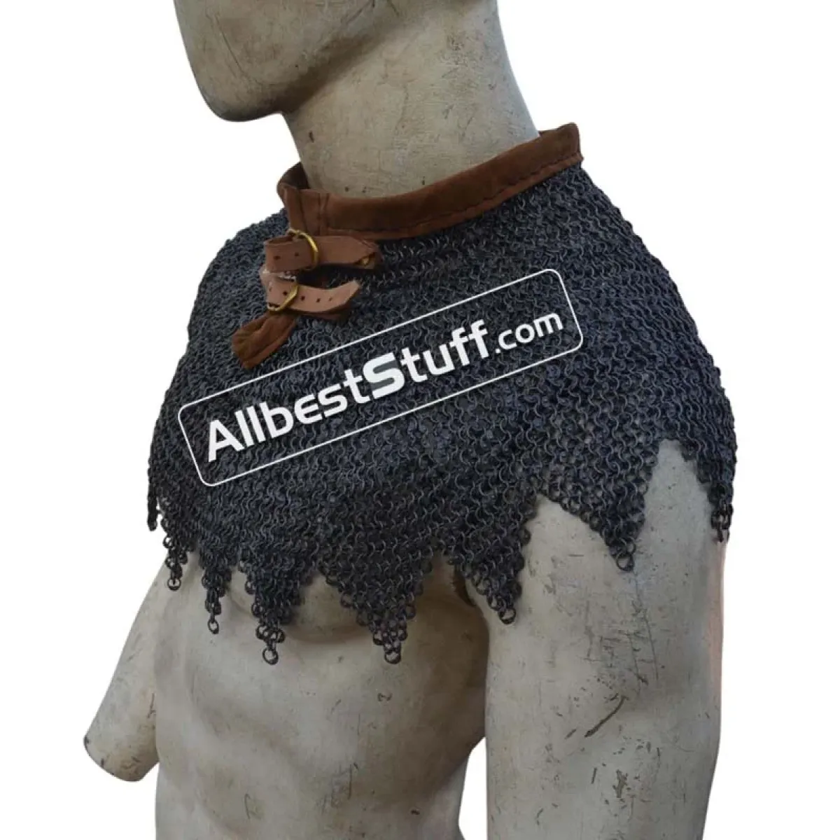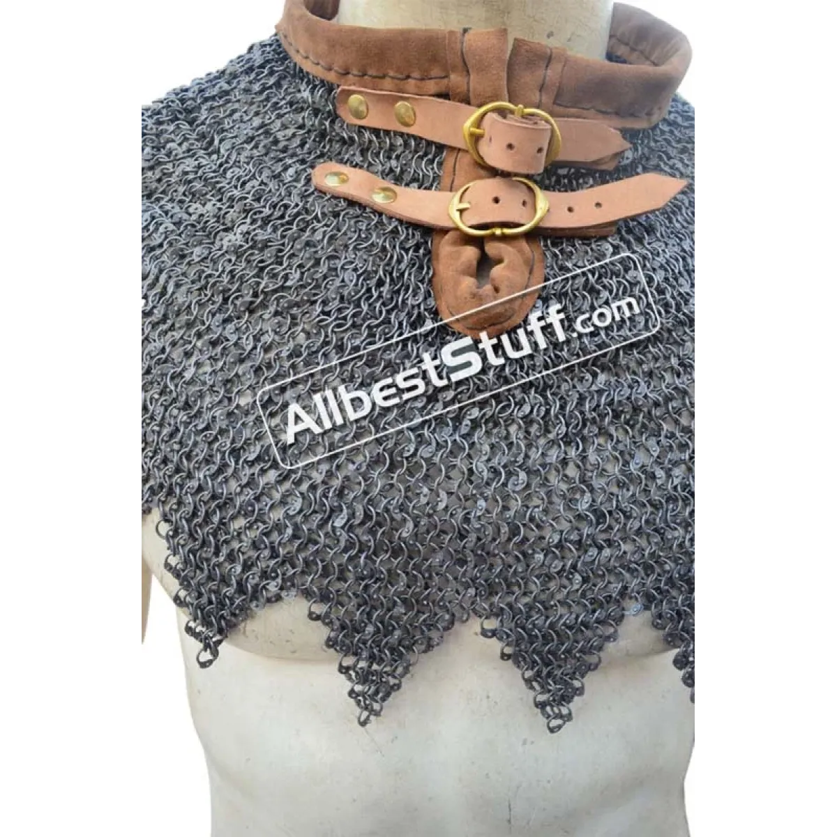 ABS offers hand riveted steel based maille collar, round dome riveted rings available in original oil or blackened finish. 2 zinc buckle with leather fastener to cover the neck area. Zig Zag design at the bottom.