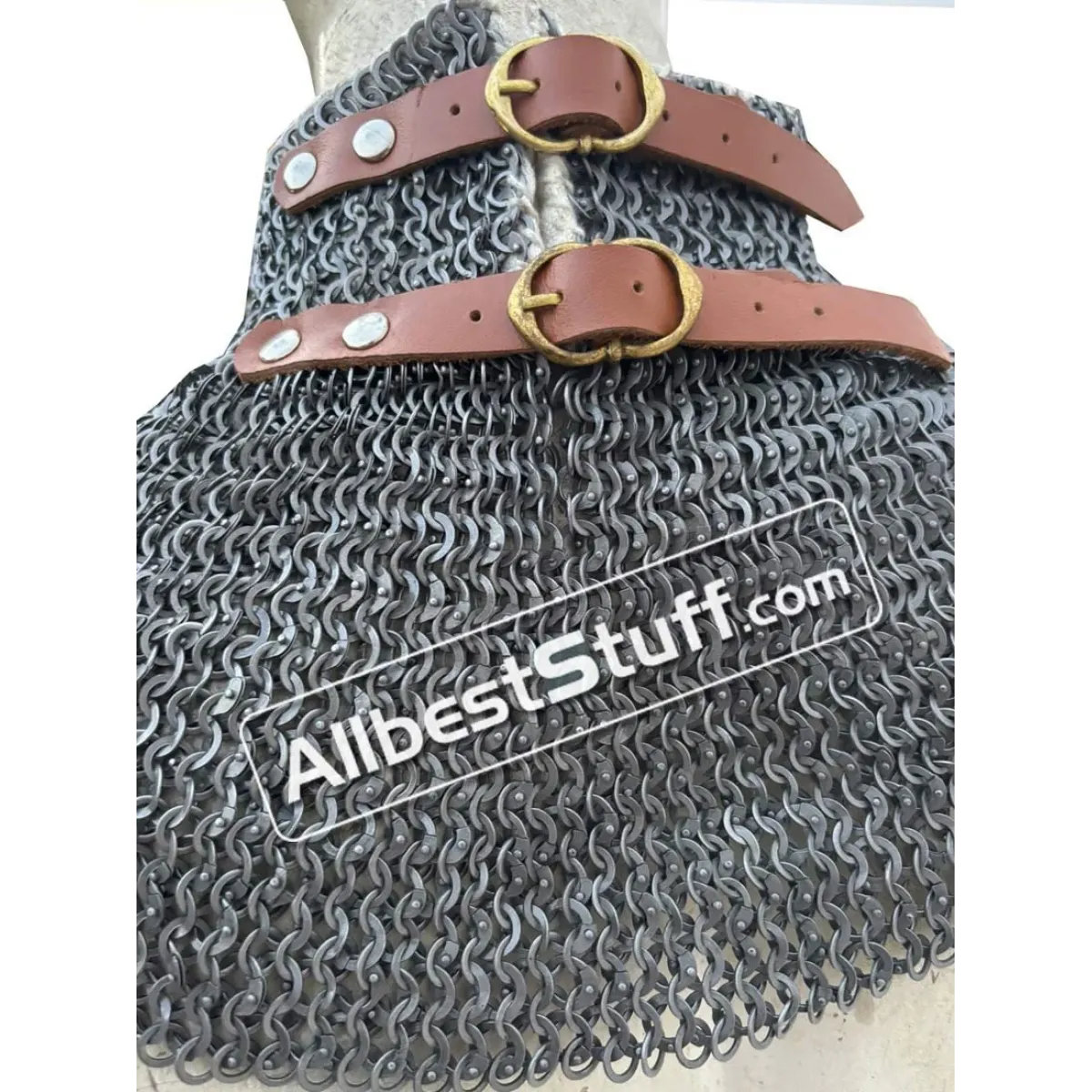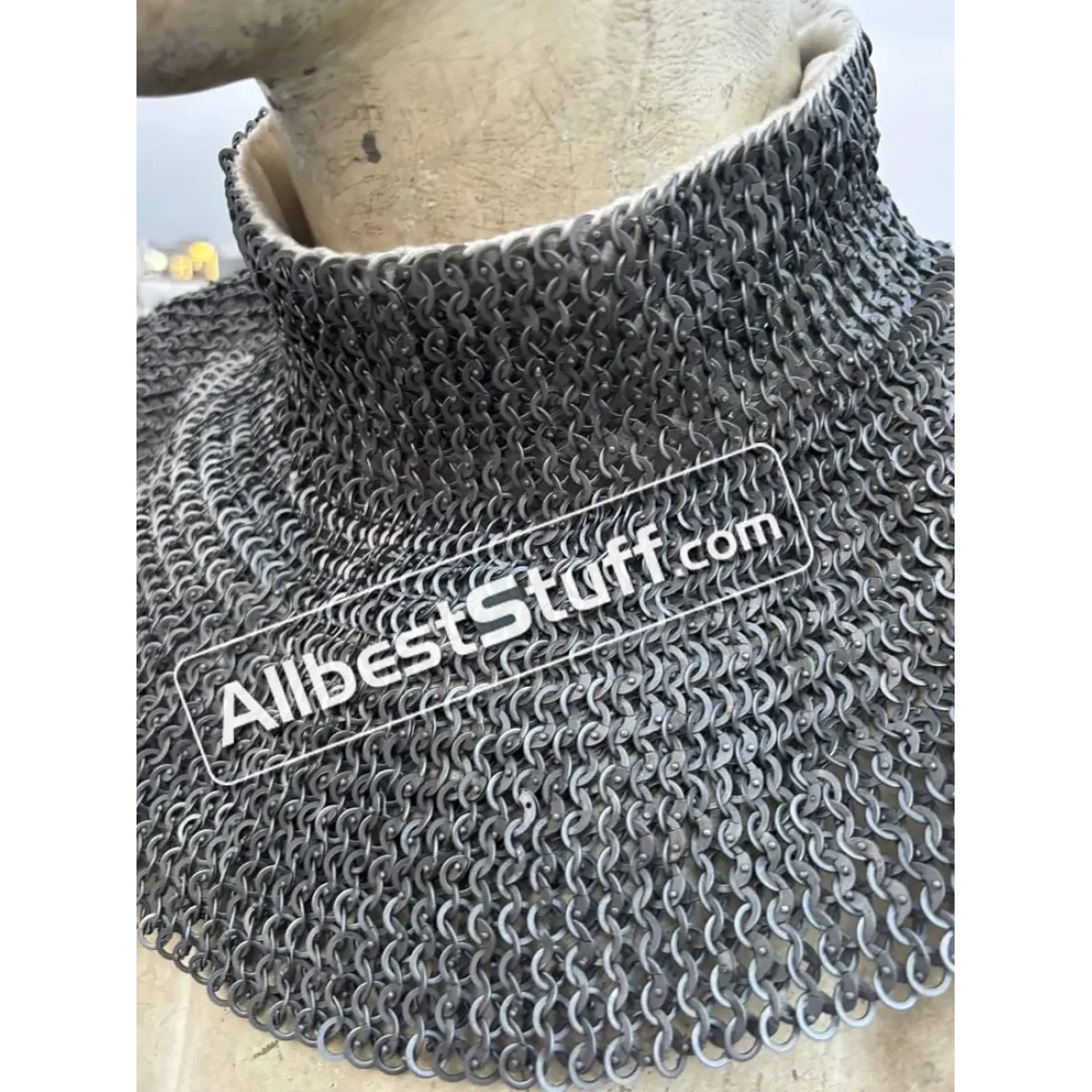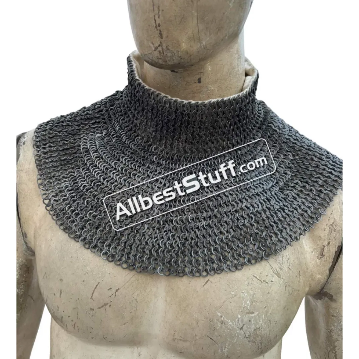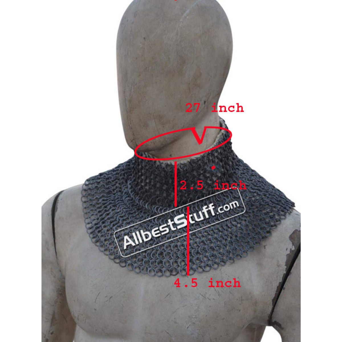 Ring type; 18 gauge 6 mm, Flat Dome Riveted Ring with Alternating Solid RingMaterial: Made from Mild Steel WireNeck Circumference (opening): 27 inches, supported by 2 buckles to adjust it to the neck and padding if any.Neck Circumference: 20 inchNeck Collar Height: 2.5 inchesLength: 6-7 inchesBottom Circumference: 40-45 inchesFinish: Choose from optionsHigh neck with linen fabric stitched for neck** Note: If you want to add brass to the bottom choose from additional options.