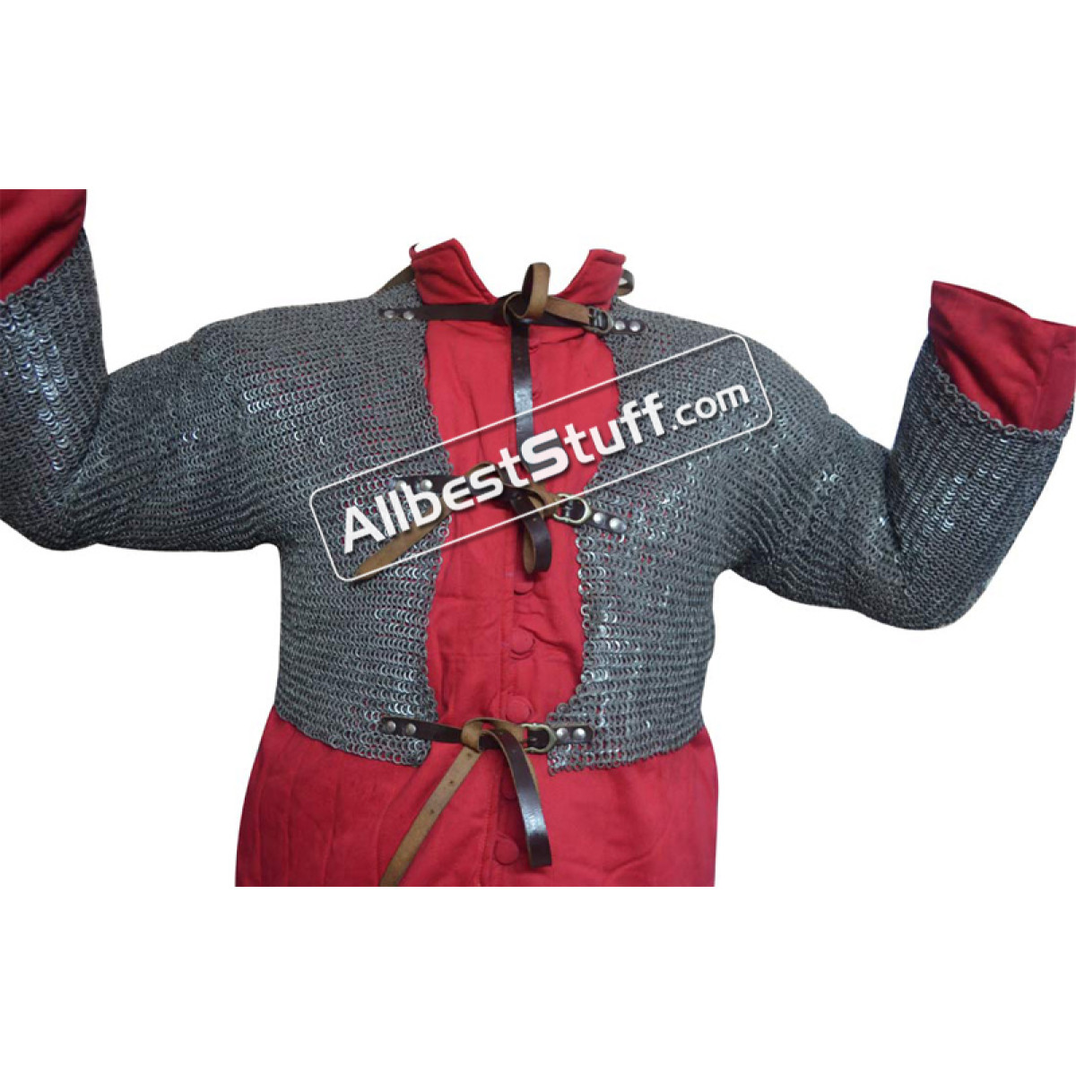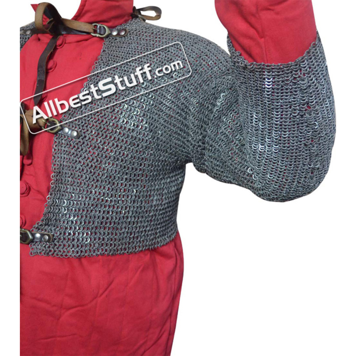 Specifications:Ring Type: 18 Gauge 6 MM Flat Dome Riveted Ring with alternating solid ringMaterial: Made from Mild Steel WireChest Size: 35-40 inches, the 2 pieces will give approx 8-9 inches of chest and back coverage on each side03 Nos Leather fasteners to close the front.Sleeve Style: Fully ClosedLength of Sleeve: 20 inches measured from under the armpit area to wristSleeve Circumference at Armpit: 20 inches (Default) choose preferred circumference from additional optionsOverall Length from Shoulder: 17 inchesFinish: 02 Finish to choose from** Have your own measurements, let us know and we ll do a custom size for you. our email id is contact@allbeststuff.com