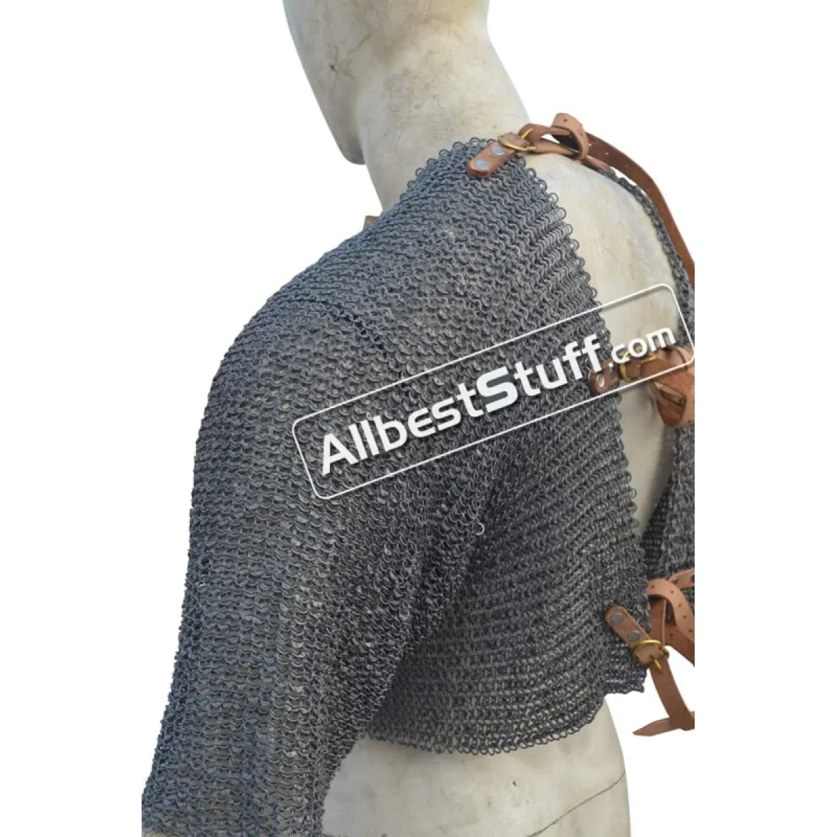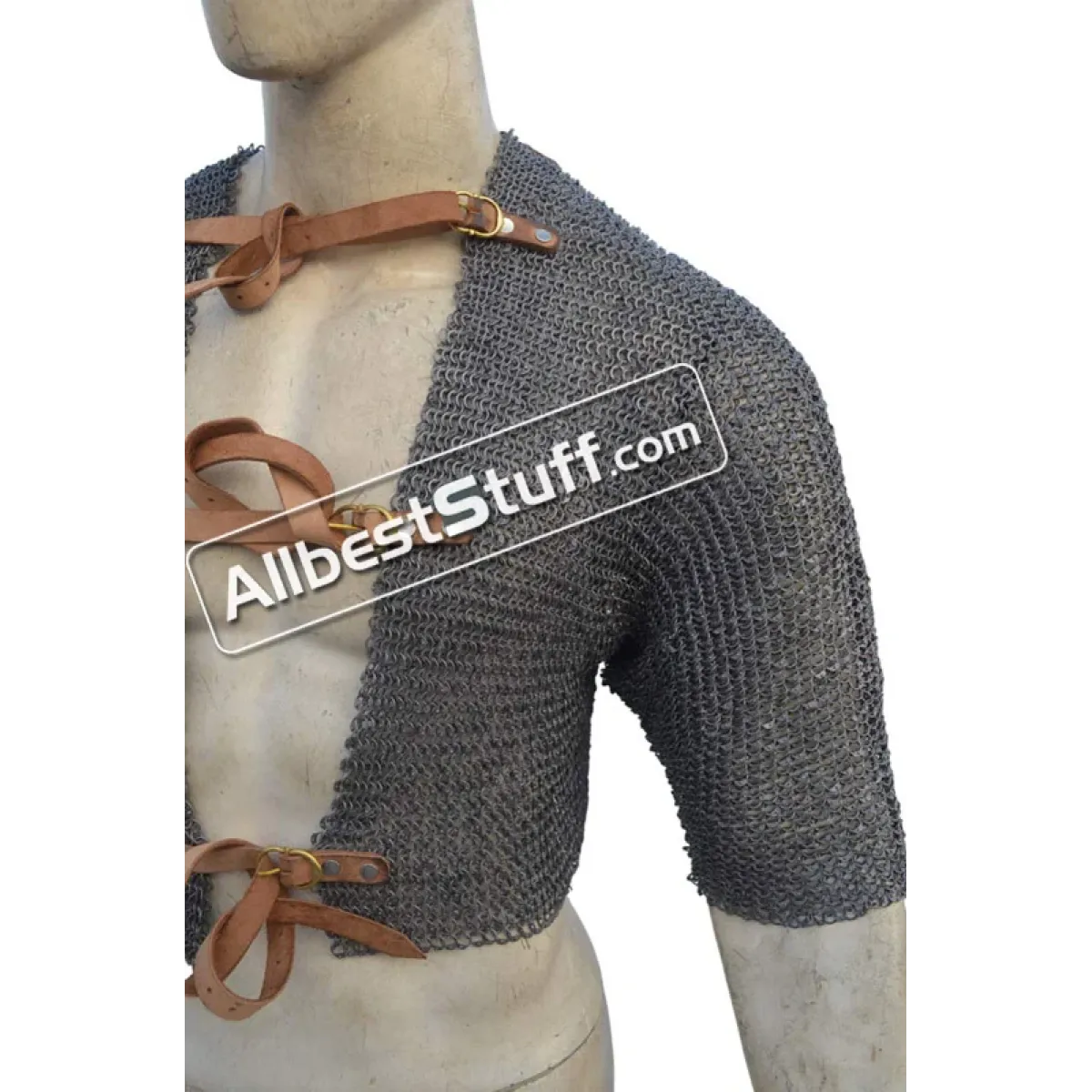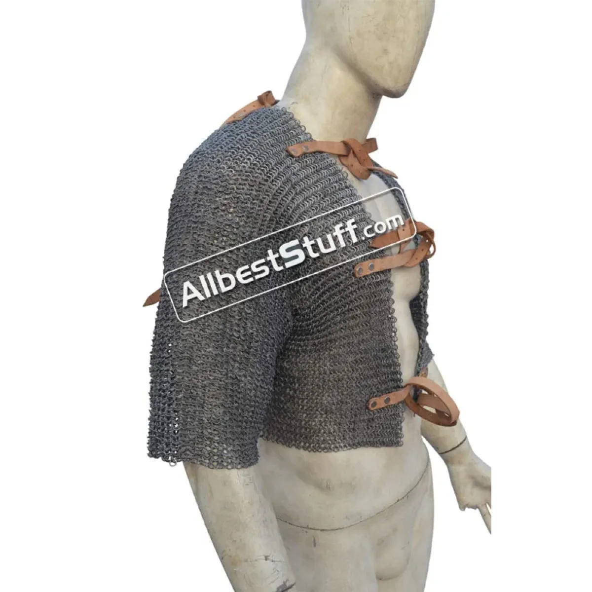 Half sleeve 6 MM Round Riveted mixed with Solid ring maille voider. The 6 mm smaller ring size offer dense coverage to complete arms and chest area. Widely liked by the fighters across the globe and can be worn under the plate armor for added protection. Made with mild steel (Iron) 6 mm Round dome riveted ring with alternating solid ring.