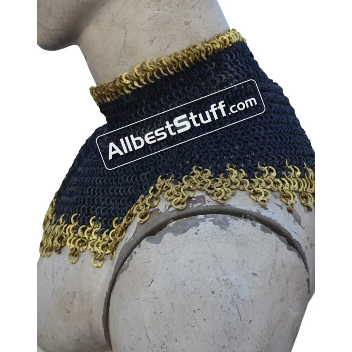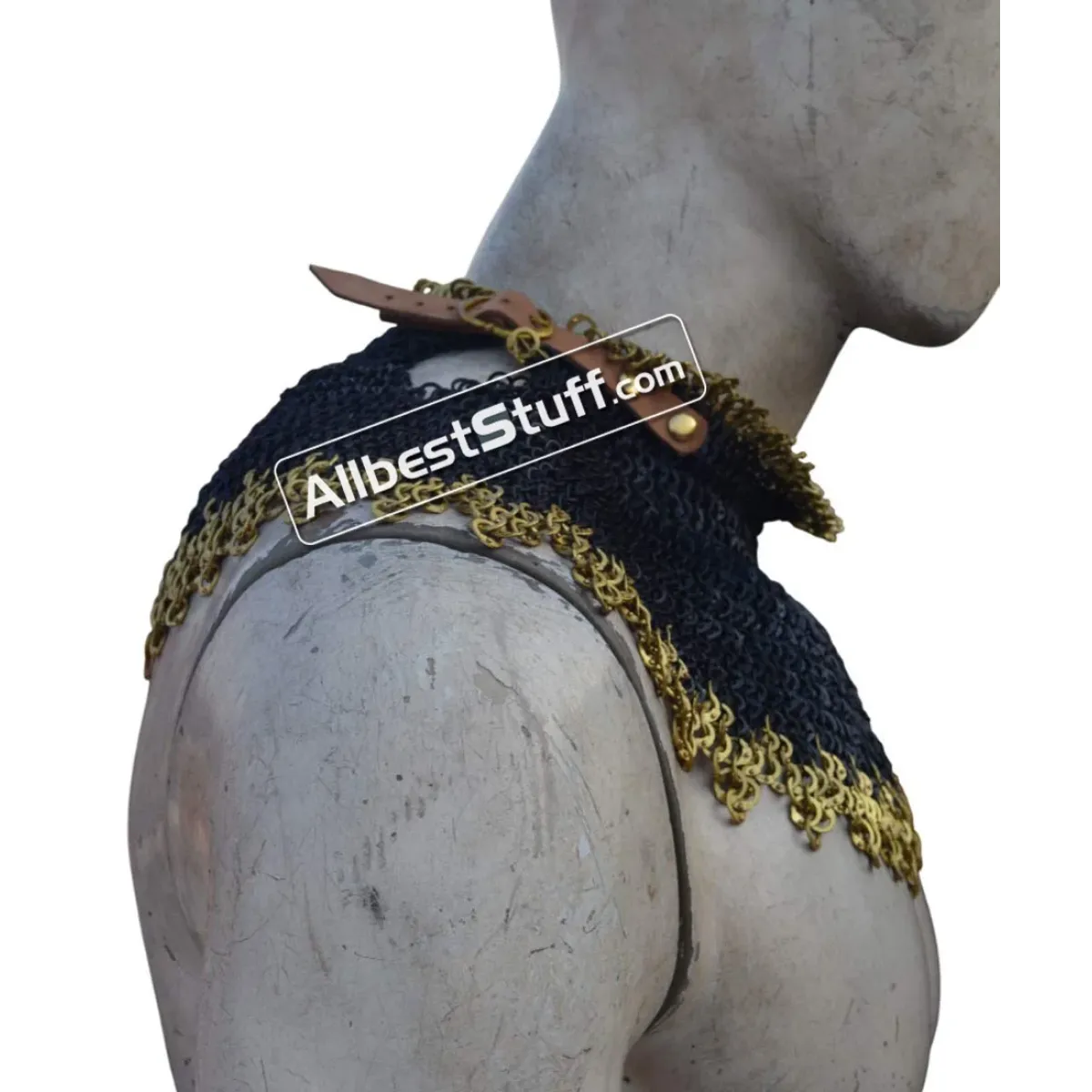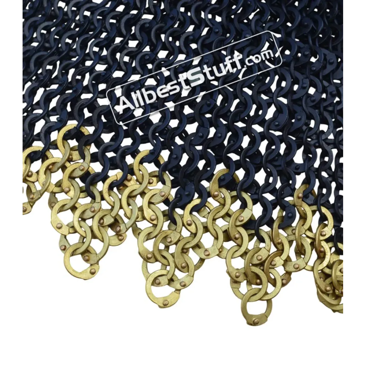 6 mm Medieval Chainmail Collar with Edged Brass Rows. 1 Brass buckle with leather fastener to cover the neck area. Zig Zag design at the bottom.