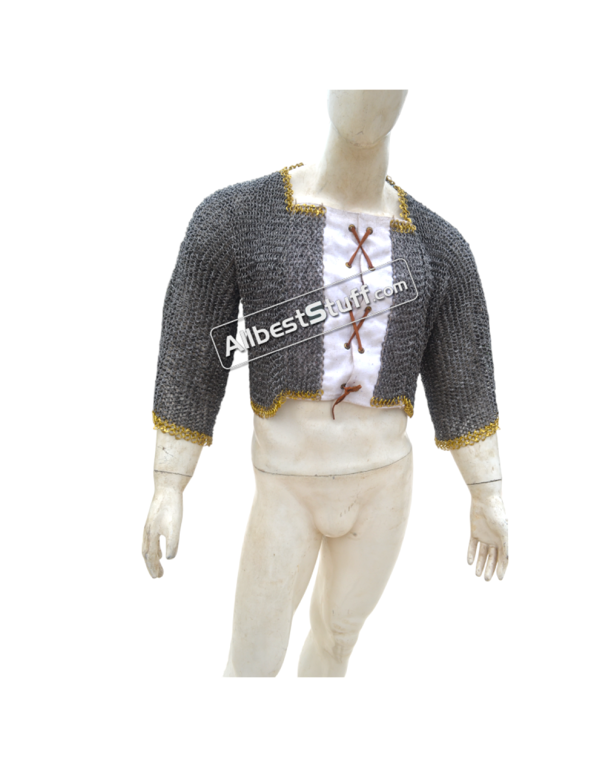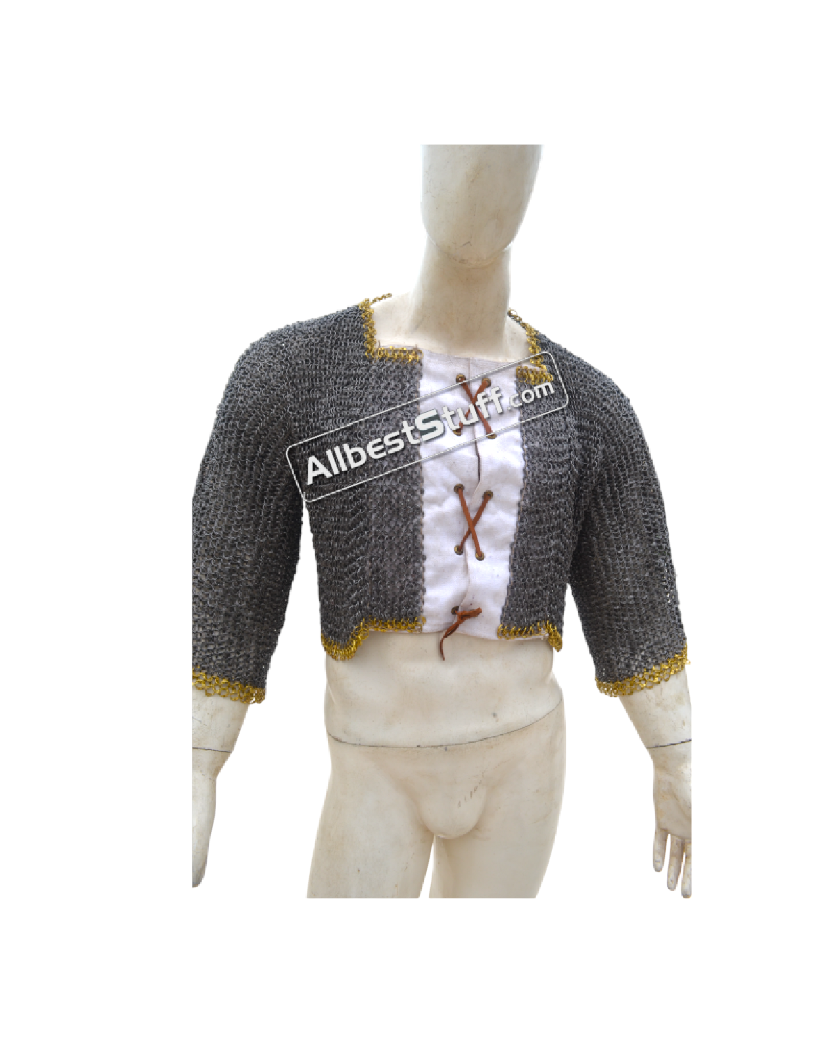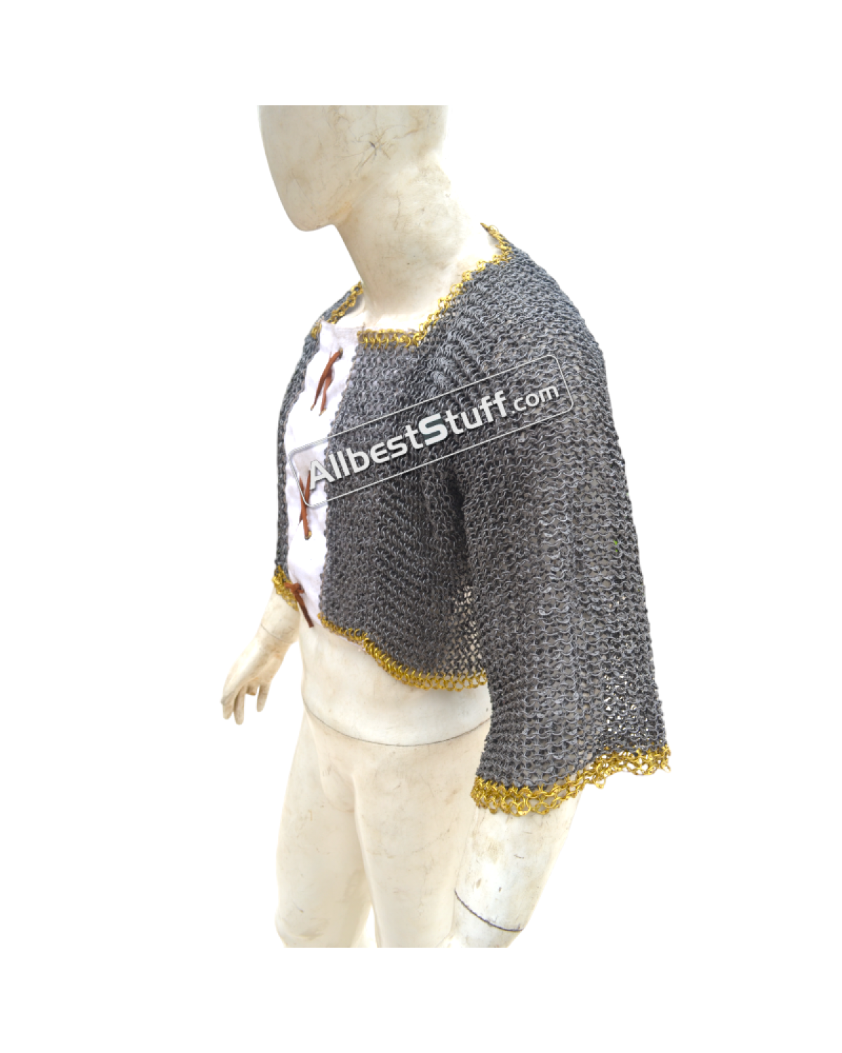 Ring Type: 17 Gauge 8 MM Full Round Dome Pin Riveted RingMaterial: Made from Mild Steel WireChest Size: 50 inches, comfortable fit for 45 inches with padding underneathfront close with opening of 4-5 inches backed up by linen fabric (attached picture) laces to close the front.Sleeve Style: Fully ClosedLength of Sleeve: 12 inches measured from under the armpit area to wrist Sleeve Circumference at Armpit: 21 inches Overall Length from Shoulder: 17 inchesCut at the back will be adjusted and may vary as per the overall chest circumferenceFinish: 03 Finish to choose from