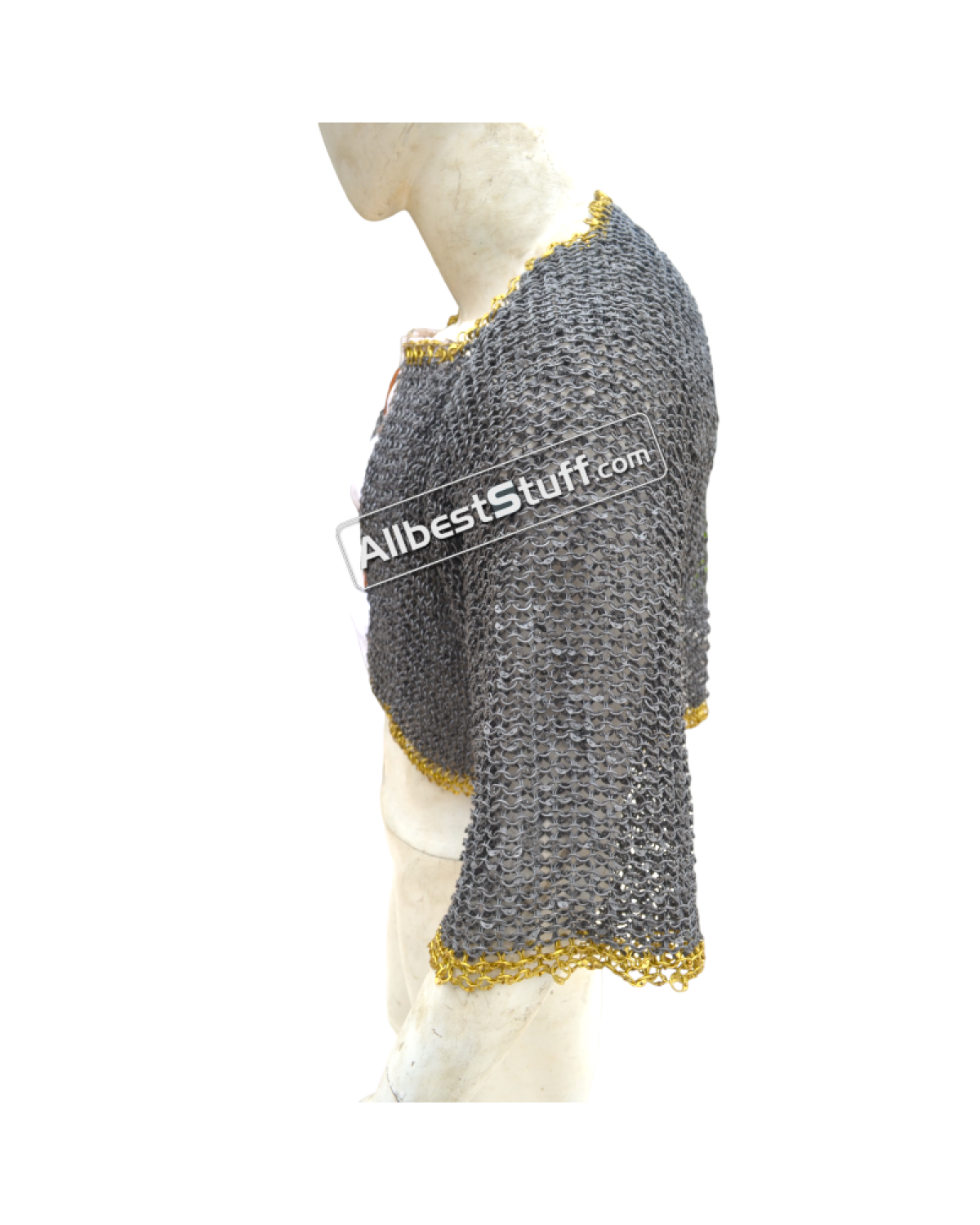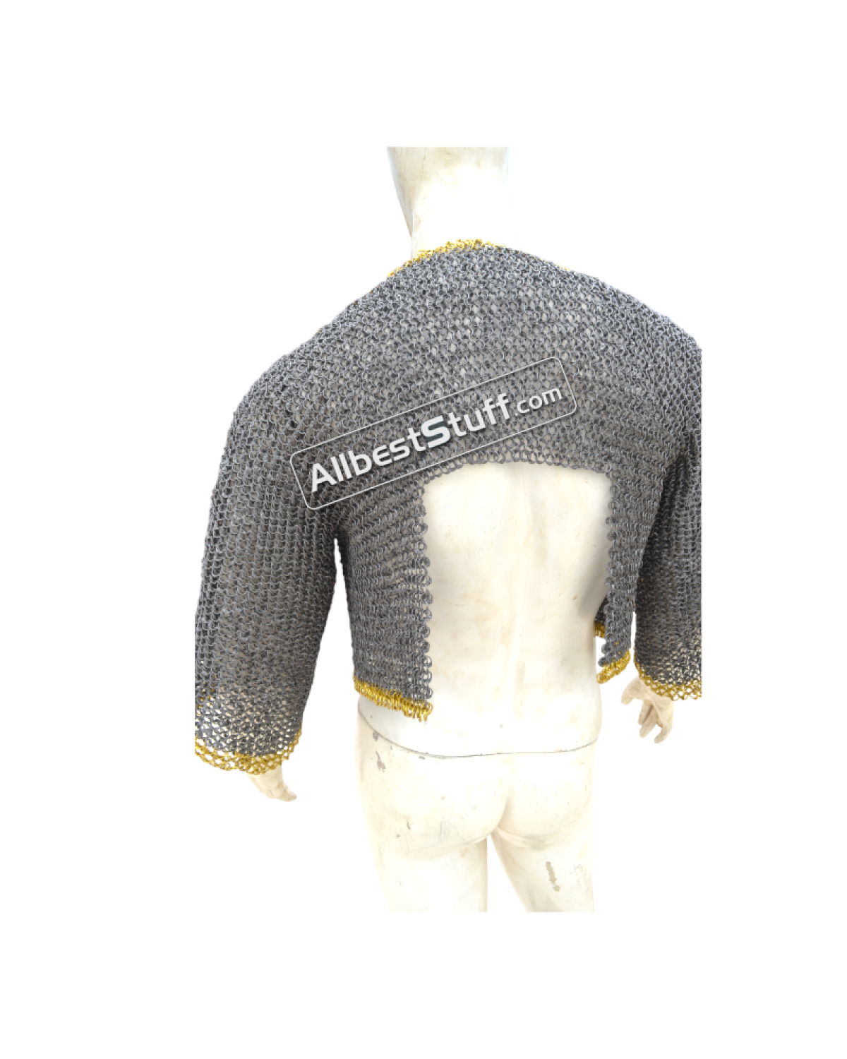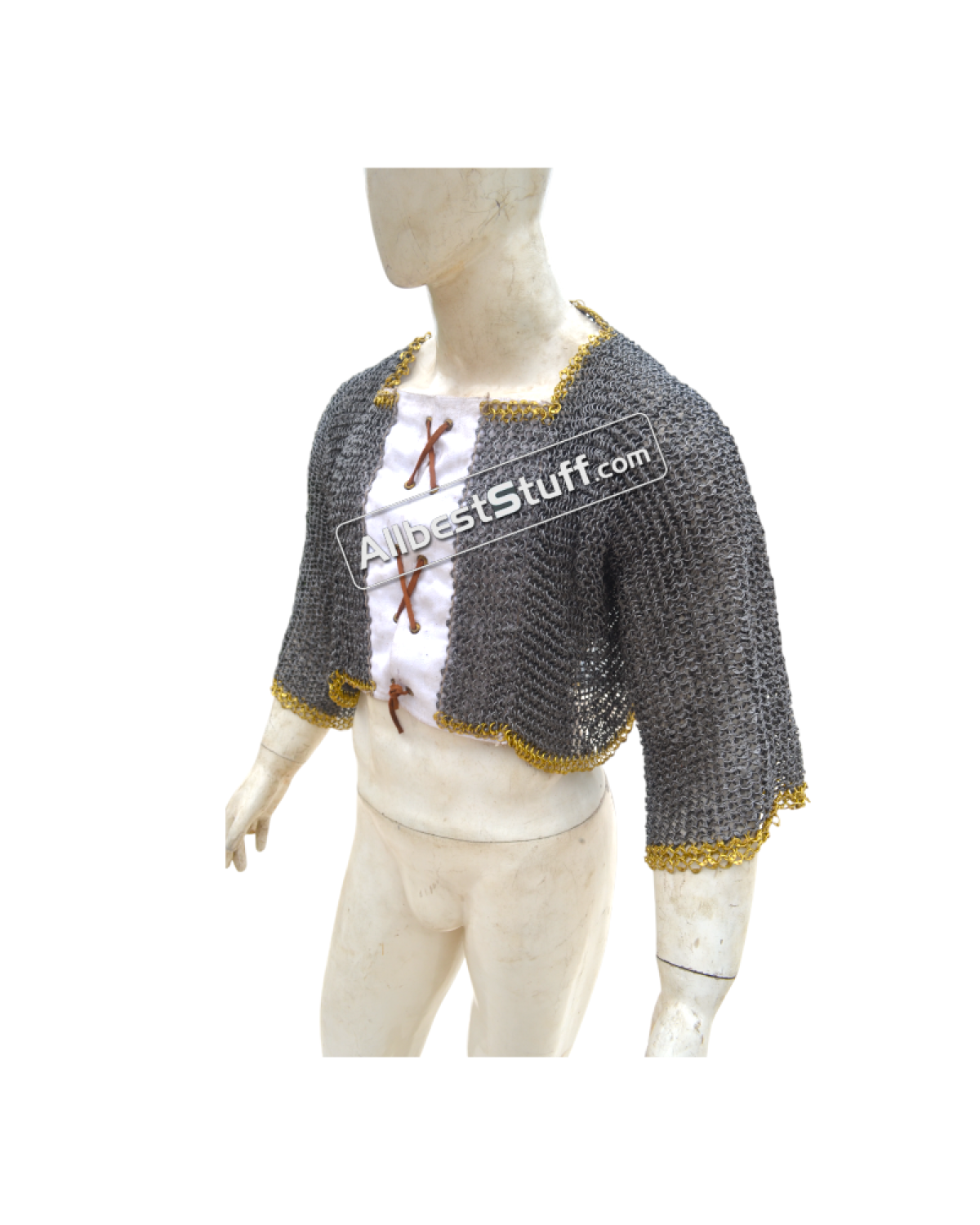 Ring Type: 17 Gauge 8 MM Full Round Dome Pin Riveted RingMaterial: Made from Mild Steel WireChest Size: 50 inches, comfortable fit for 45 inches with padding underneathfront close with opening of 4-5 inches backed up by linen fabric (attached picture) laces to close the front.Sleeve Style: Fully ClosedLength of Sleeve: 12 inches measured from under the armpit area to wrist Sleeve Circumference at Armpit: 21 inches Overall Length from Shoulder: 17 inchesCut at the back will be adjusted and may vary as per the overall chest circumferenceFinish: 03 Finish to choose from
