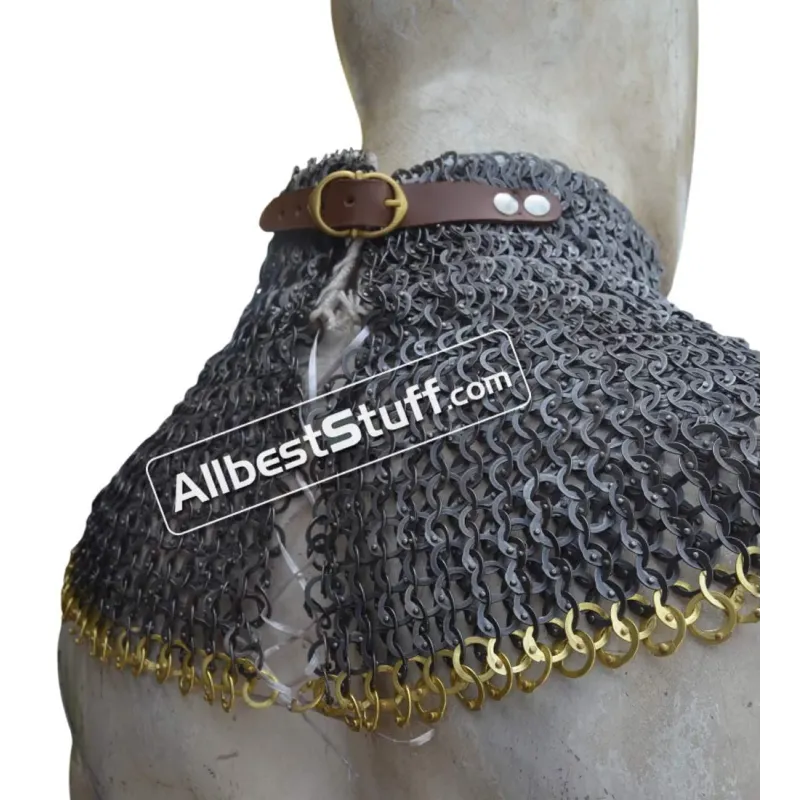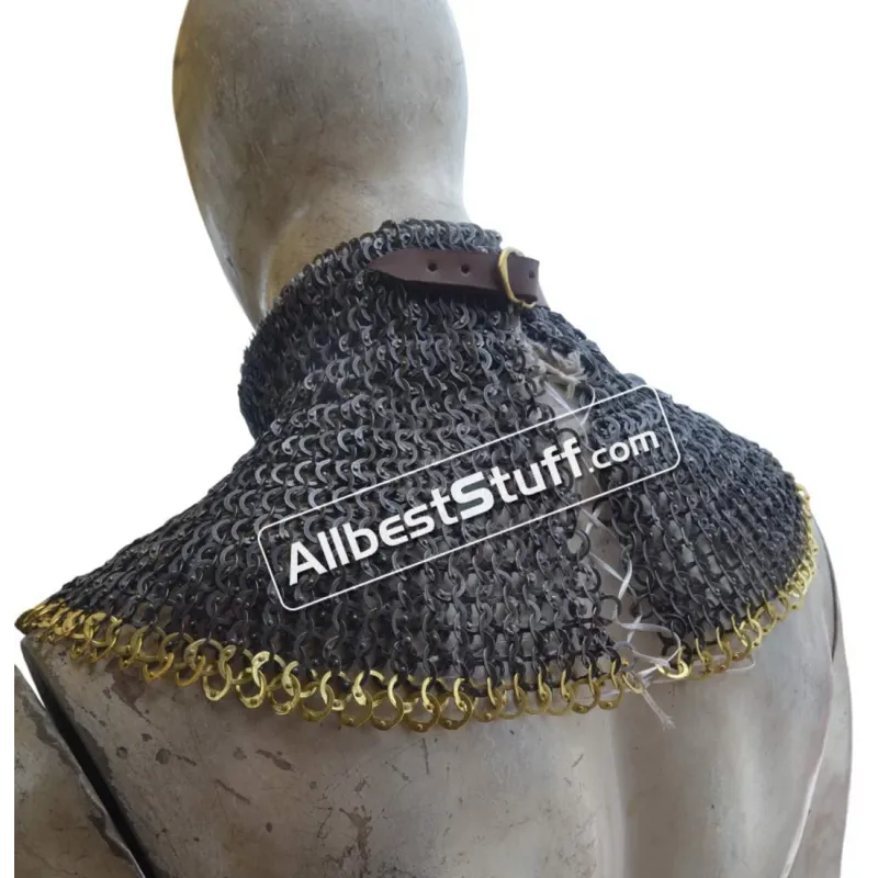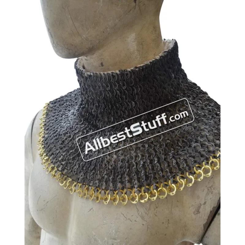 Medieval Stylish Chain Mail Collar with high neck. this piece still uses the same quality materials and finishing techniques to create a refined piece of armor. All of the mail rings on this standard are made from Stainless steel, We have used the standard mail ring pattern of 4:1 for the largest part of the collar, maille standards would have a tighter weave around the actual neck part, we’ve used a 6:1 weave on the neck, which looks excellent and provides a bit of extra protection due to the denser pattern of rings.