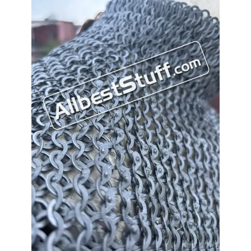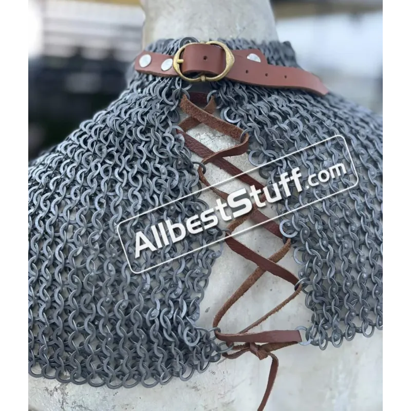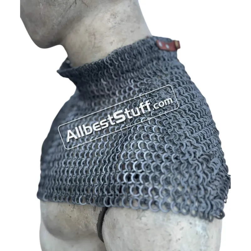 Medieval Stylish Chainmail Collar with high neck. this piece still uses the same quality materials and finishing techniques to create a refined piece of armor. All of the mail rings on this standard are made from steel, We have used the standard mail ring pattern of 4:1 for the largest part of the collar, maille standards would have a tighter weave around the actual neck part, we’ve used a 6:1 weave on the neck, which looks excellent and provides a bit of extra protection due to the denser pattern of rings.