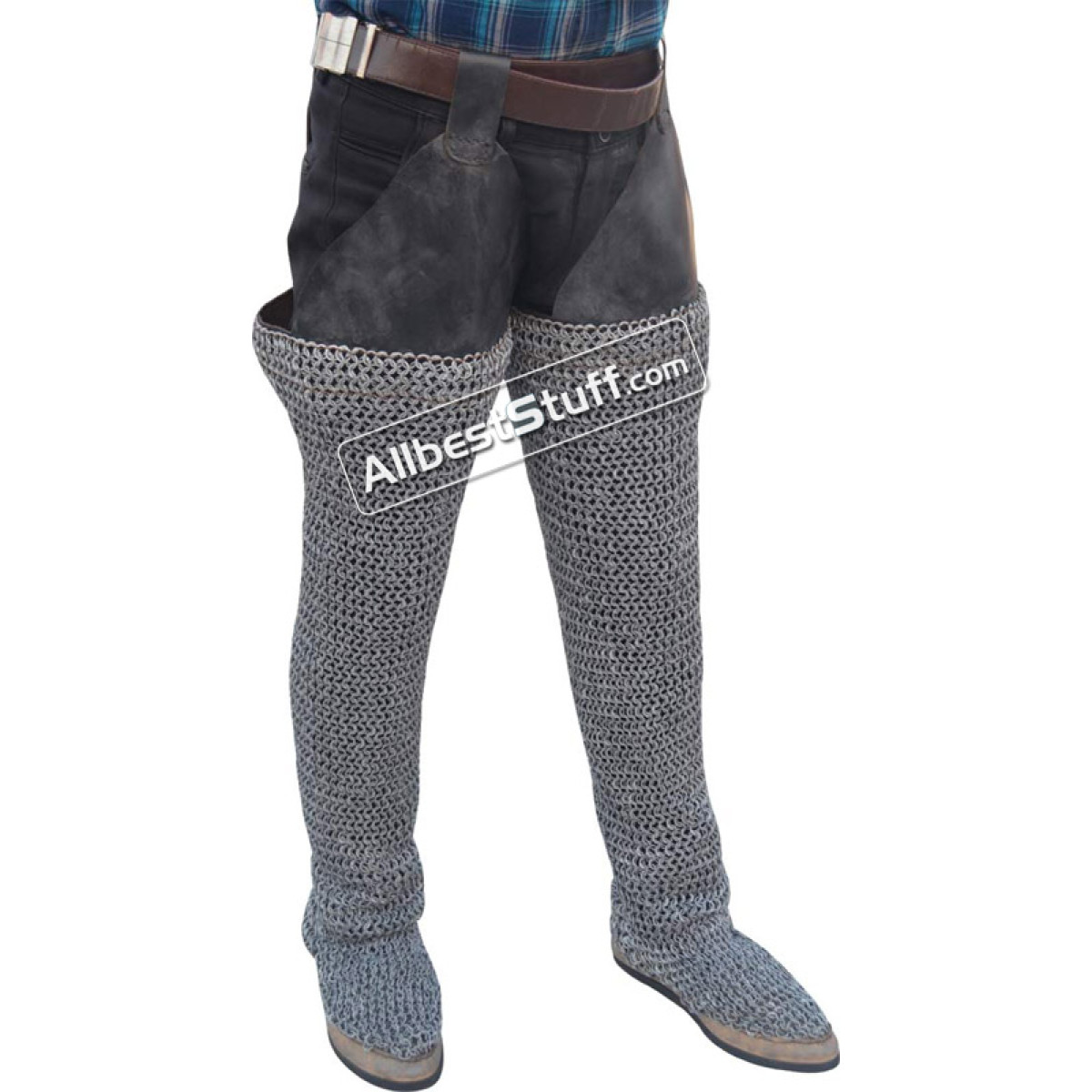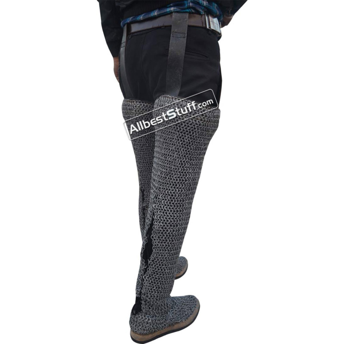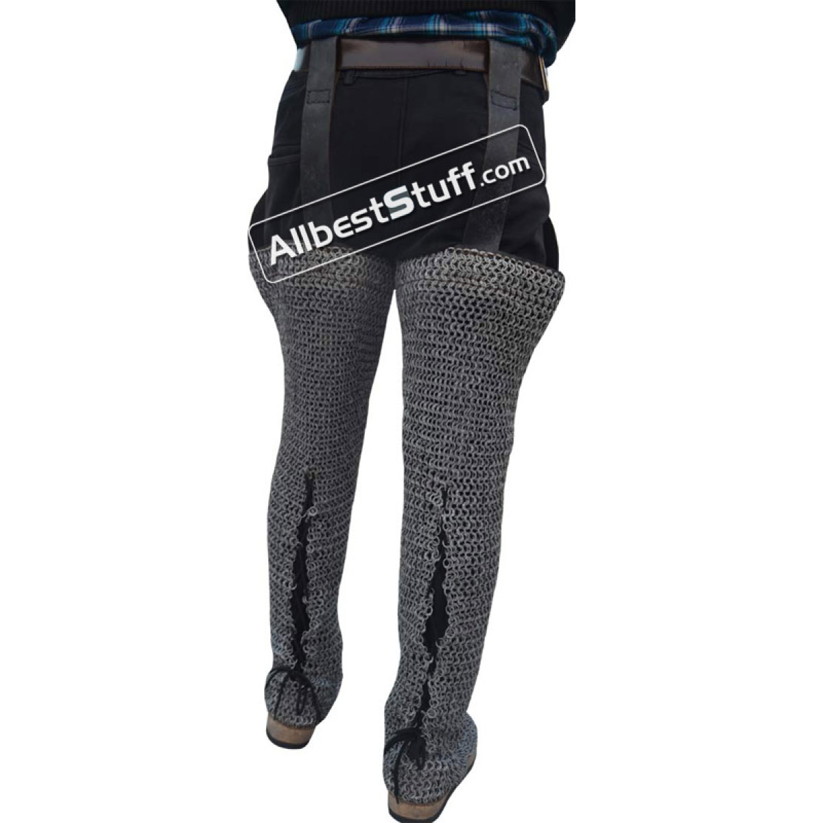 Features:Incorporates leather support at the front and back of the thigh, providing additional protection.Includes a loop that can be easily inserted into a waist belt, ensuring a secure fit while you move.The lightweight construction of the chainmail leggings prevents unnecessary strain on your legs, enabling better agility and mobility.
