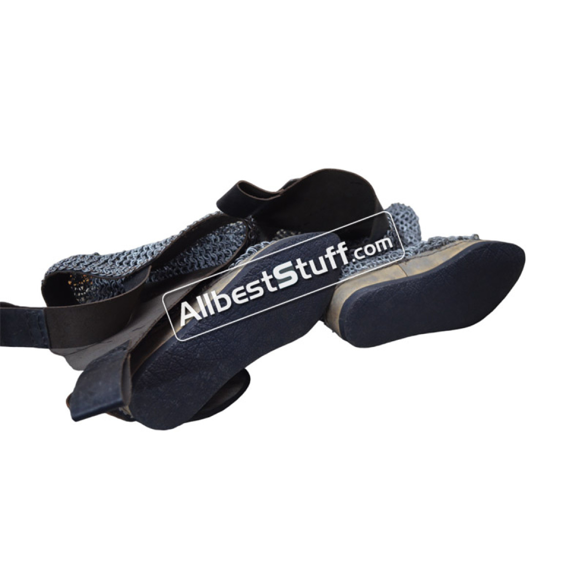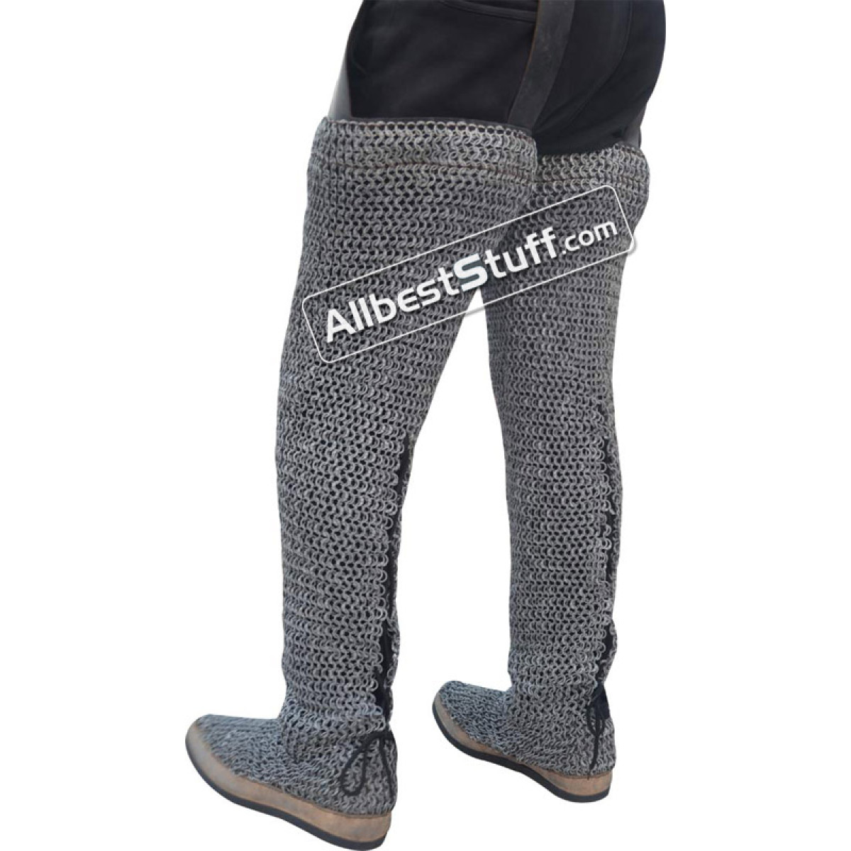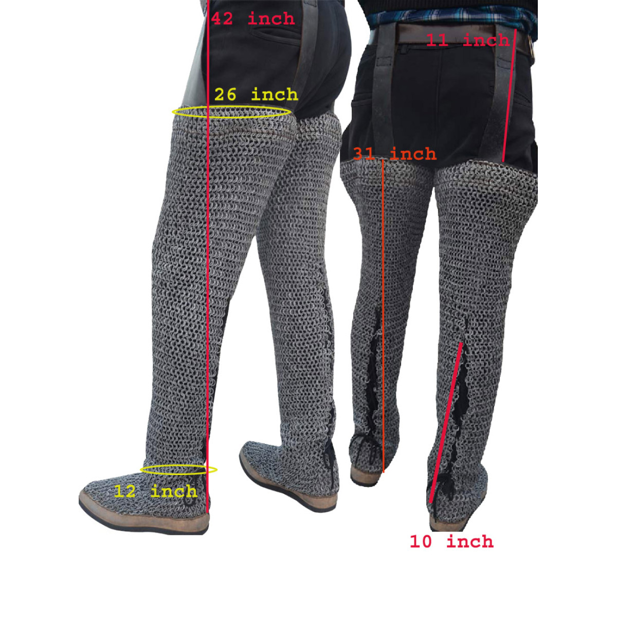 Key Features:Ring Size:16 Gauge 9 MM, Aluminum Full Flat Dome Riveted ChaussesWeave Type: European 4 in 1 Wire Type: AluminumDimension of Chain Mail ChaussesOverall Length from where you tie your belt to ankle(Outer Seam): 42 InchInseam : 31 inchesCircumference at Top (thigh): 26 InchBottom circumference (Ankle) - 12 inches Leather flaps at front side of the legthread to tie with belt Back slit 10 inches at back bottomSole Type: RubberShoe Size : Choose from additional options