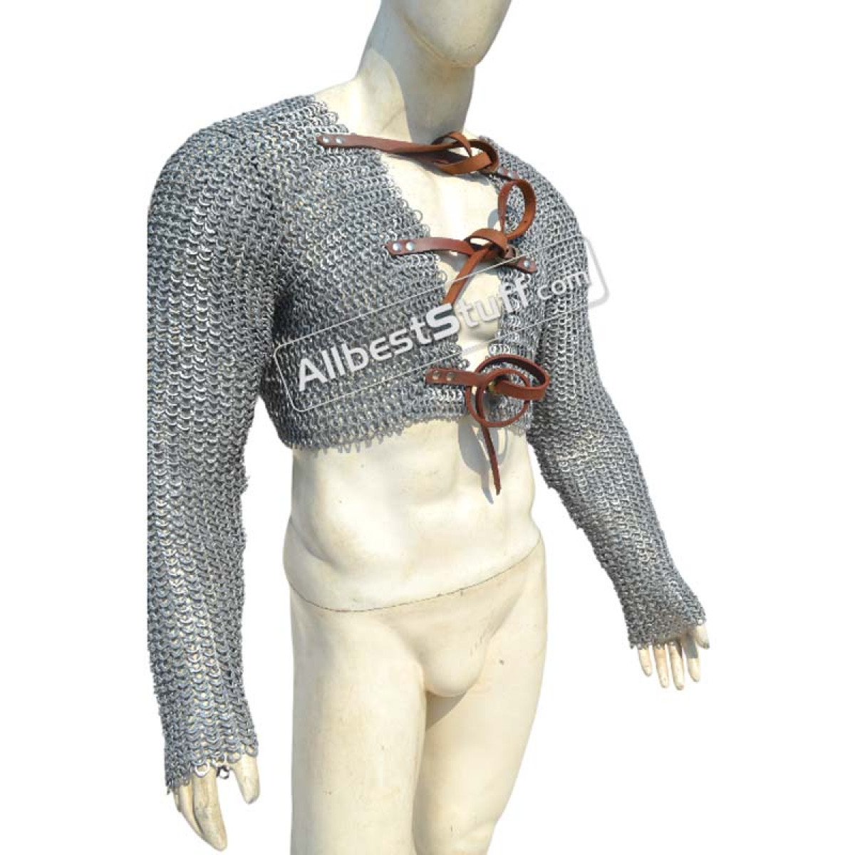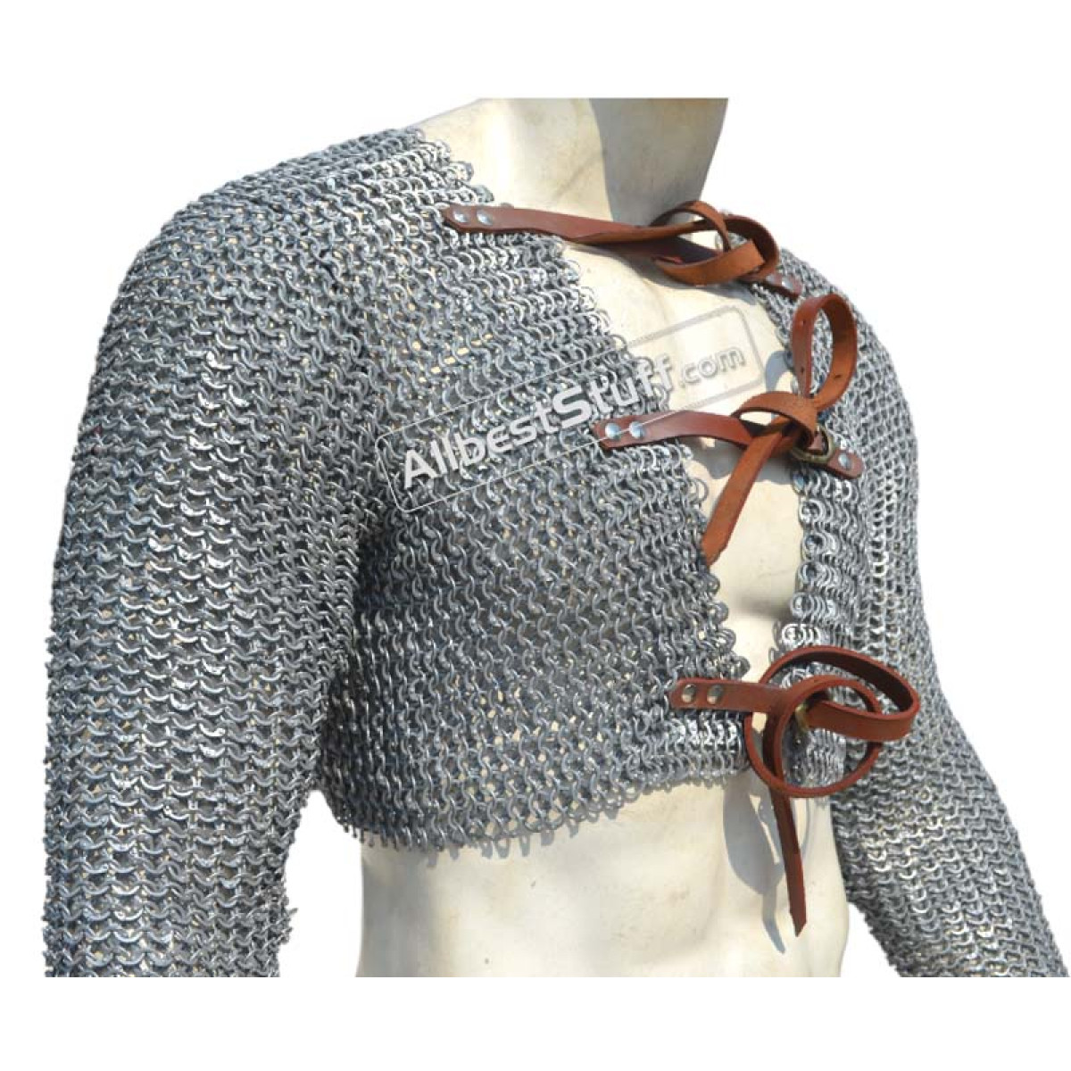 Ring Type: Aluminum 16 Gauge 9 MM Flat Dome RivetedMaterial: Made from Aluminum WireChest Size: 35-40 inches, the 2 pieces will give approx. 8-9 inches of chest and back coverage on each side03 Nos Leather fasteners to close the frontSleeve Style: Fully ClosedLength of Sleeve: 20 inches measured from under the armpit area to wristSleeve Circumference at Armpit: 20 inches (Default) choose preferred circumference from additional optionsOverall Length from Shoulder: 16 inchesFinish: 03 Finish to Choose From