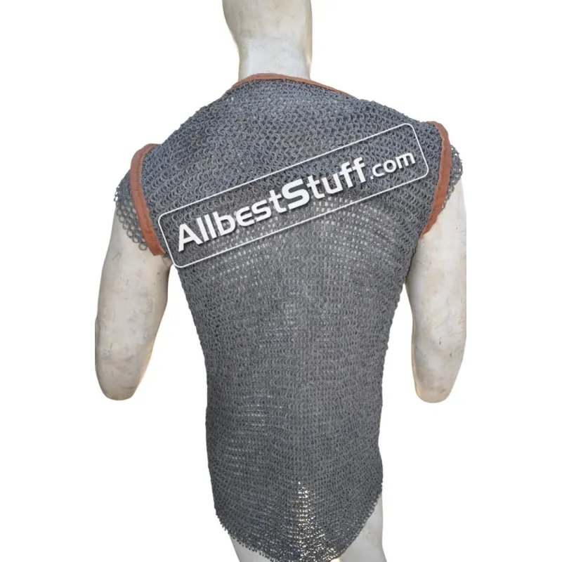 The Romans Maille hamata with shoulder doublet protection. Mail "Hamata" was generally worn by the Auxiliary troops, in the Empire Period; but legionaries also utilized it. Mail is particularly good as protection against slashing or blunt weapon attacks. This is a light weight Aluminum product that may requires fabric or arming gambeson underneath for maximum protection.