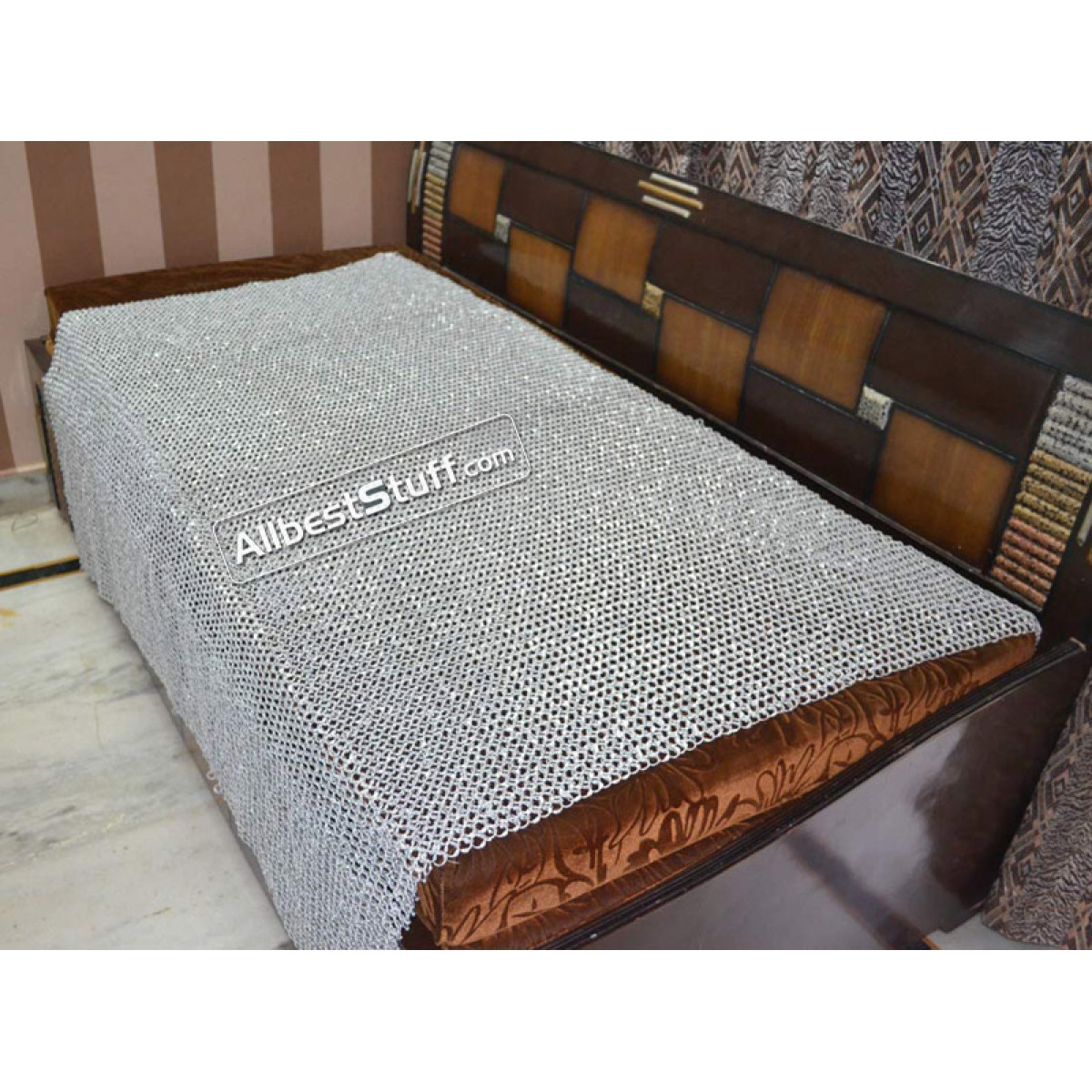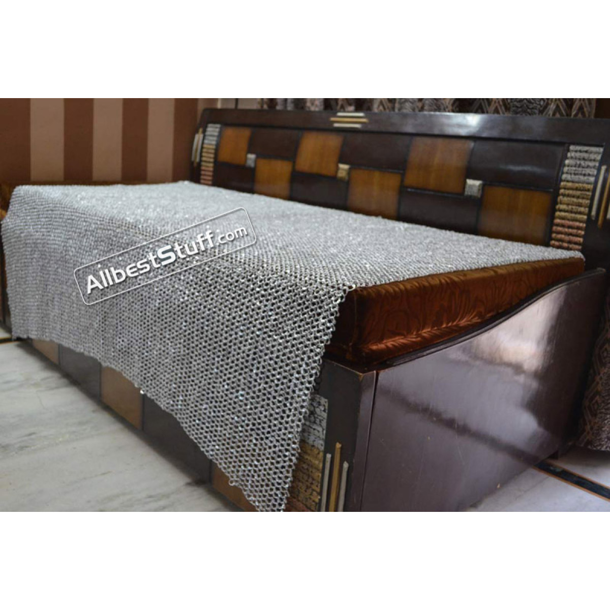 This Riveted Chainmail blanket is made in aluminum wire with 10 mm ring diameter, comfortable for a single bed, provide stable distributed weight while sleeping, we highly recommend that this product is not meant for small kids as the weight of the chainmail becomes uncomfortable. The approx. weight of this sheet is approx 18-19 lbs. Since aluminum generate dark residue when not properly finished we highly recommend to opt for clean "Silver Anodized" finish for this blanket suitable for long term use and your bedsheet and other clothing will remain spotless.