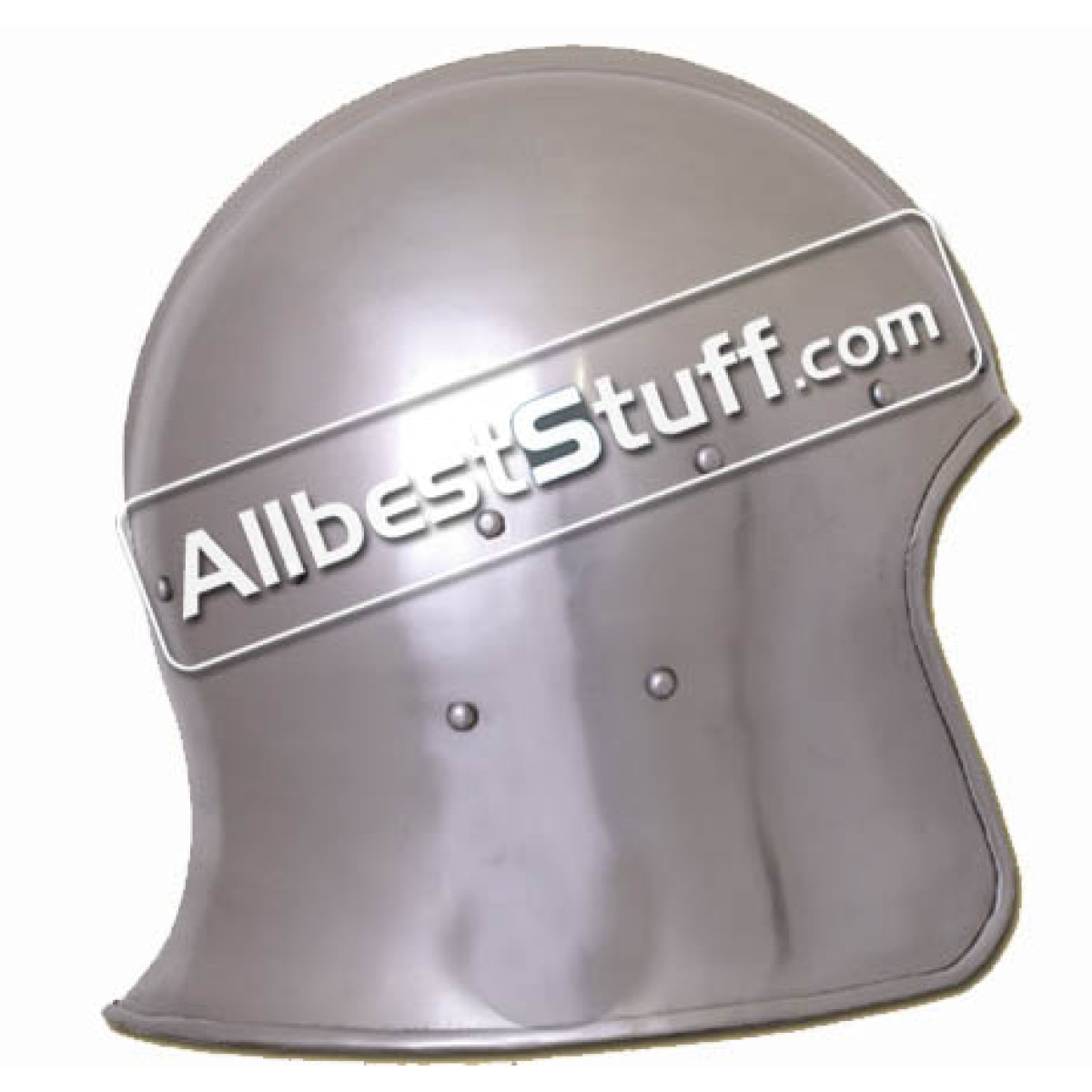 This helmet replaced the bascinet in Italy, western and northern Europe and some parts of eastern Europe during the mid 15th century. This helmet was very popular in Germany and would evolve into many different styles. The style we have chosen to represent here is very similar to the Italian Barbute and the two styles were very similar. If you chose this helmet you would be very secure in your depiction for almost all of the 15th century.