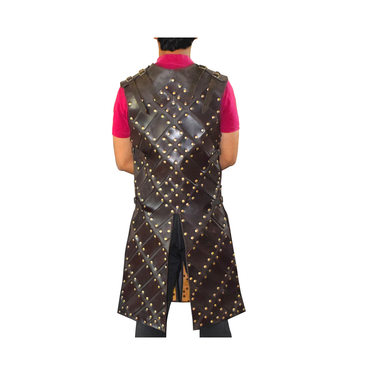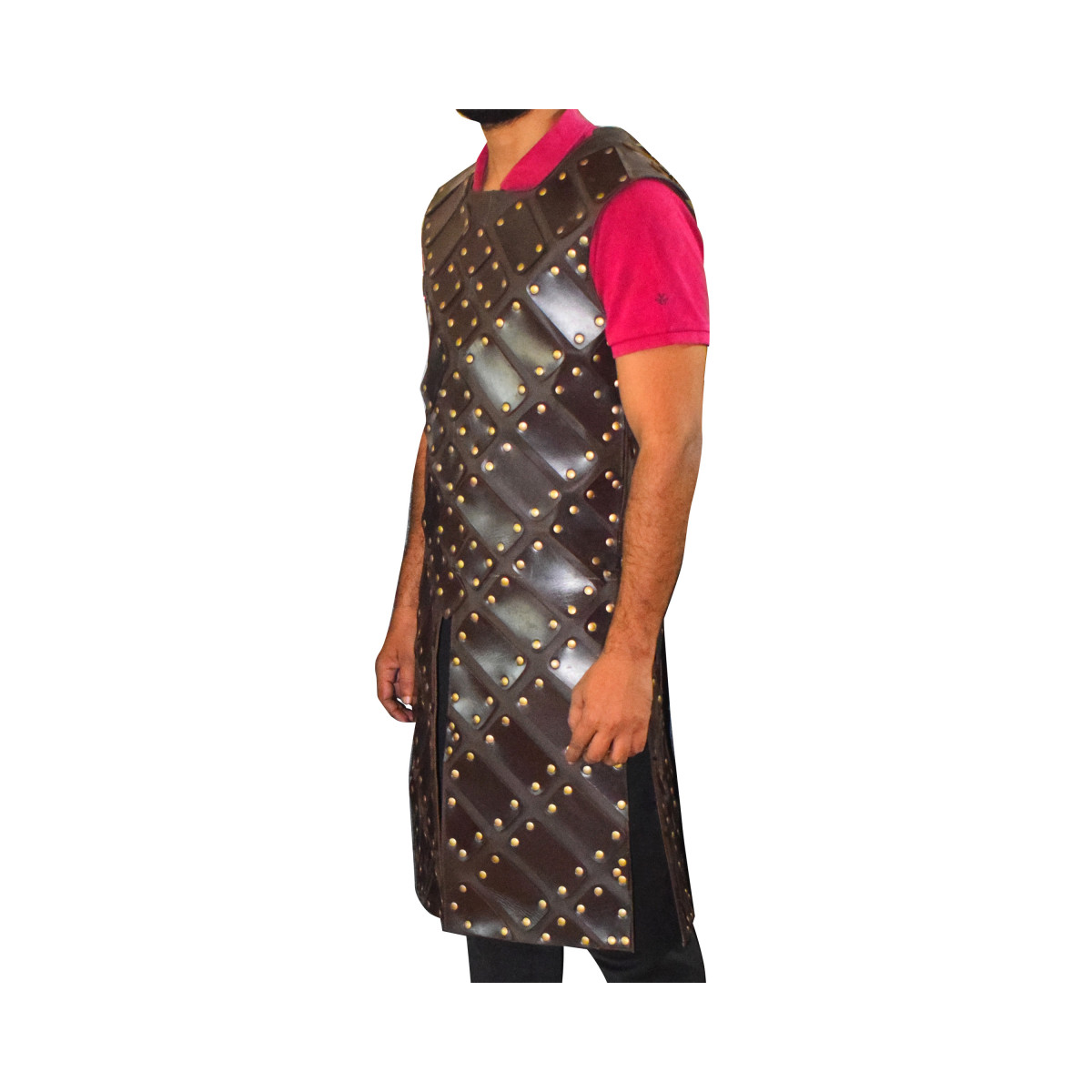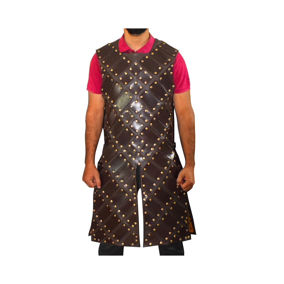 SpecificationsMaterial: High-grade faux leather and metal rivets.Color: Black (matte finish).Vest Length: Covers torso down to the hips for optimal protection.Weight: Approx. 3–4 kg (set weight).Finish: Water-resistant and easy to maintain.Care Instructions: Wipe clean with a damp cloth; avoid direct heat or prolonged sunlight exposure.Equip yourself with the Black Leather Brigandine Armour and exude the charisma of a medieval warrior, while enjoying the comfort and functionality it offers.