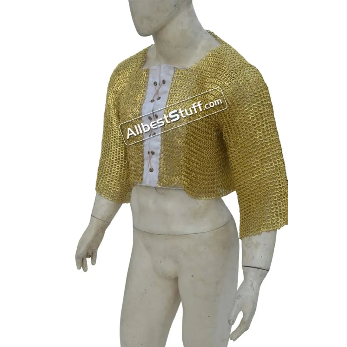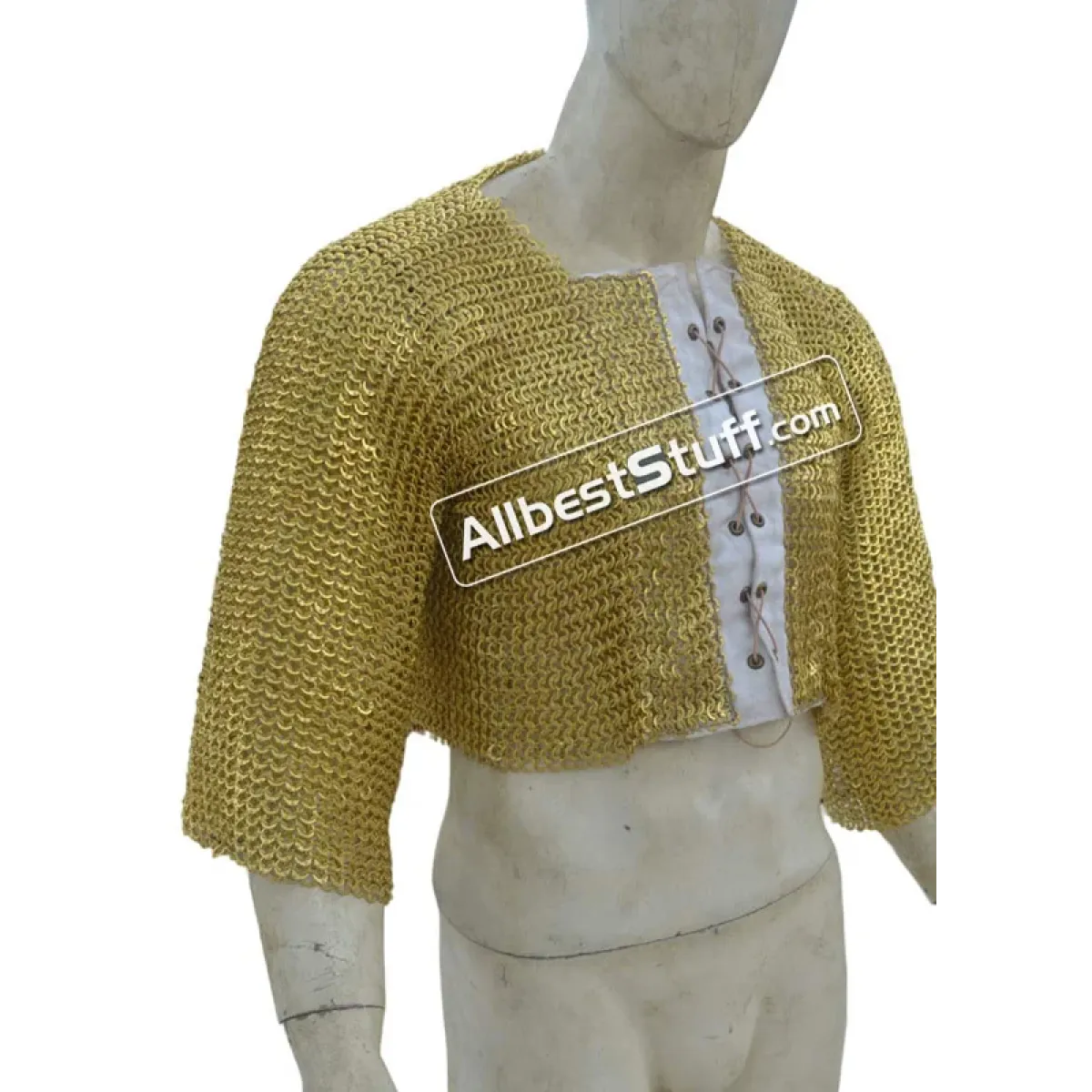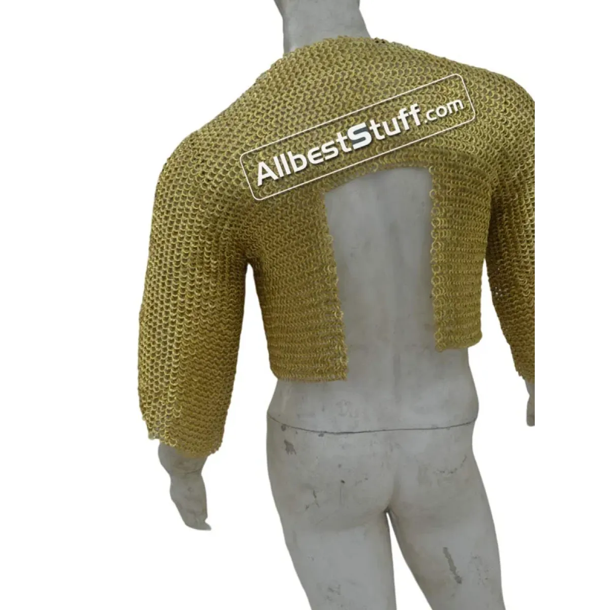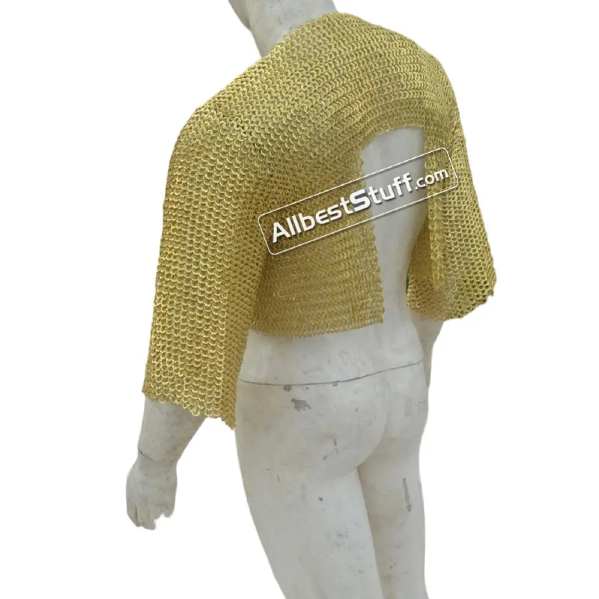 Half Length Chainmail voider made in Solid Brass wire. Ring composition 17 Gauge 8 MM Flat fully riveted product made by our skilled artisan. Sealed with Dome / Pin Rivets made from brass wire. Mid Length Sleeve of 12 inches. This type of voider is worn to protect the arms and shoulders of a medieval warrior, It provides protection against cuts and stabs from weapons like swords and daggers, as well as against the impact of blunt force. It is an important piece of armor for medieval warriors, as it provided crucial protection to one of the most vulnerable areas of the body during fighting.