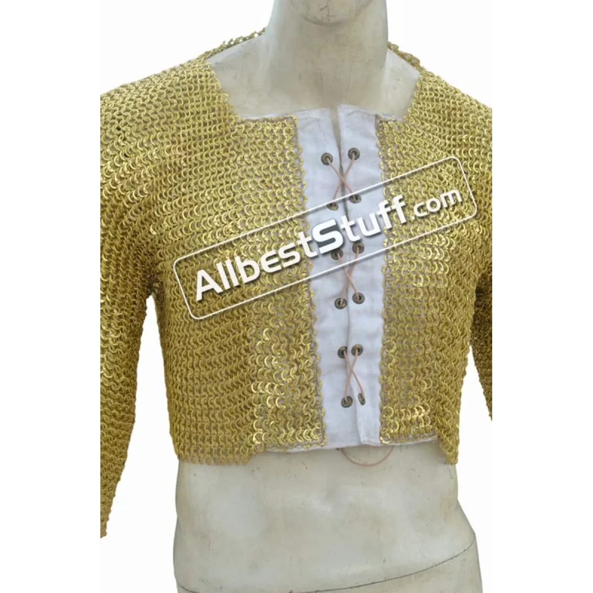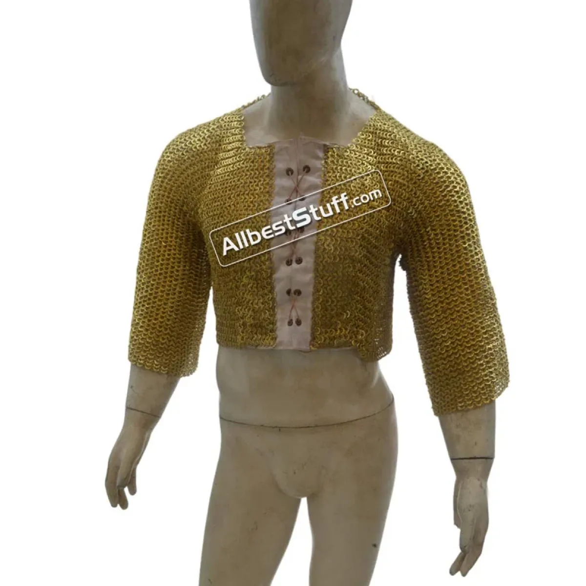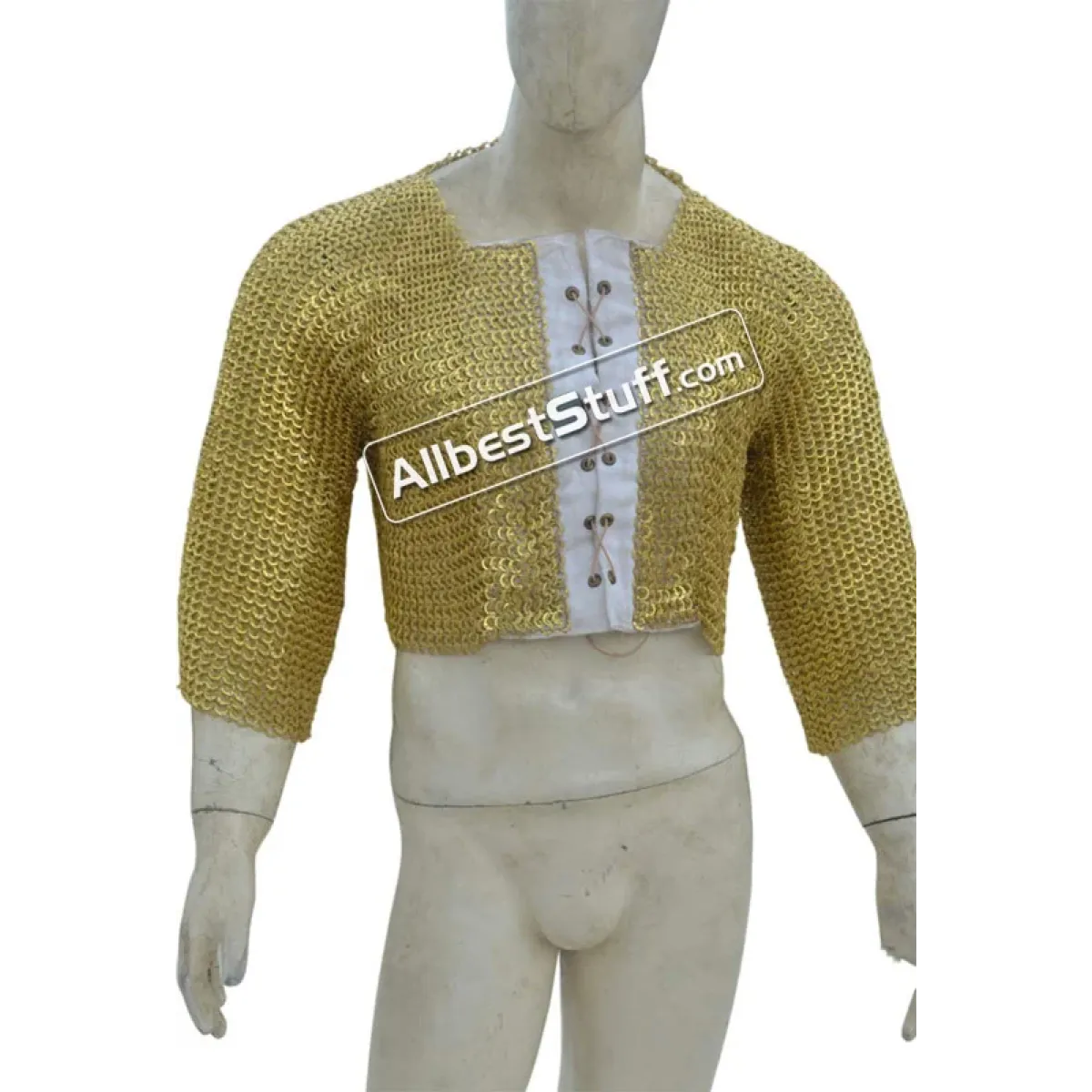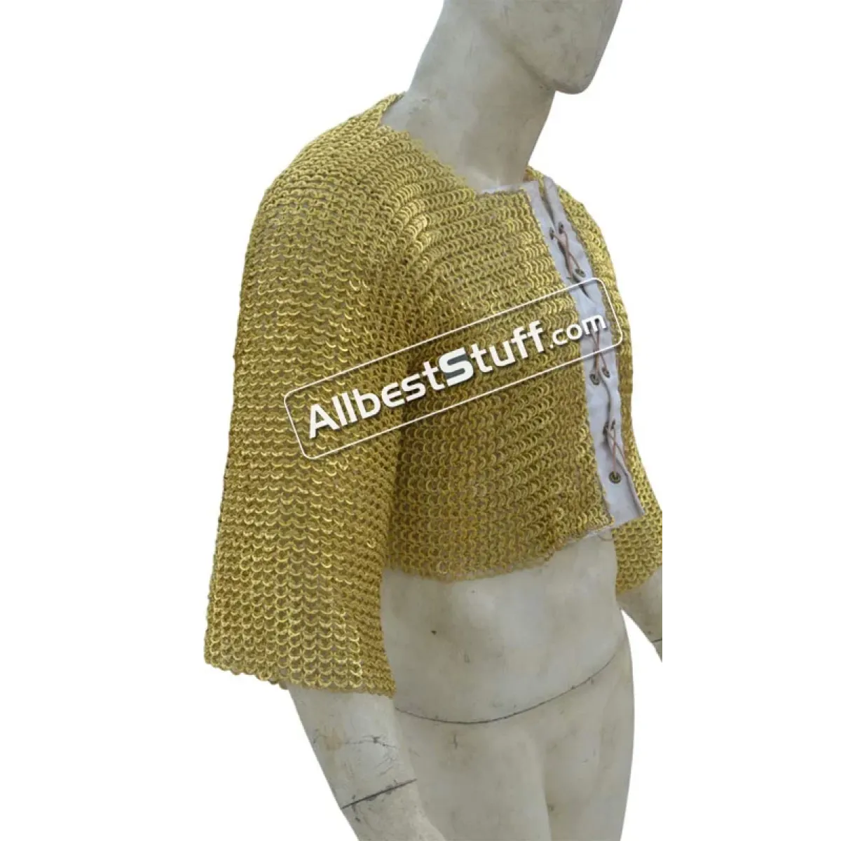 Half Length Chainmail voider made in Solid Brass wire. Ring composition 17 Gauge 8 MM Flat fully riveted product made by our skilled artisan. Sealed with Dome / Pin Rivets made from brass wire. Mid Length Sleeve of 12 inches. This type of voider is worn to protect the arms and shoulders of a medieval warrior, It provides protection against cuts and stabs from weapons like swords and daggers, as well as against the impact of blunt force. It is an important piece of armor for medieval warriors, as it provided crucial protection to one of the most vulnerable areas of the body during fighting.