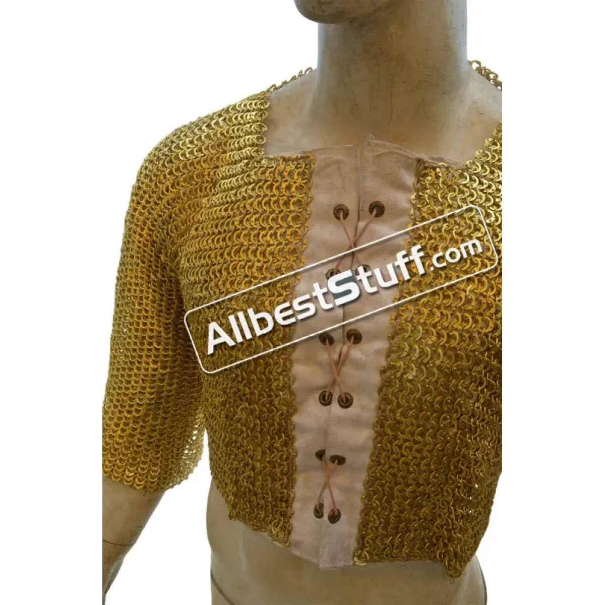Ring Type: 17 Gauge 8 MM Brass Full Flat Dome / Pin Riveted RingMaterial: Made from Solid Brass WireProduction Chest: 48-49 inches, comfortable fit for 43-44 inches actual chest with padding underneathfront close with opening of 4-5 inches backed up by linen fabric (attached picture) laces to close the frontSleeve Style: Fully ClosedLength of Sleeve: 12 inches measured from under the armpit area to wrist Sleeve Circumference at Armpit: 21 inches, with Armpit Gusset installedOverall Length from Shoulder: 17 inchesCut at the back will be adjusted and may vary as per the overall chest circumference.Finish: 02 Finish to choose from