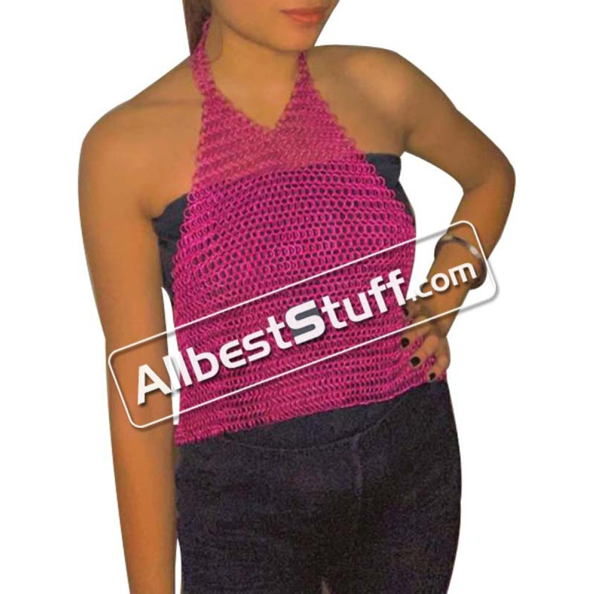 Modern Chainmail top with unique design and style, completely backless this is rather long front covering and simultaneously revealing suitable for ladies who are comfortable in flaunting their bodies through a bold style statement. Made with light weight aluminum rings in 8 mm ring size with Pink finish. Suitable for an adult age group only.