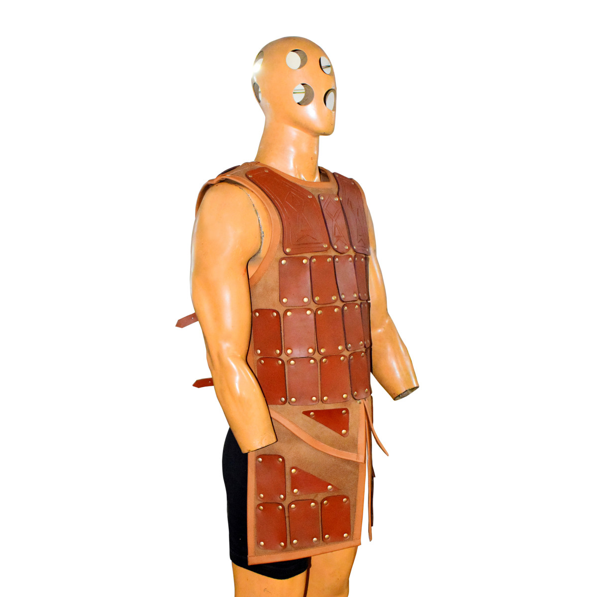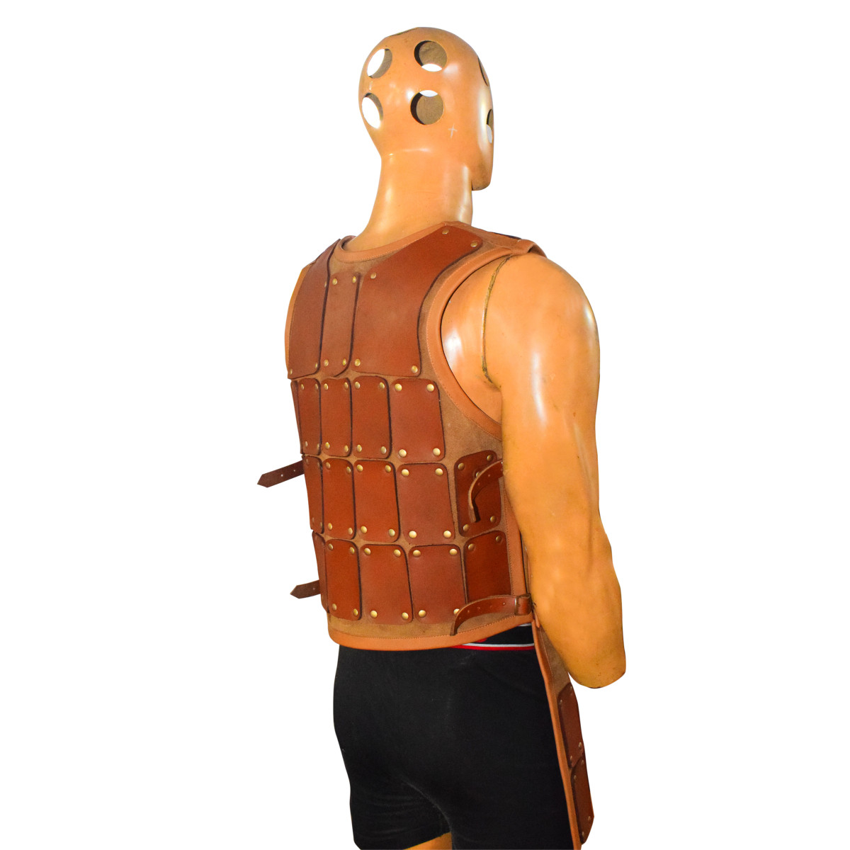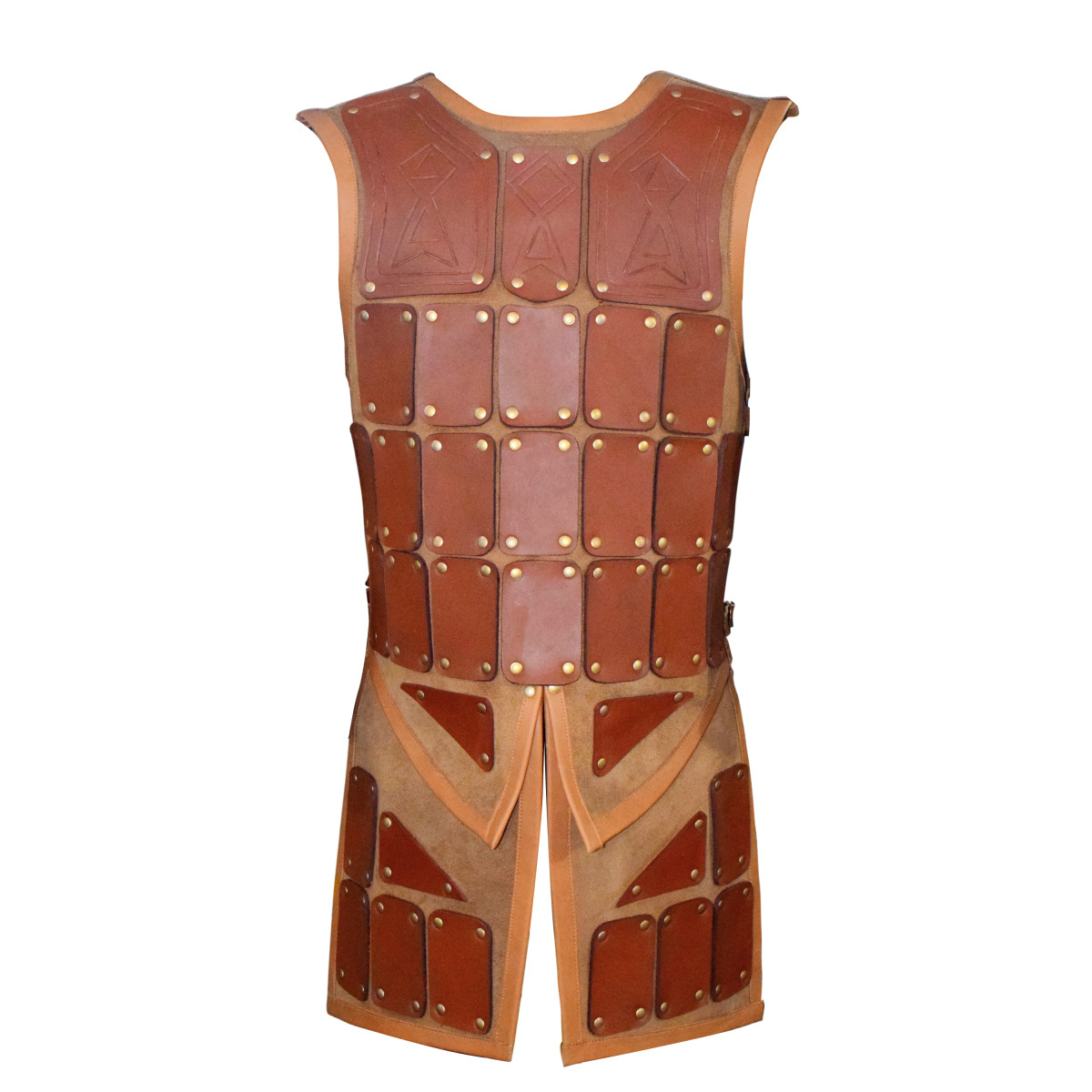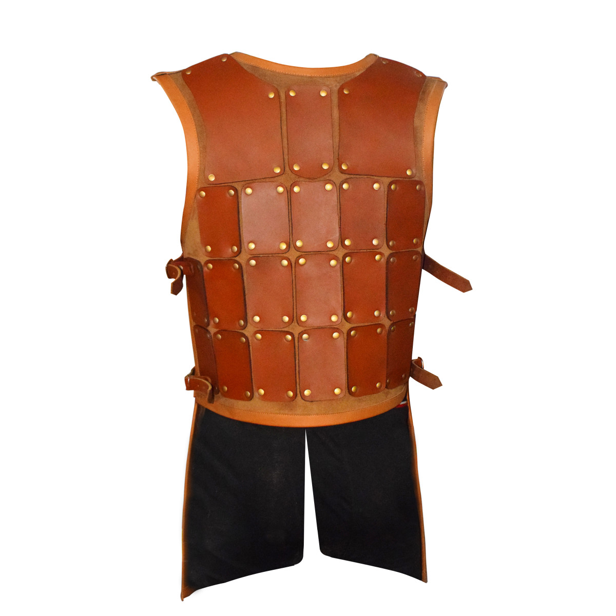 FeaturesAuthentic Brigandine Design: Inspired by medieval knight armor, with riveted leather plates for durability and aesthetic appeal.Premium Quality Materials: Made from high-grade leather with brass rivets for a strong and elegant finish.Adjustable Fit: Side straps with buckles provide a customizable fit for various body types.Mobility and Comfort: Sleeveless design allows unrestricted movement during battle or roleplay.Versatile Use: Perfect for LARP, Renaissance fairs, cosplay, and theatrical performances.