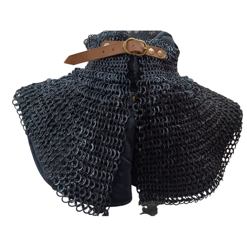 Riveted Chainmail Standard with Neck Covering made with 2 types of ring diameter 6 mm (Neck Covering) and 9 mm (mantle). This piece still uses the same quality materials and finishing techniques to create a refined piece of armor. All of the chainmail rings on this standard are made from mild steel. Closed by one brass buckle at the back of the neck, available in 2 types of finish.
