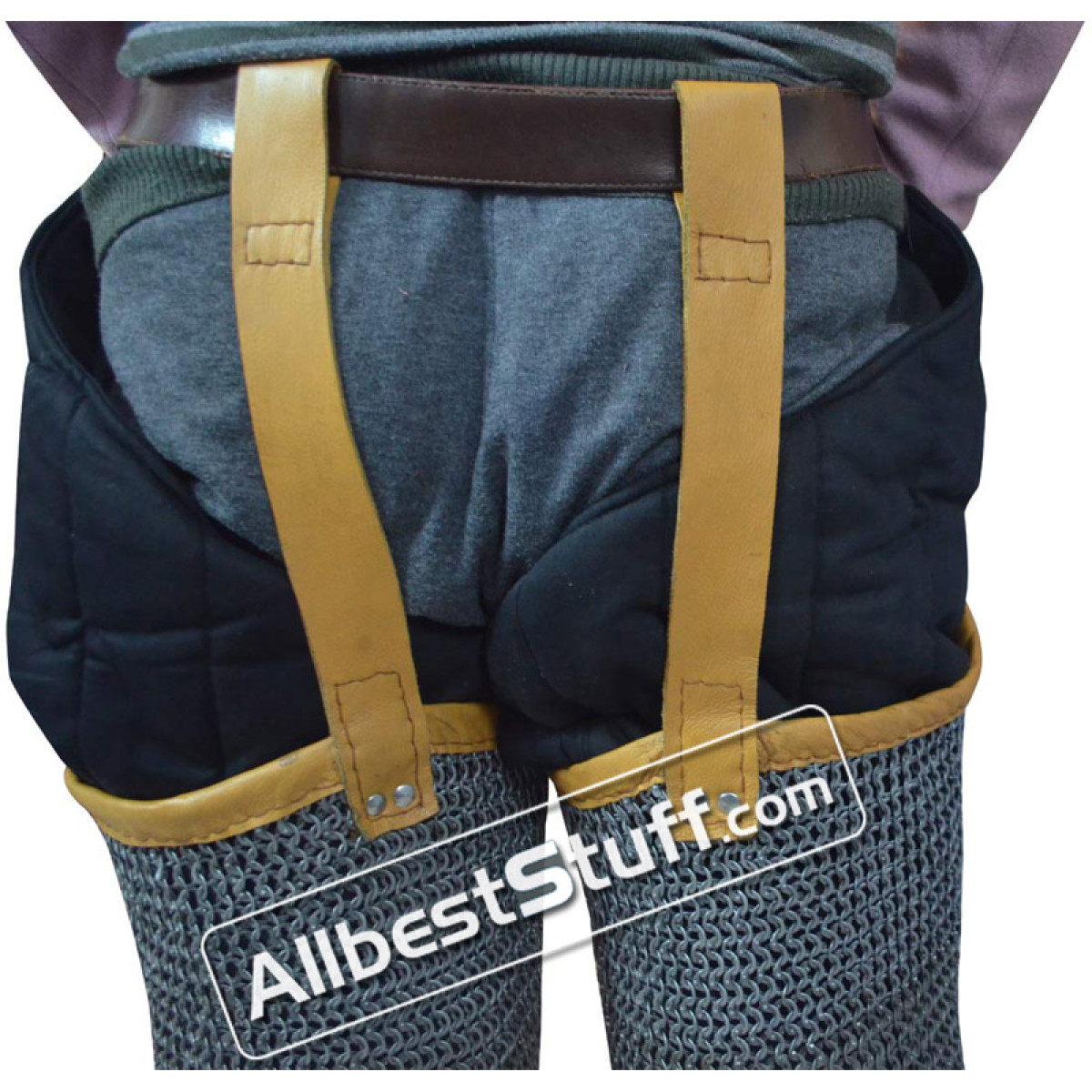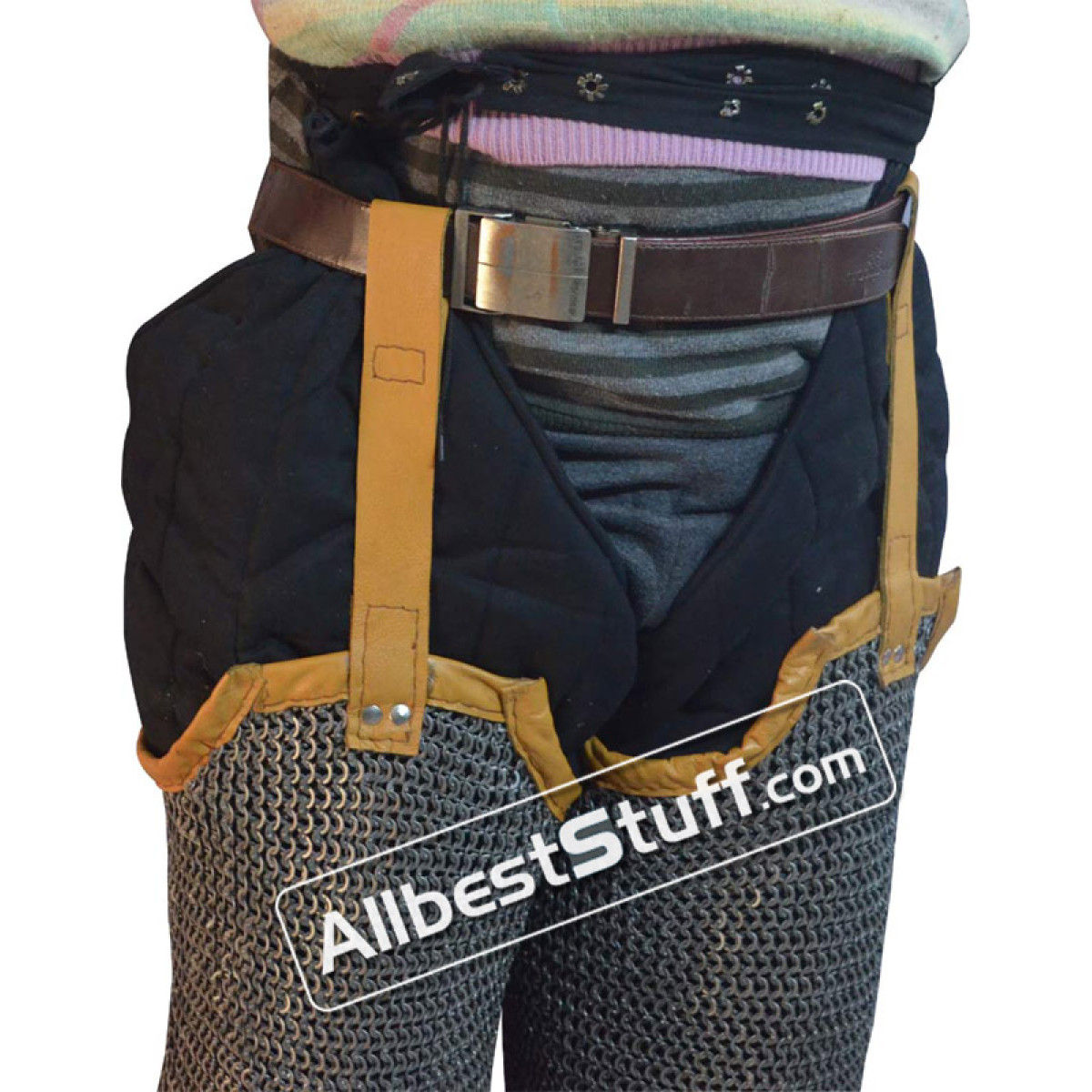 Two pieces of thick leather is stitched on top of the thigh circumference, the leather threads can be tied to your waist belt. Over all this legging has complete appearance of the medieval era and feels closer to the historical versions.