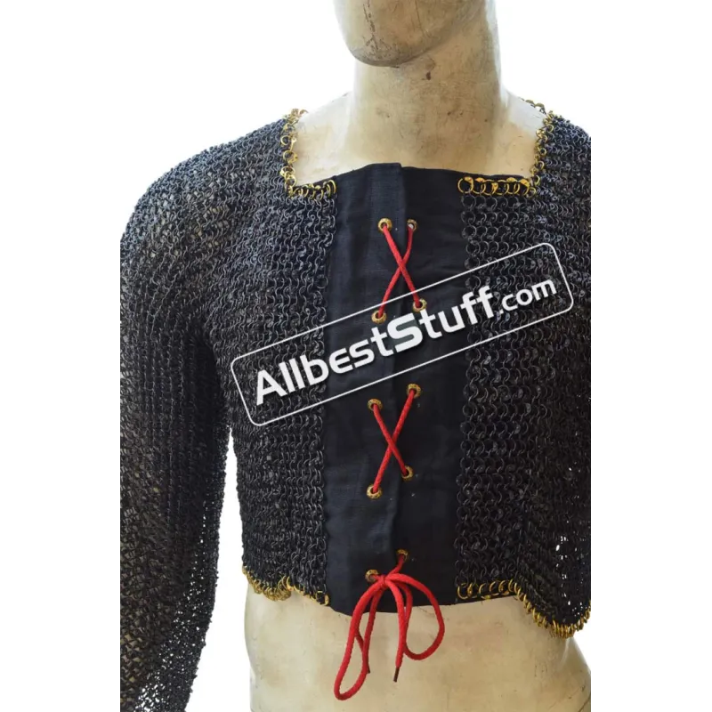 Ring Type: 17 Gauge 8 MM Full Round Dome Pin Riveted RingMaterial: Made from Mild Steel WireChest Size: 50 inches, comfortable fit for 45 inches with padding underneathfront close with opening of 4-5 inches backed up by linen fabric (attached picture) laces to close the front.Sleeve Style: Fully ClosedLength of Sleeve: 17 inches measured from under the armpit area to wrist Sleeve Circumference at Armpit: 22 inches Overall Length from Shoulder: 17 inchesCut at the back will be adjusted and may vary as per the overall chest circumferenceFinish: 03 Finish to choose from