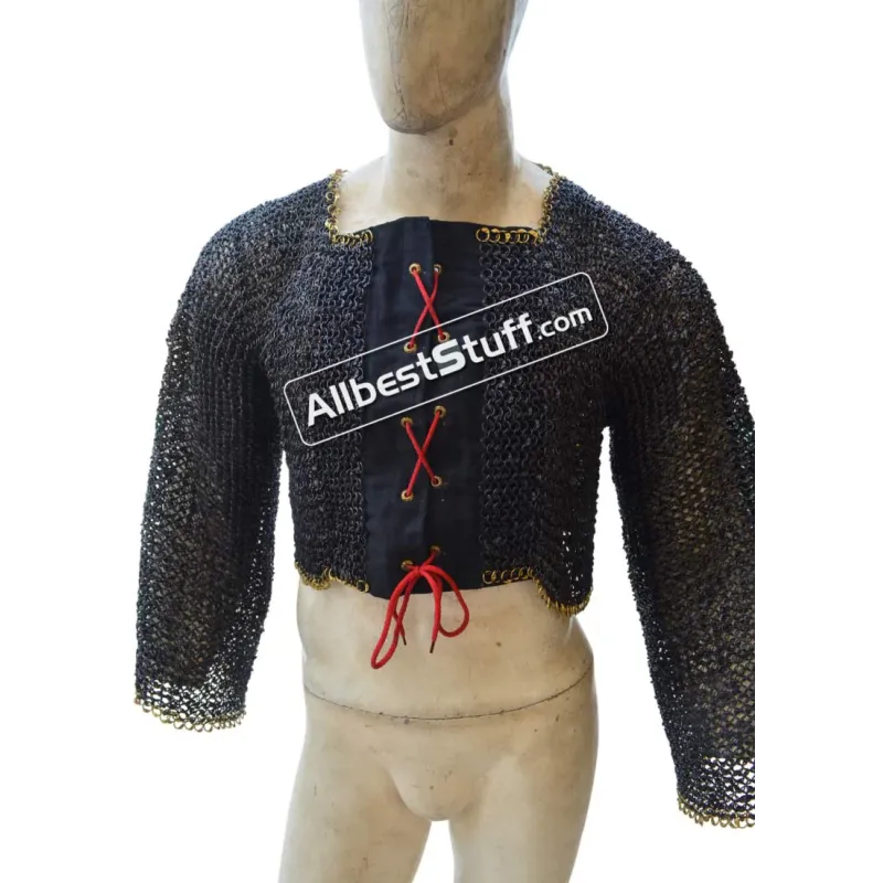 Half Length Chainmail voider made in 8 MM 17 Gauge Full Round Dome Pin Riveted ring. Mid Sleeve Length of 17 inches. This type of voider is worn to protect the arms and shoulders of a warrior, worn under a plate armor or a gambeson. It provided protection against cuts and stabs from weapons like swords and daggers, as well as against the impact of blunt force. It is an important piece of armor for medieval warriors, as it provided crucial protection to one of the most vulnerable areas of the body during fighting.