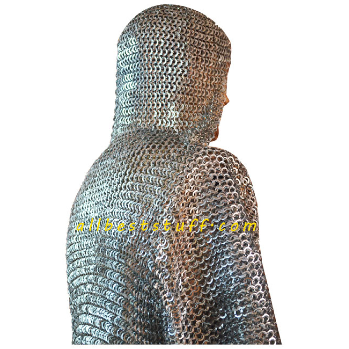 This is a lot of 03 nos Mild Steel Chain Mail with 8 mm ring circumference Shirt & Coif set. Coif is integrated in the shirt and gives best overall outlook in Chain Mail Shirt & Coif category. The shirt has long sleeves of 25 inches under tapered narrower at wrist. Long length of 43 inches makes it a perfect armor for a tall strong Viking. This is a special listing for wholesale buy of 3 same size shirt when you select quantity 1 in your cart you get 3 shirts on single purchase with a total combined packed weight of approx. 52 Kgs. Hand weaved 18 Gauge mild steel rings give good protection during fighting events. Chain mail is made from combination of one flat riveted and alternate sold ring pattern, one flat ring is punched to be sealed with mushroom rivet and second flat is a solid complete ring. Please read the measurements very carefully as this type of clothing do not stretched much and require few extra inches for comfort & long term use.