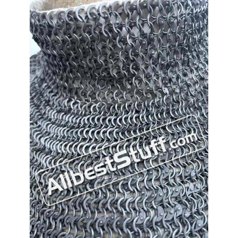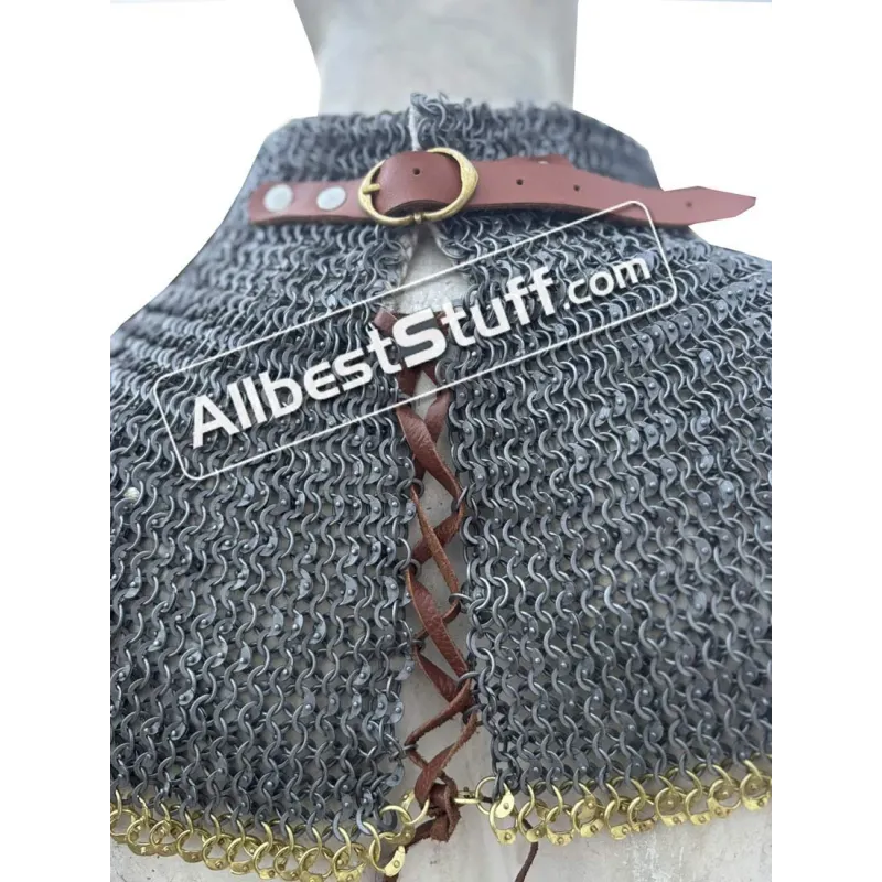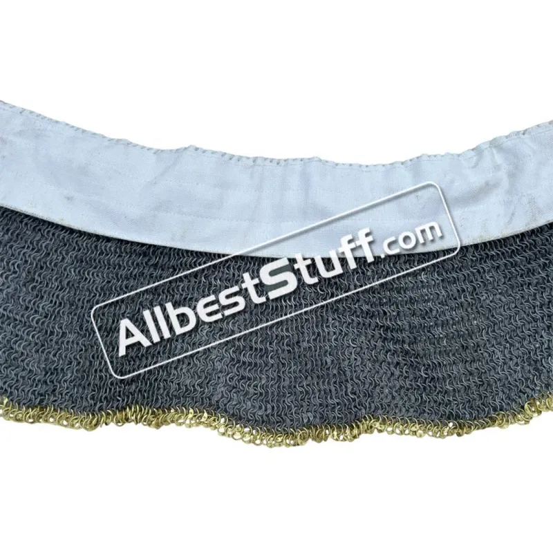 Chain Mail Gorget for neck covering made from 18 Gauge 6 mm steel usually worn over a padded coat or jacket. Combination of 1 dome riveted ring and alternate solid ring. The Gorget can be closed in the back using 1 leather fasteners. Over all length of approx. 8 inches inclusive 2.5 inches of neck covering. You can optionally add solid brass rows for superior looks or a linen padding for neck comfort at a little additional cost. Dimensions: Ring Size: 18 Gauge 6 mm, One Round Dome Riveted Ring with Alternating Flat SolidMaterial: Made from Mild Steel WireNeck Circumference: 21-22 inchesLength: 8 inches approx01 Leather fastener to close the NeckTwo finish to choose from