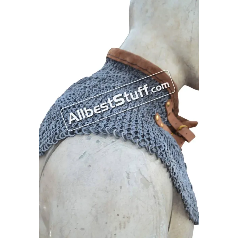 Popular 6 MM Flat Riveted with Alternating Solid Ring Maille Collar available in choice of 2 finish. *** The Solid brass lines in the picture are not part of listing original price and have to be added through additional options.Dimensions: Ring type; 18 Gauge 6 mm Flat Riveted with Alternating Solid RingNeck Circumference (opening): 27 inches, supported by 2 buckles to adjust it to the neck and padding if any.Approx. Length: 10-11 inchesBottom Circumference: 45 inchesFinish: Two finish to choose fromLeather edging with two brass buckle