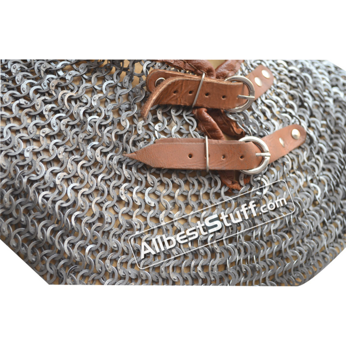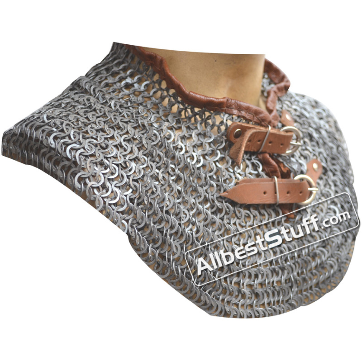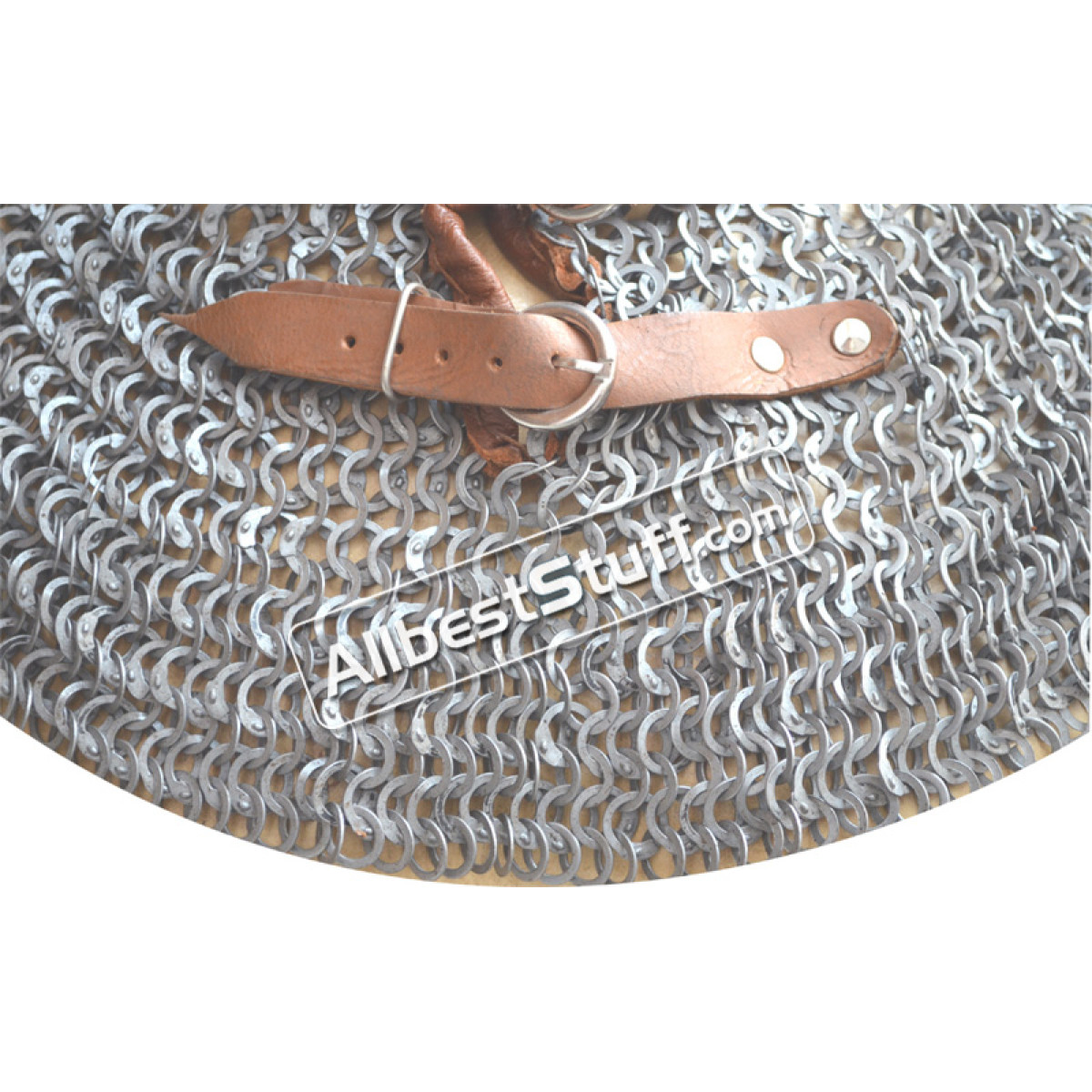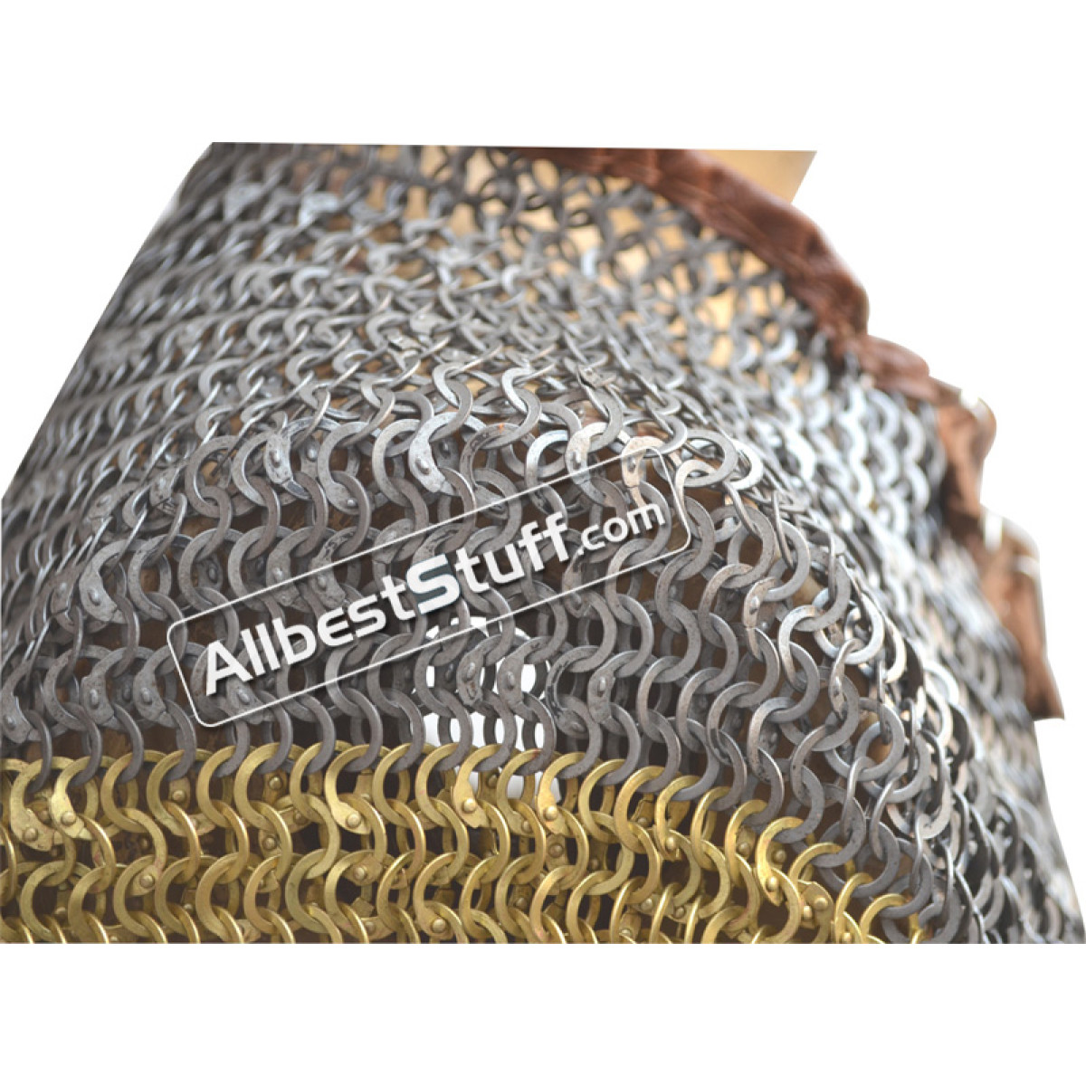 Popular Flat Wedge Riveted with Alternating Solid Ring Maille Collar available in choice of 2 finish. *** The Solid brass lines in the picture are not part of listing original price and have to be added through additional options.Dimensions: Ring type: 18 Gauge 9 mm Flat Wedge Riveted with Alternating Solid Ring Neck Circumference (opening): 27 inches, supported by 2 buckles to adjust it to the neck and padding if any.Length: 7-8 inches approx.Bottom Circumference: 45-50" approx.Finish: Two finish to choose fromLeather edging with two brass buckle