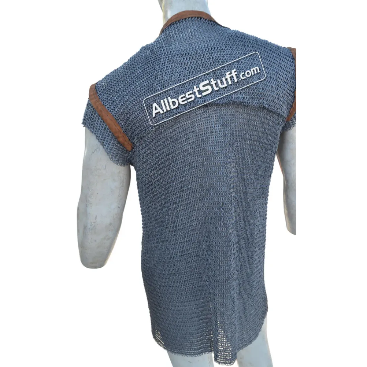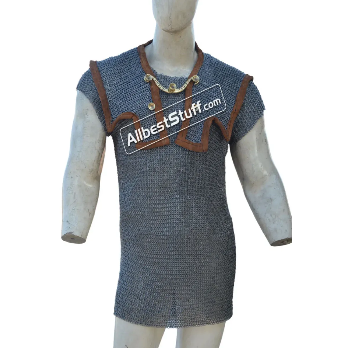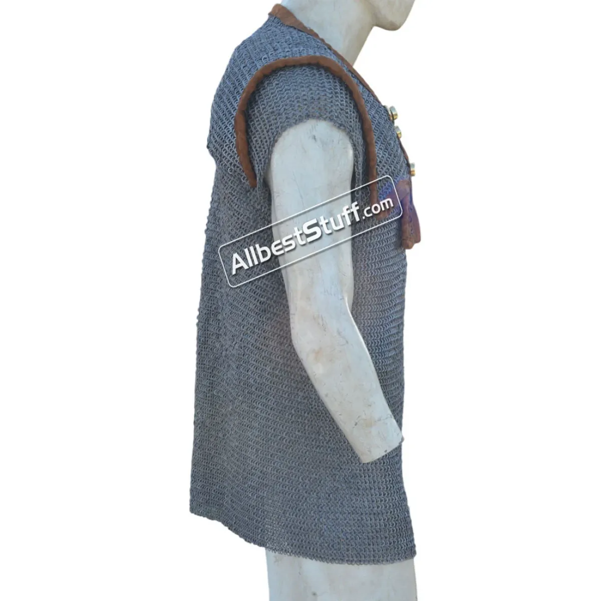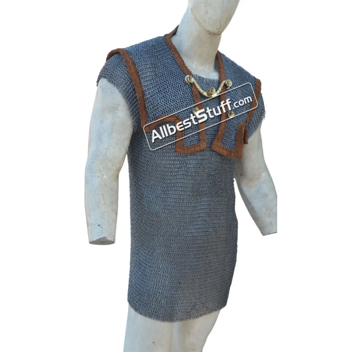 The Romans Maille hamata with shoulder doublet protection. Mail "Hamata" was generally worn by the Auxiliary troops, in the Empire Period; but legionaries also utilized it. Mail is particularly good as protection against slashing or blunt weapon attacks. This is a Mild Steel product that may requires fabric or arming gambeson underneath for maximum protection.