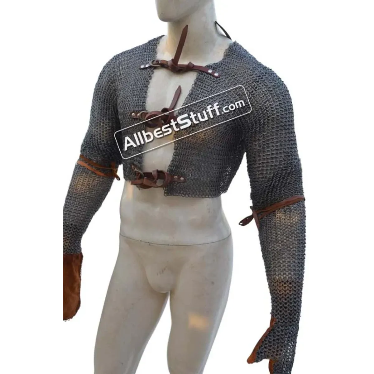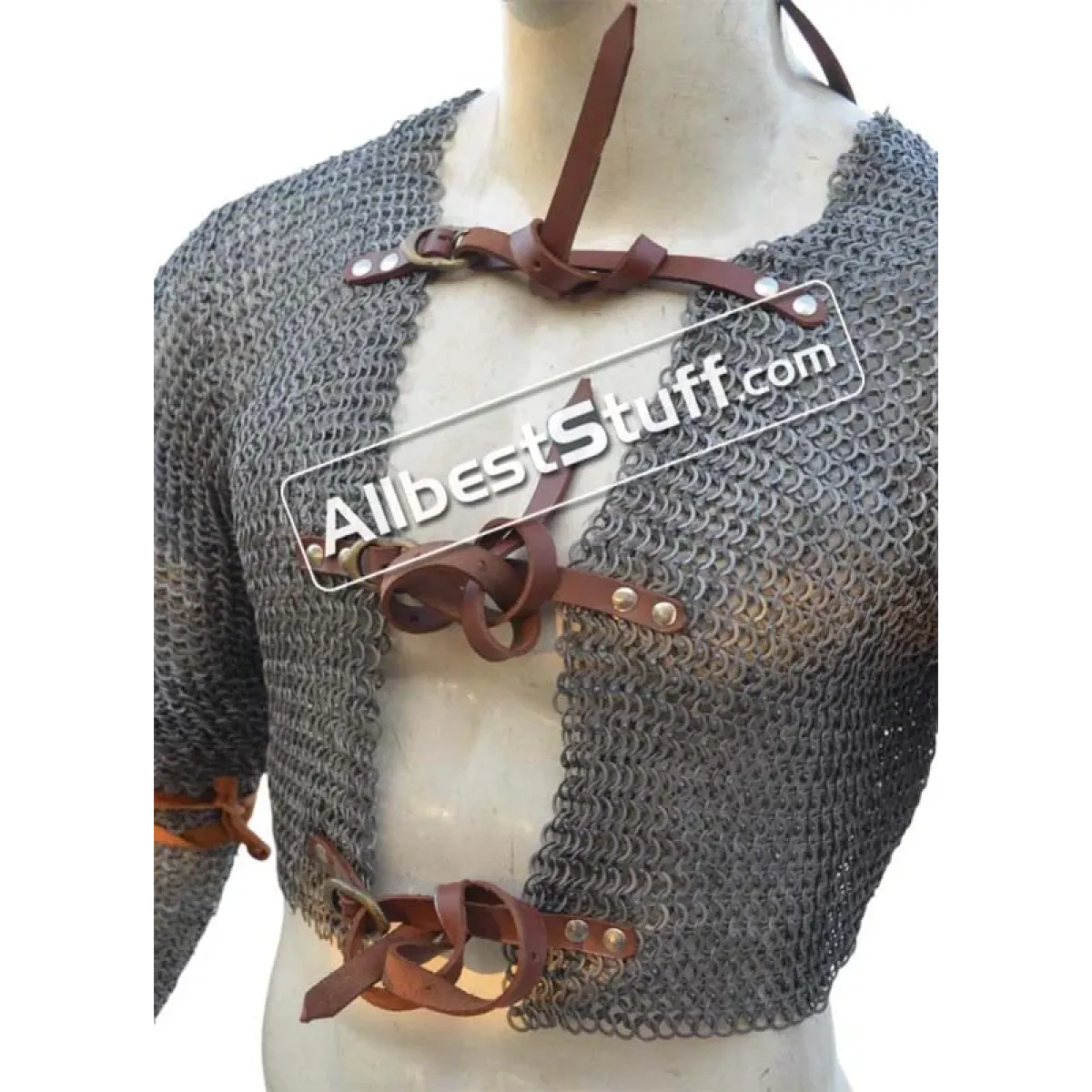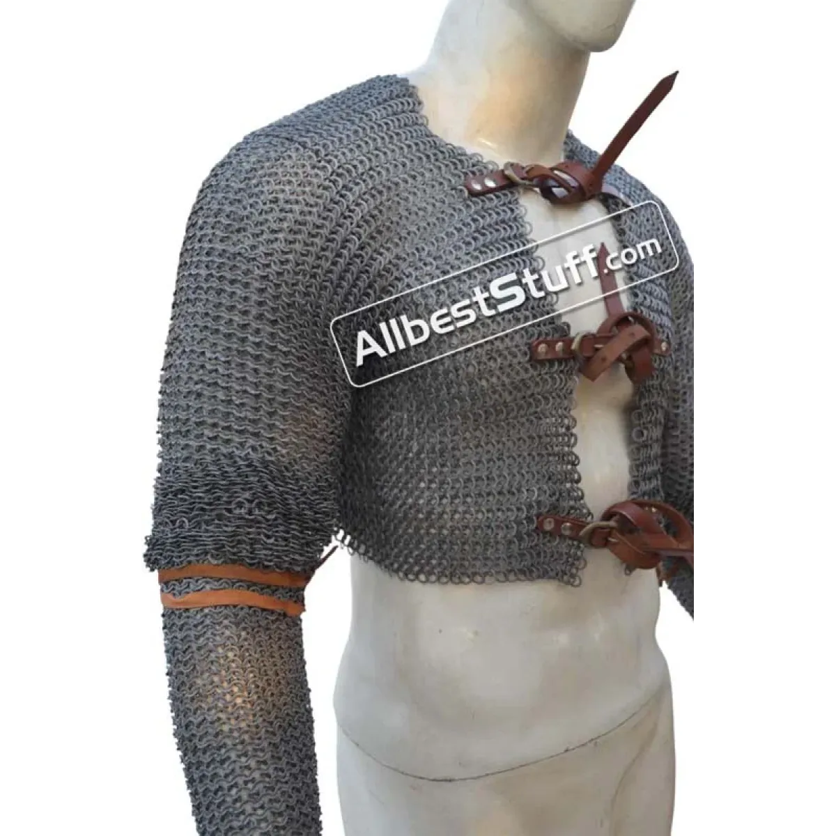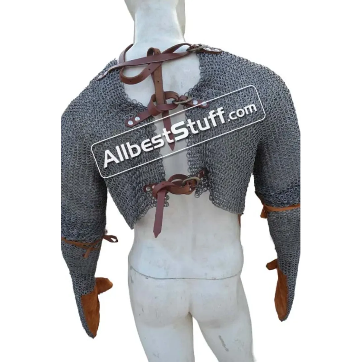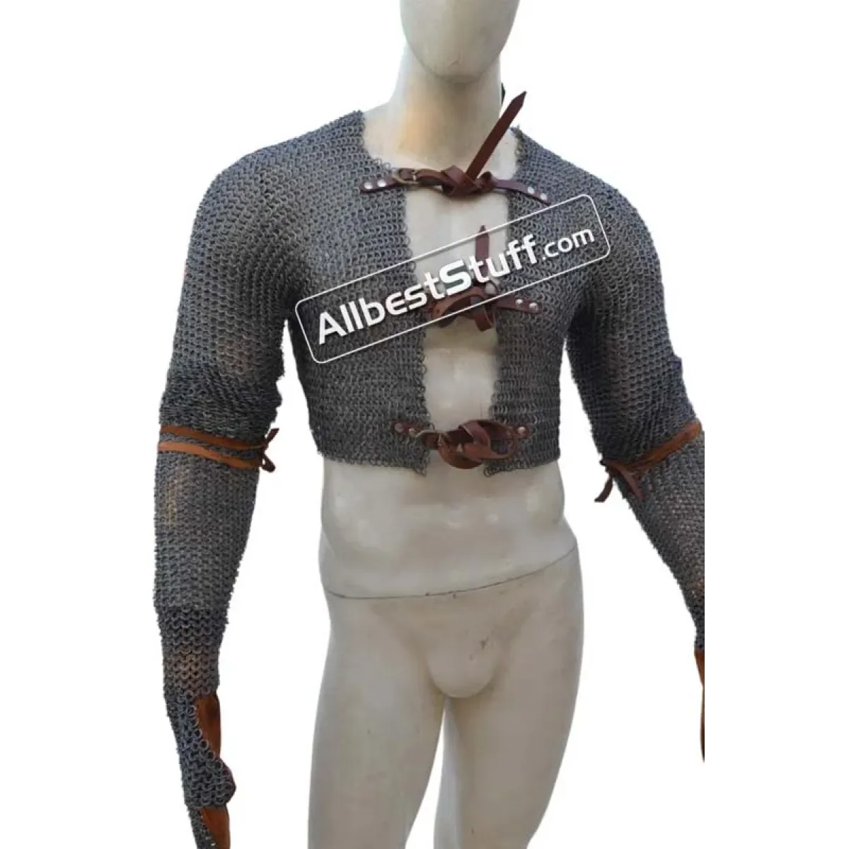 Specifications:Ring Type: 18 Gauge 8 MM Flat Dome Riveted Ring with alternating solid ringMaterial: Made from Mild Steel WireChest Size: 35-40 inches, the 2 pieces will give approx. 8-9 inches of chest and back coverage on each side03 Nos Leather fasteners to close the front.Sleeve Style: Fully ClosedLength of Sleeve: 20 inches measured from under the armpit area to wristSleeve Circumference at Armpit: 20 inches (Default) choose preferred circumference from additional optionsOverall Length from Shoulder: 16 inchesFinish: 03 Finish to choose from
