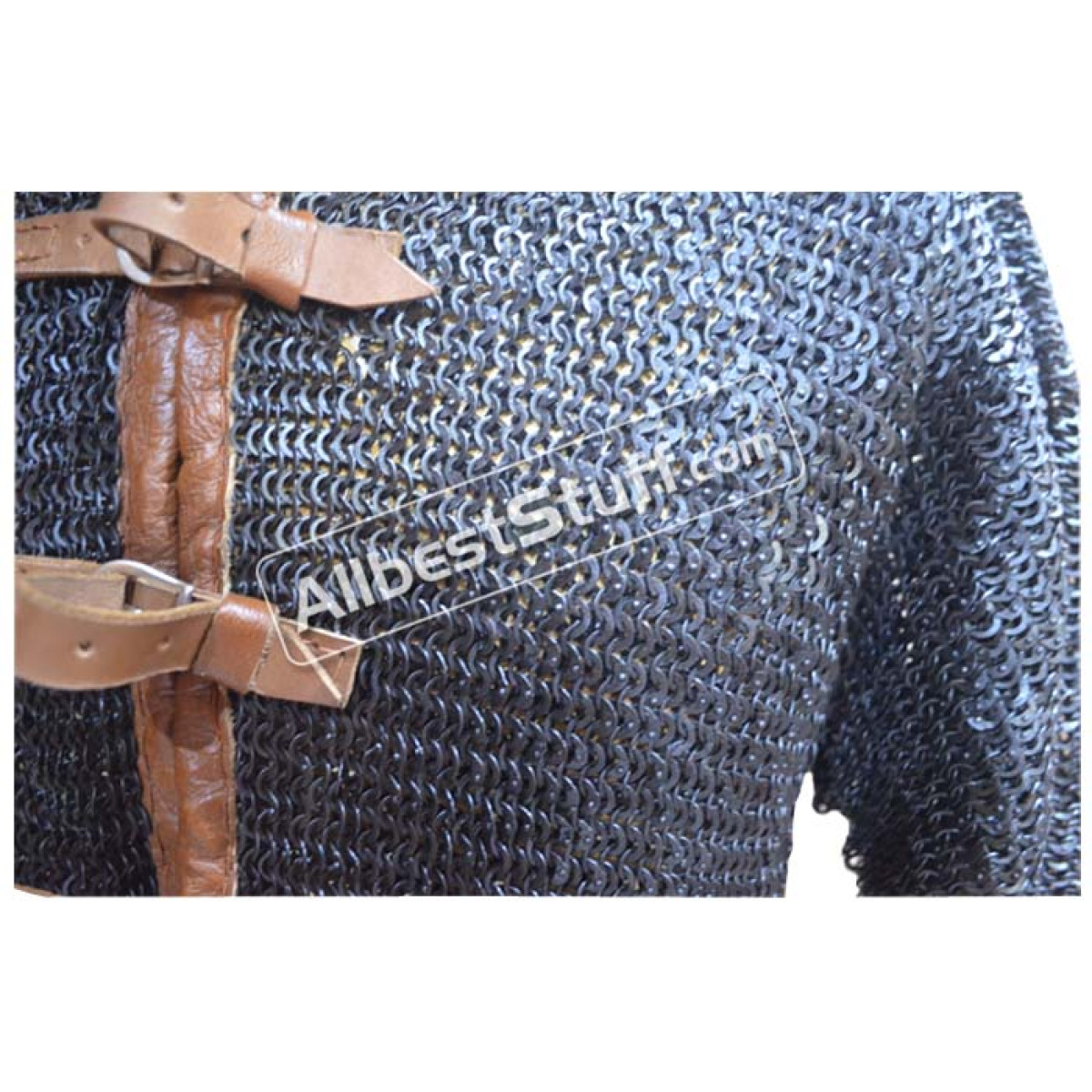 Maille Half Shirt made in Flat Riveted Solid combination, A short size chain mail with mid stomach length, front leather fastener with Brass buckle.