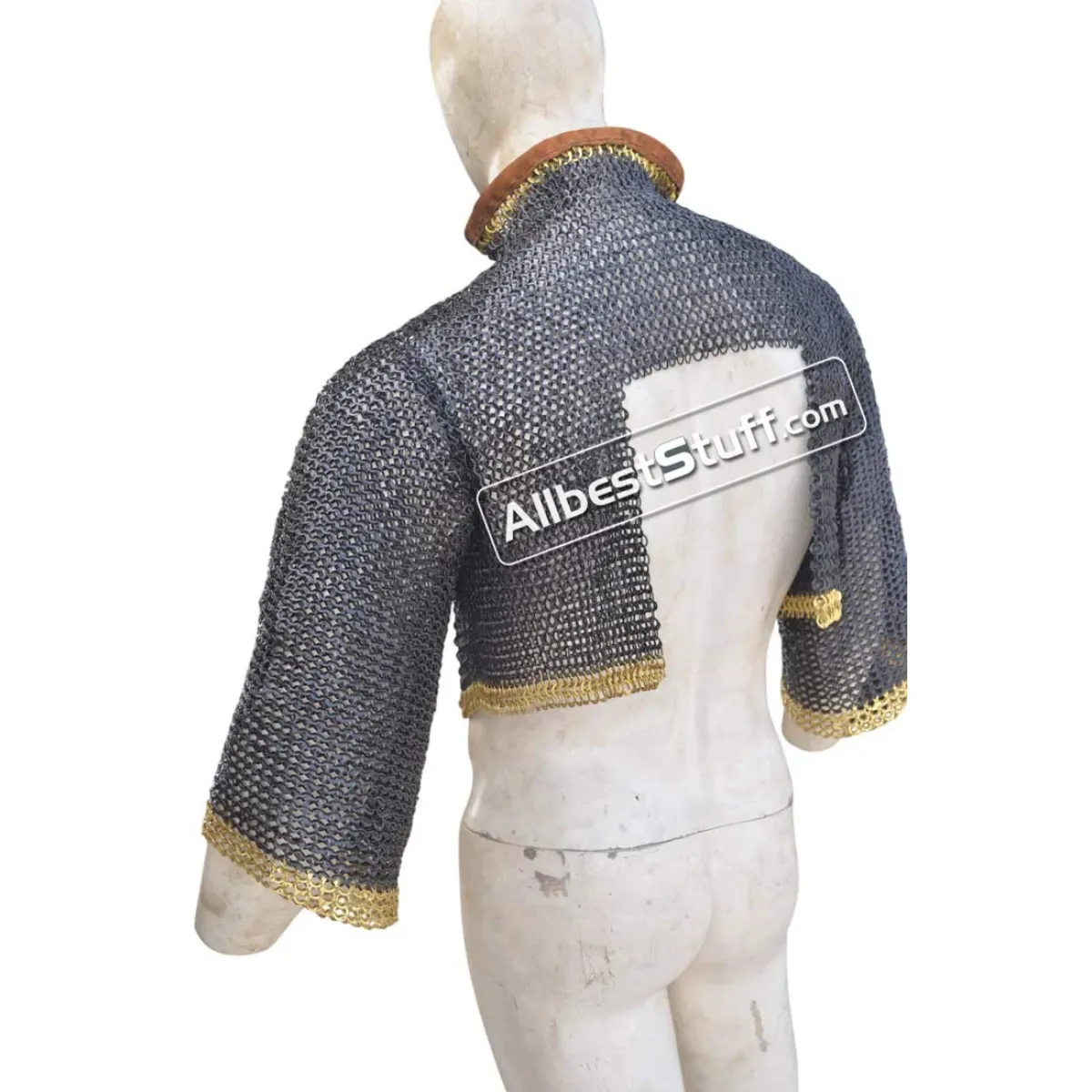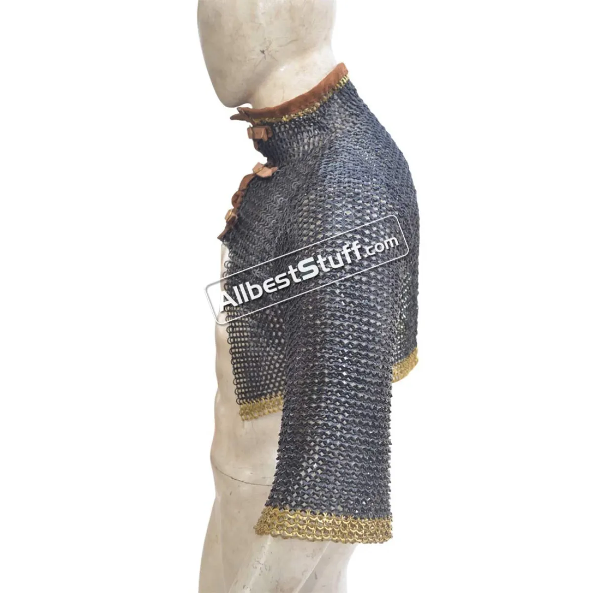 Specifications Half Body:Ring Type: 18 Gauge 8 MM Flat Dome Riveted with Alternating Solid RingMaterial: Made from Mild Steel WireChest Size: 55 inches (A comfortable fit for someone with actual chest 51-52 inches)03 Nos Leather fasteners to close the front.Neck Circumference 22 inchesNeck Collar height: 2.5 to 3 inchesSleeve Style: HalfLength of Sleeve: 12 inches measured from under the armpit area to wristSleeve Circumference at Armpit: 20 inches (Default) choose preferred circumference from additional optionsOverall Length from Shoulder: 16 inchesCut at the back will be adjusted and may vary as per the overall chest circumferenceFinish: 03 Finish to choose fromBrass Trim: choose from