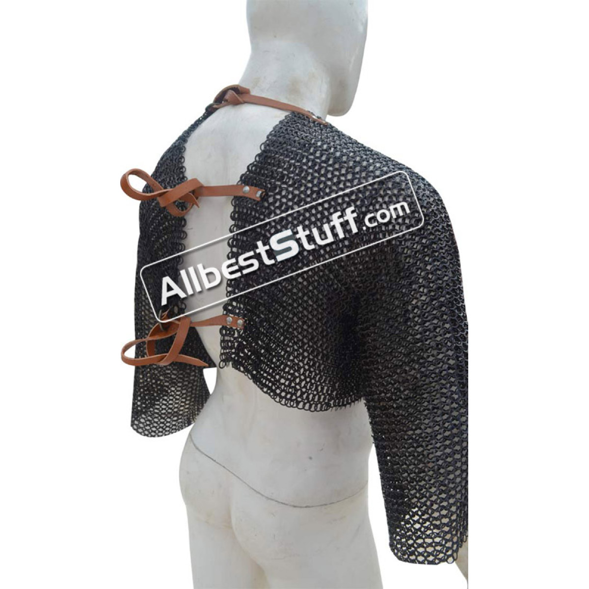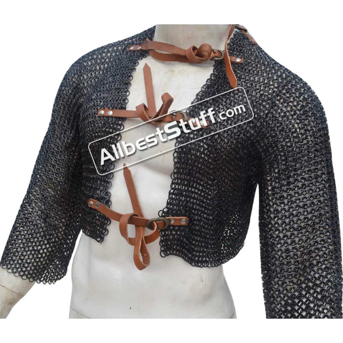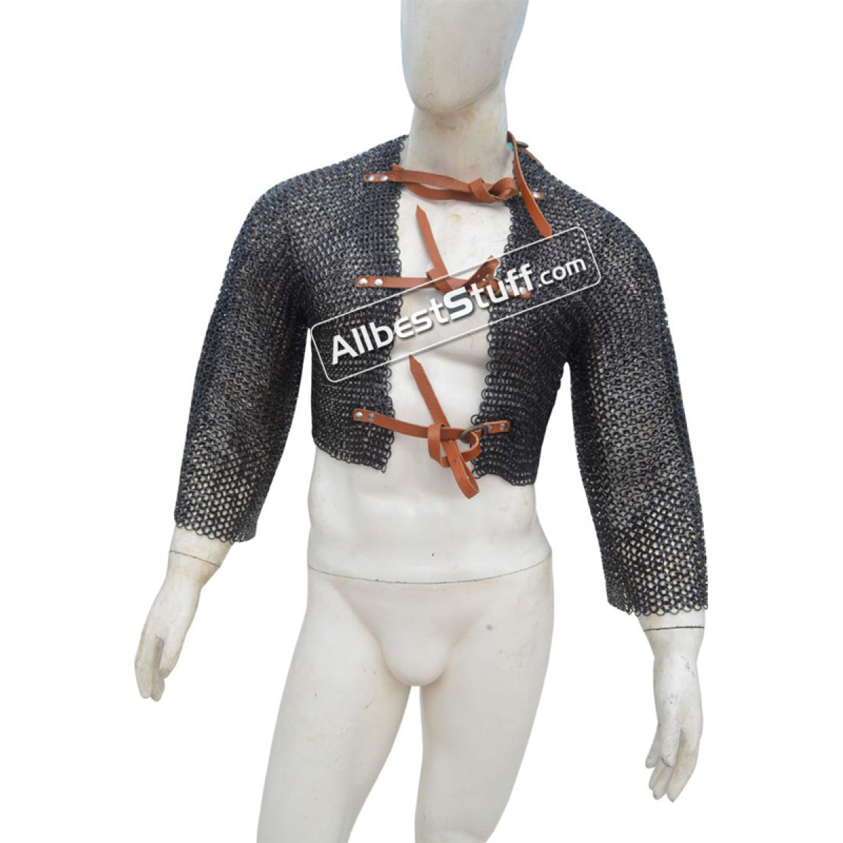 Specifications:Ring Type: 18 Gauge 9 MM Wedge Dome Riveted Ring with alternating solid ringMaterial: Made from Mild Steel WireChest Size: 35-40 inches, the 2 pieces will give approx 8-9 inches of chest and back coverage on each side03 Nos Leather fasteners to close the front.Sleeve Style: Fully ClosedLength of Sleeve: 20 inches measured from under the armpit area to wristSleeve Circumference at Armpit: 20 inches (Default) choose preferred circumference from additional optionsOverall Length from Shoulder: 16 inchesFinish: 02 Finish to choose from** Have your own measurements, let us know and we ll do a custom size for you. our email id is contact@allbeststuff.com