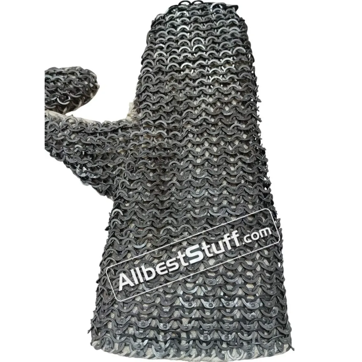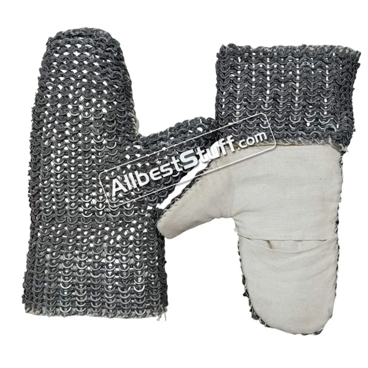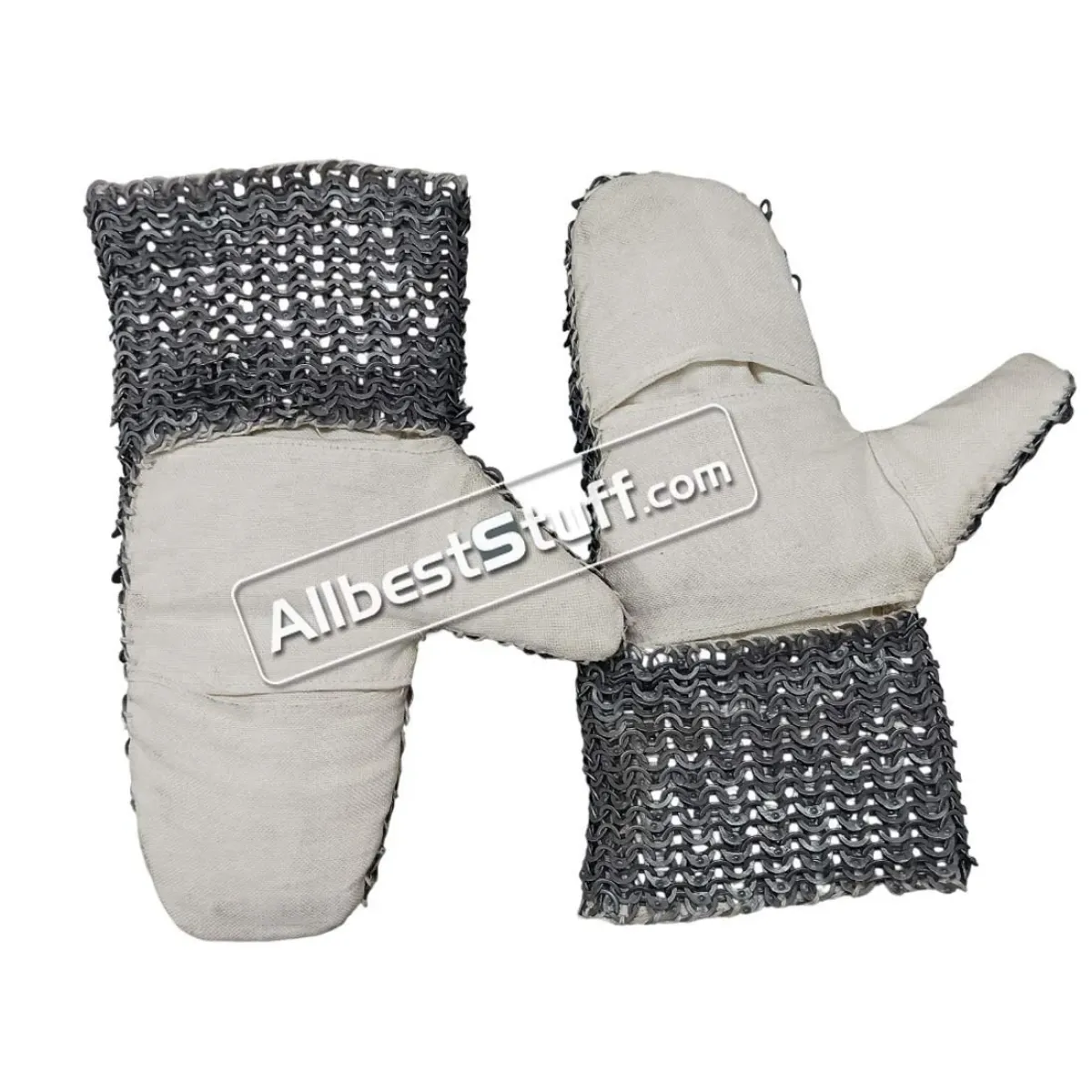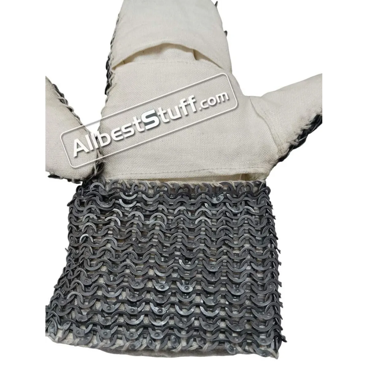 Padded Linen stitched pair of Maille mittens, a comfortable and strong choice for protection of hands in the battle field. No sweat as there is a slit to take hand out when not in combat, offers strong grip when in use, historically authentic. We are offering choice of 2 colors of high quality Linen fabric (Black & White) along with 3 choice of ring sizes in Flat Wedge Riveted with Alternating Solid Ring combination, You can also choose desired finish basis the ring type you select.