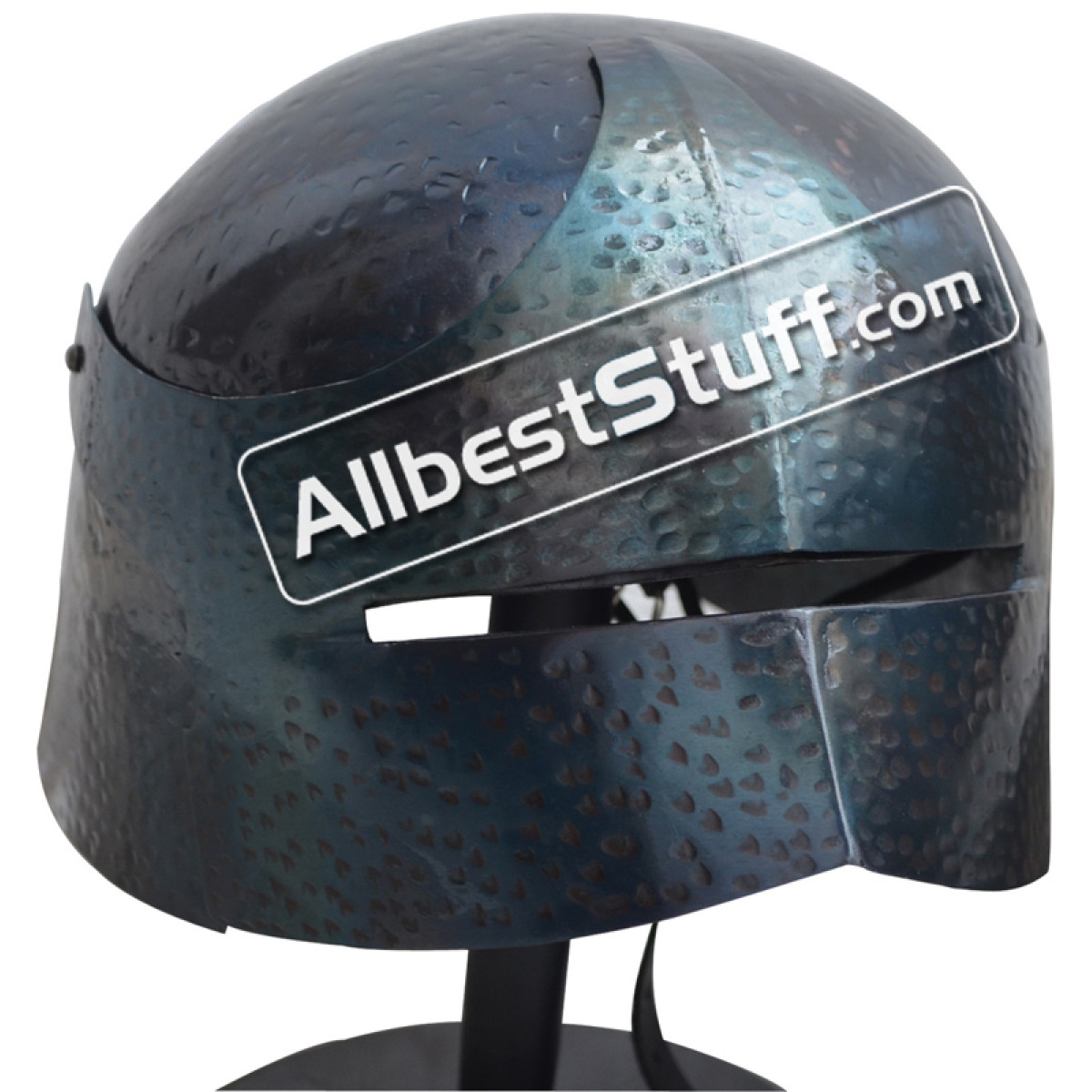 German Black Sallet Helmet High quality. Comes in 18 Gauge mild steel with leather liner & chin strap. Hammered with fire black finish. Visor can be lifted for better view. Worn by German Soldiers during war. Use a heavy inner padding inside for protection. Standard Adult Size fully wearable.