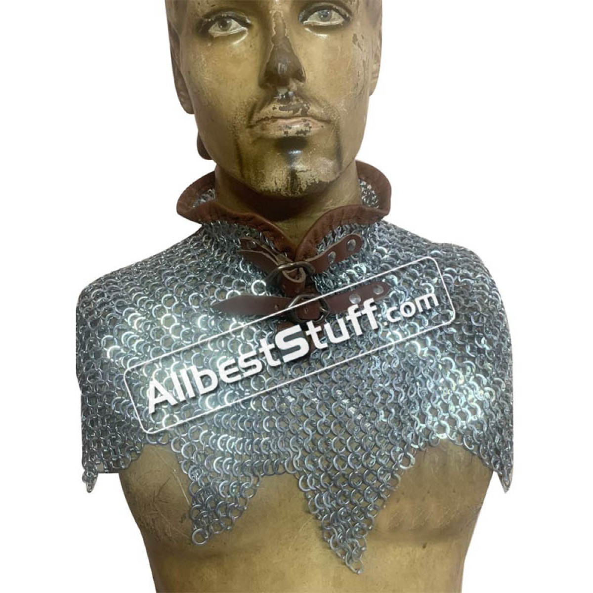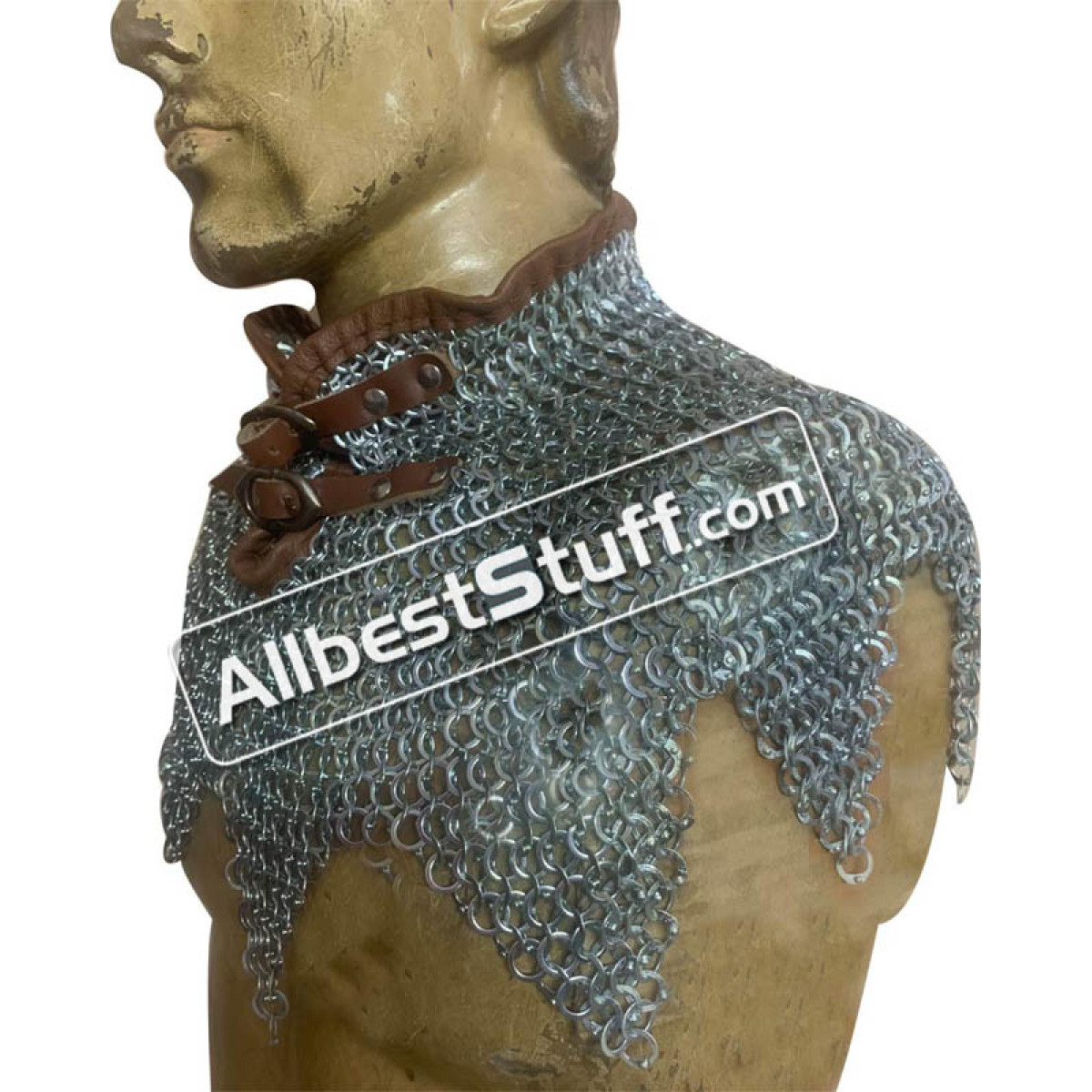 Flat Riveted with Alternating Solid Ring steel based maille collar, Flat Riveted with Alternating Solid Ring available in original oil, blackened or galvanized finish. 2 zinc buckle with leather fastener to cover the neck area. Zig Zag design at the bottom.