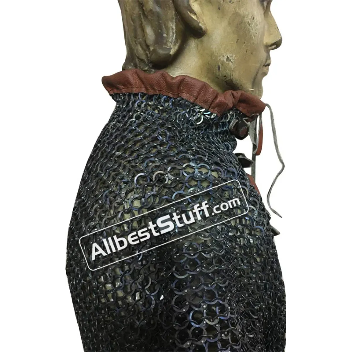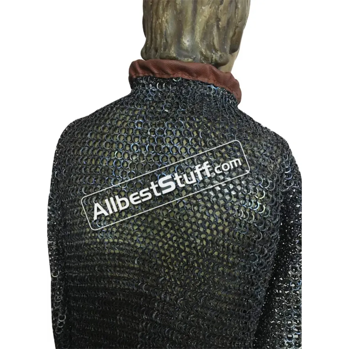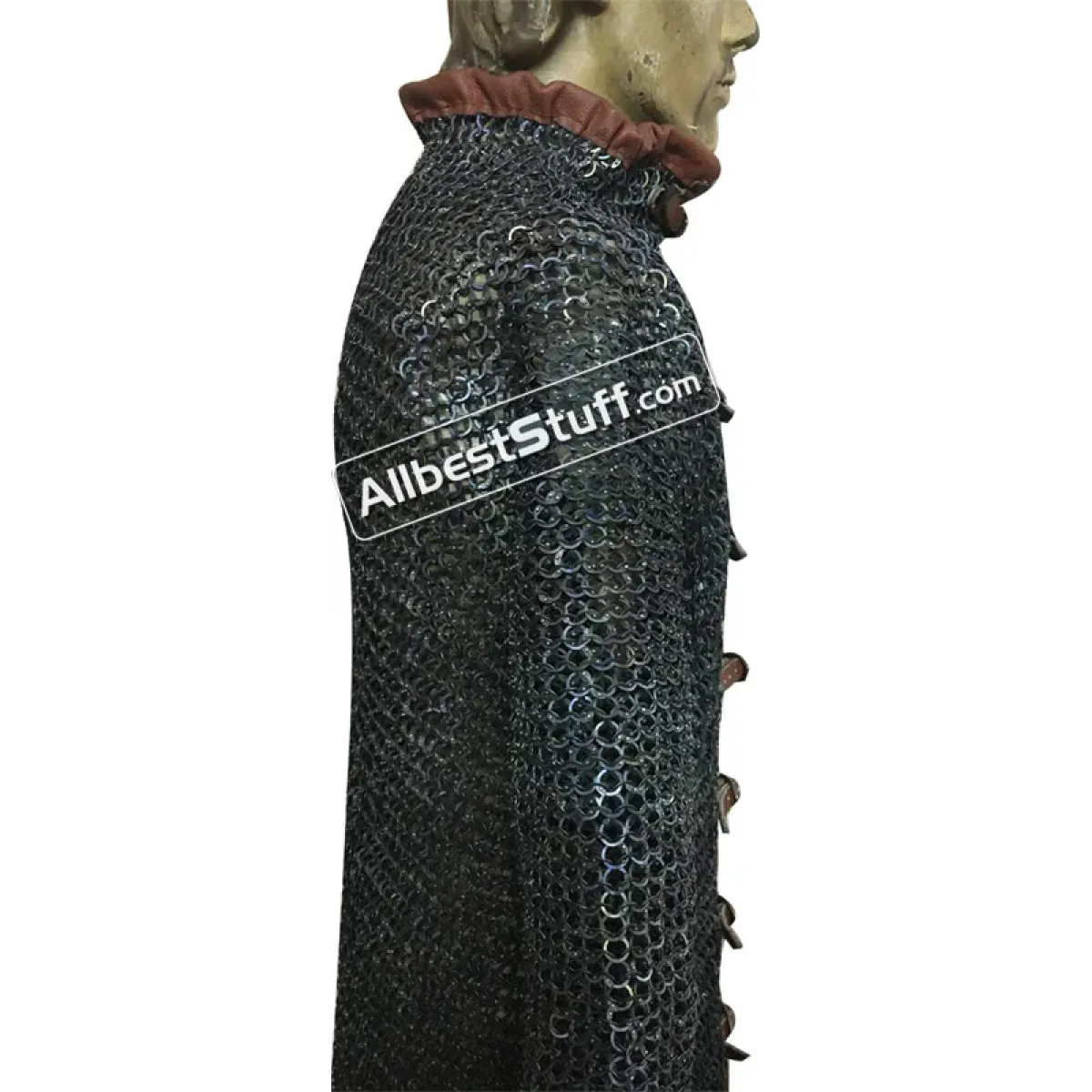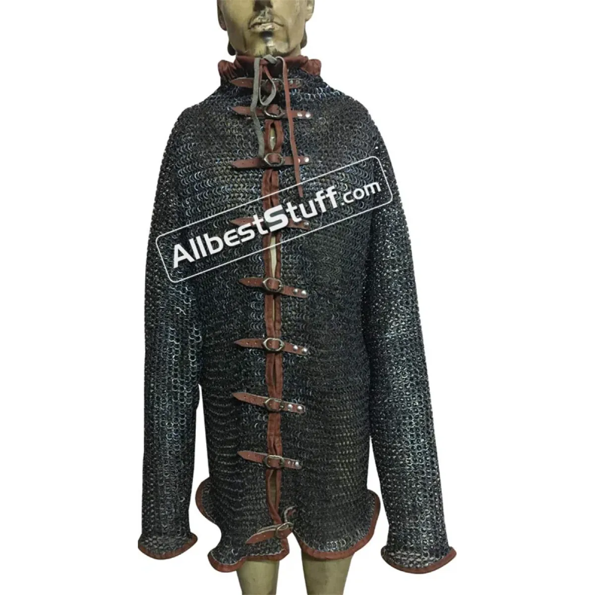 Flat dome riveted maille made from strongest material, front fastener with leather & buckle. Full sleeves. if you wish to have complete leather edges, please select additional leather option as a little extra cost.Ring Type: 18 Gauge 9 MM - All Rings are Flat, All Rings are RivetedMaterial: Made from Titanium Wire