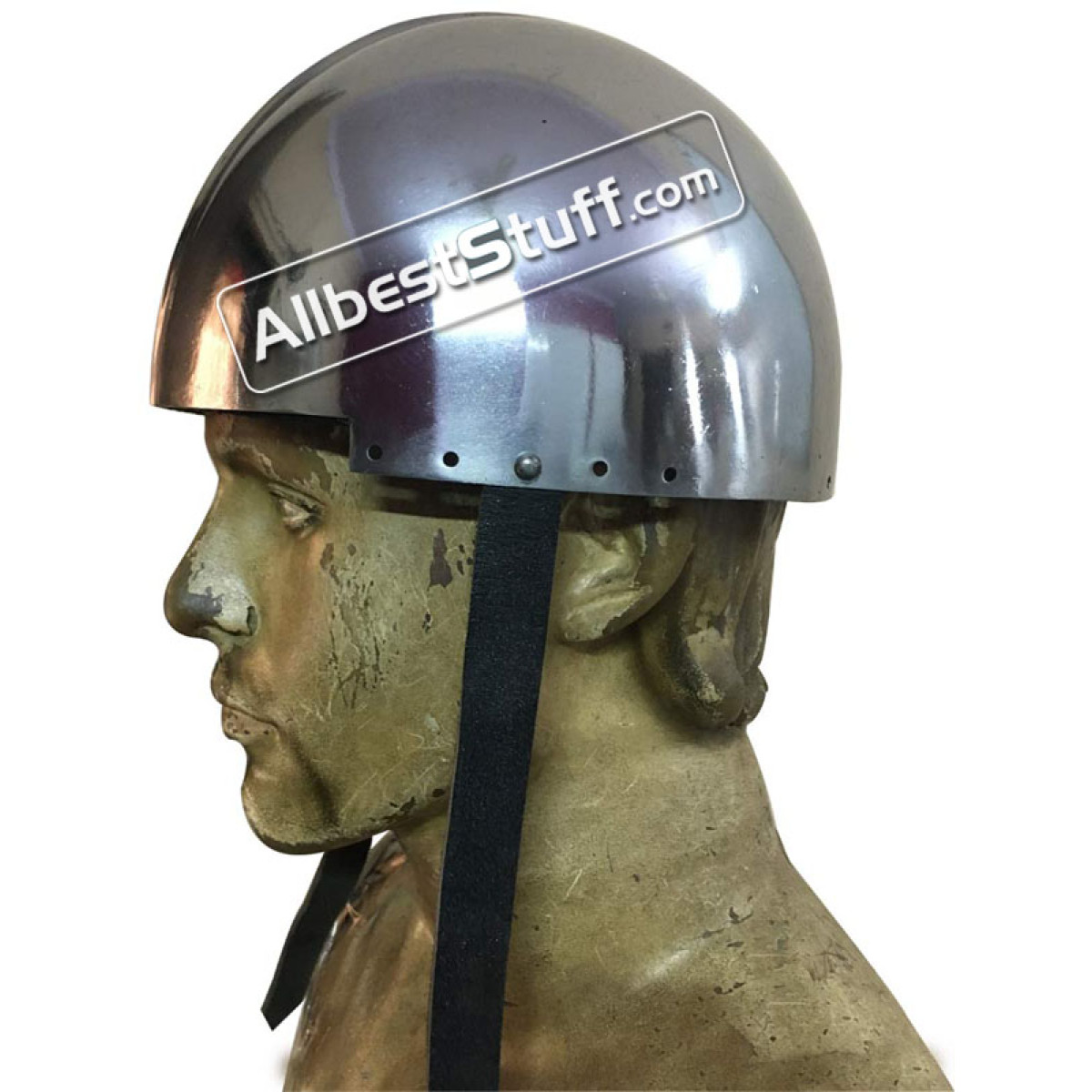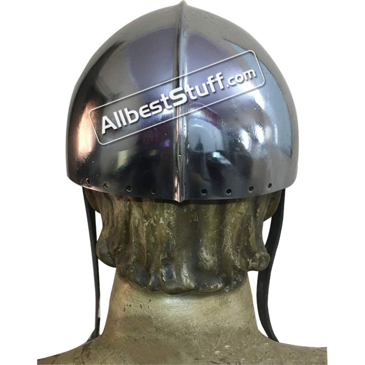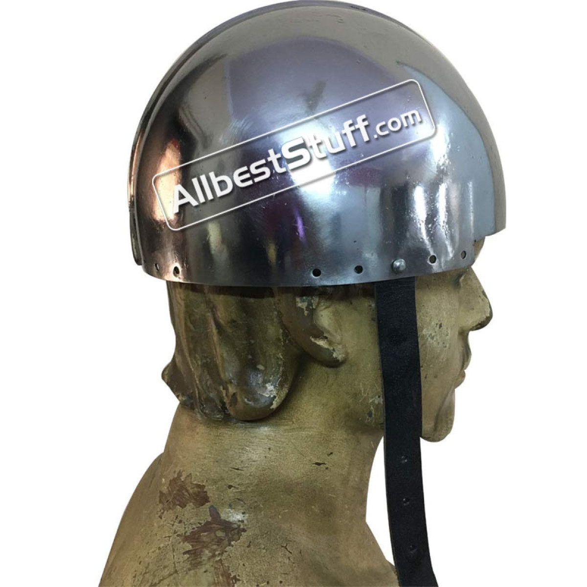 The LARP Secret Helmet is a simple helmet inspired by 12th Century Europe. and offers ample protection. The leather straps of the Secret helmet can be tightened beneath the chin to secure the helmet in place.