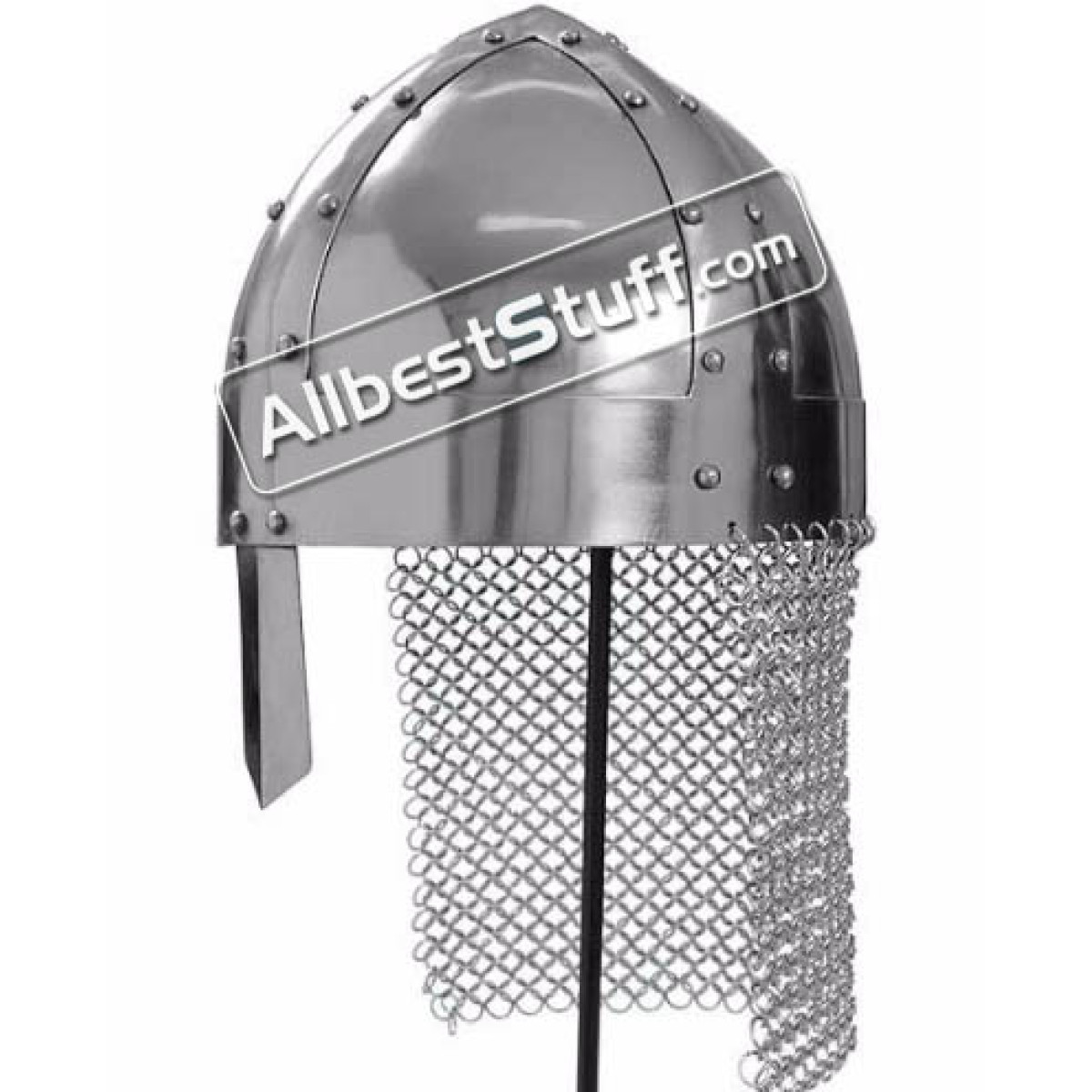 The Spangenhelm is fitted with a leather inlay. It has a 4 inches nasal plate and Butted Steel chain mail aventail, The helm offers significant protection and is more comfortable and lightweight than a full helm.The chainmail aventail protects the ears and neck while allowing easy head movement from side to side.