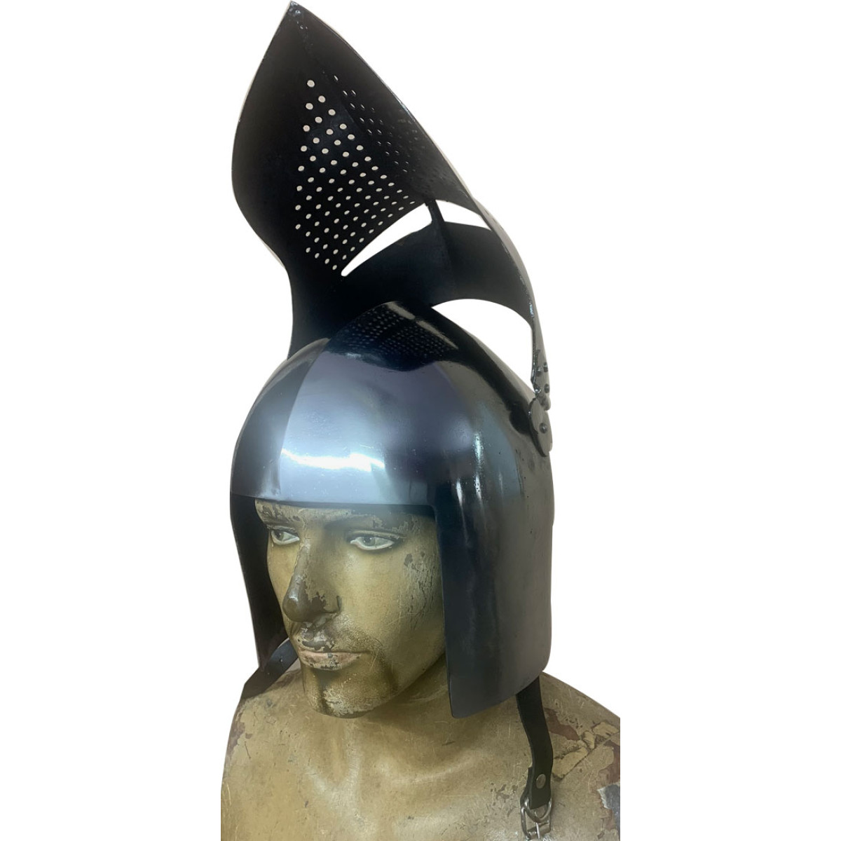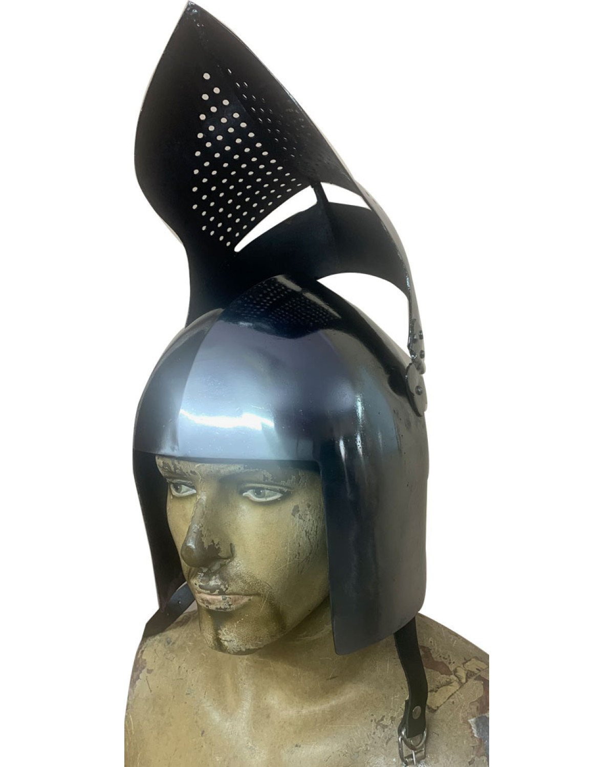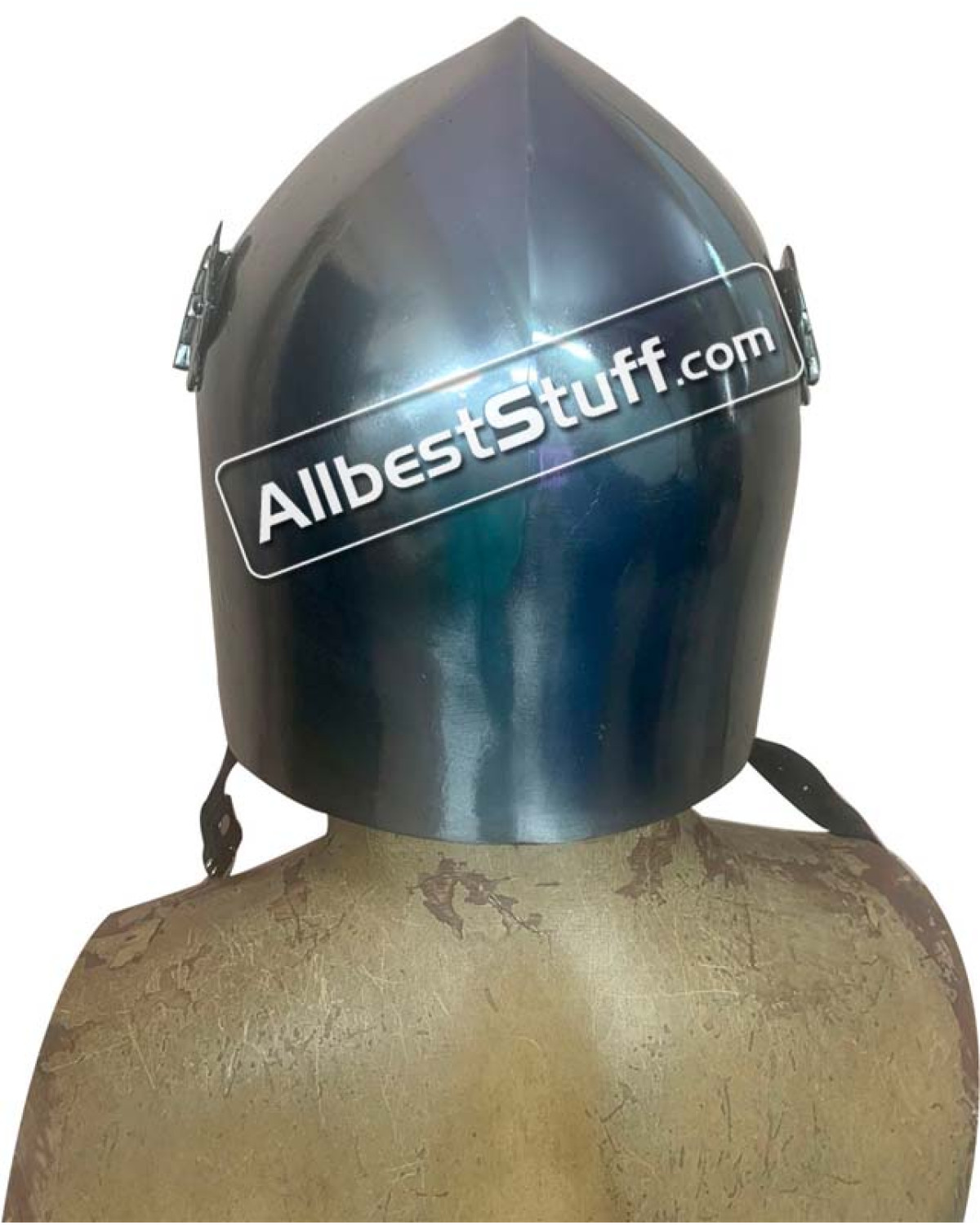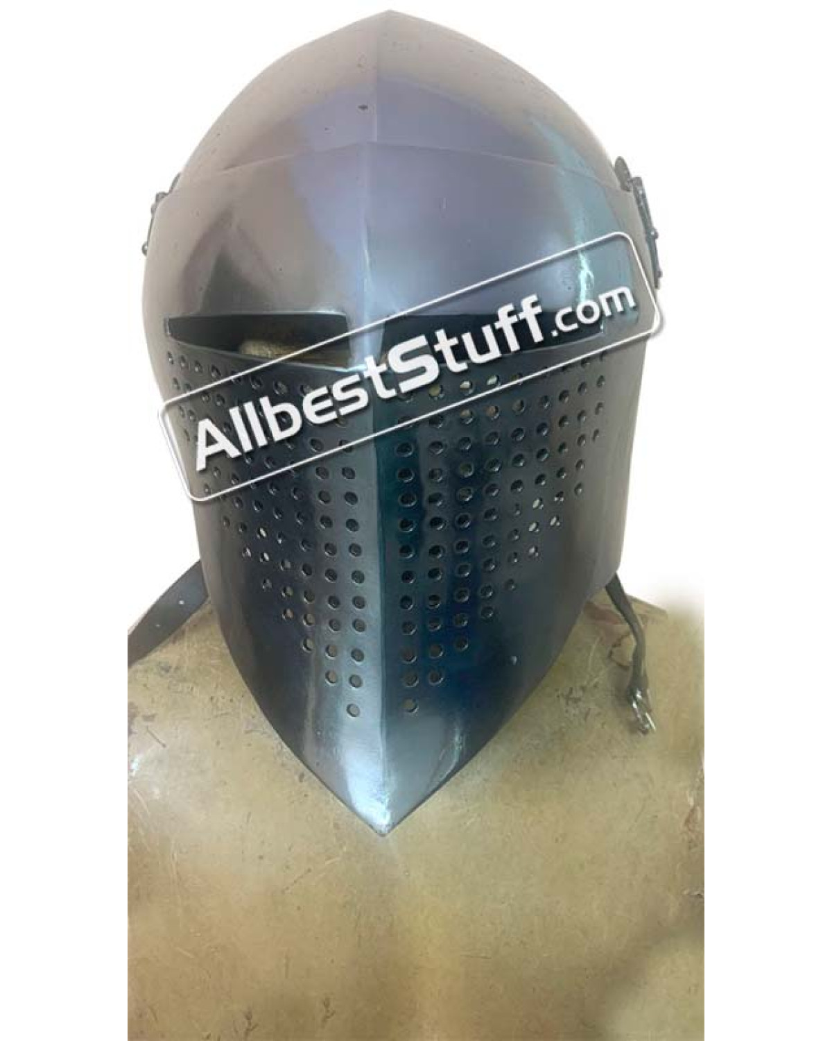 Medieval Visored Helmet made from 14 Gauge Steel. It has been designed to protect the head and face. The leather straps of the Medieval Visored Helmet .This helmet is made of 14 Gauge mild steel and top-grain leather straps and fittings.